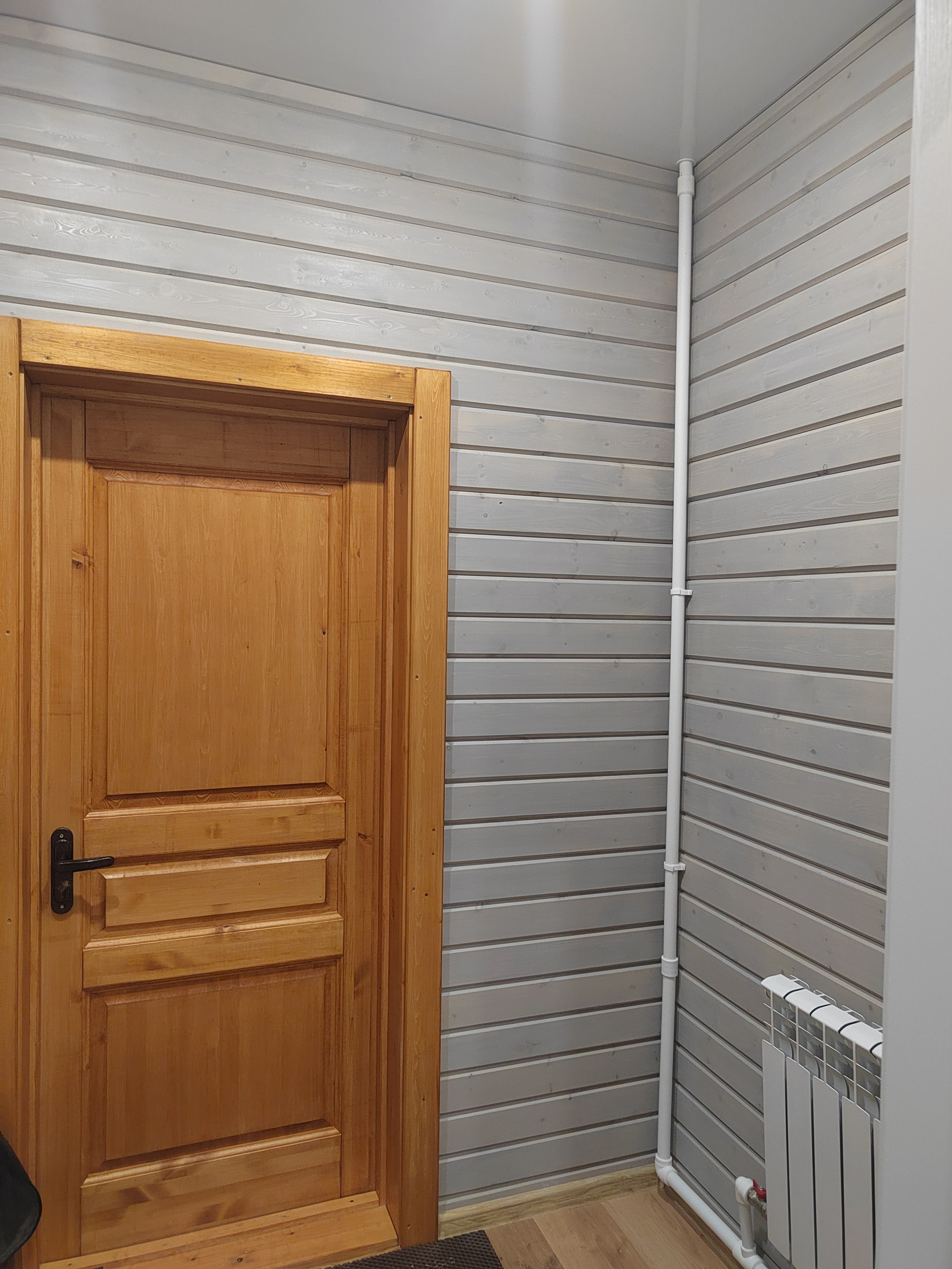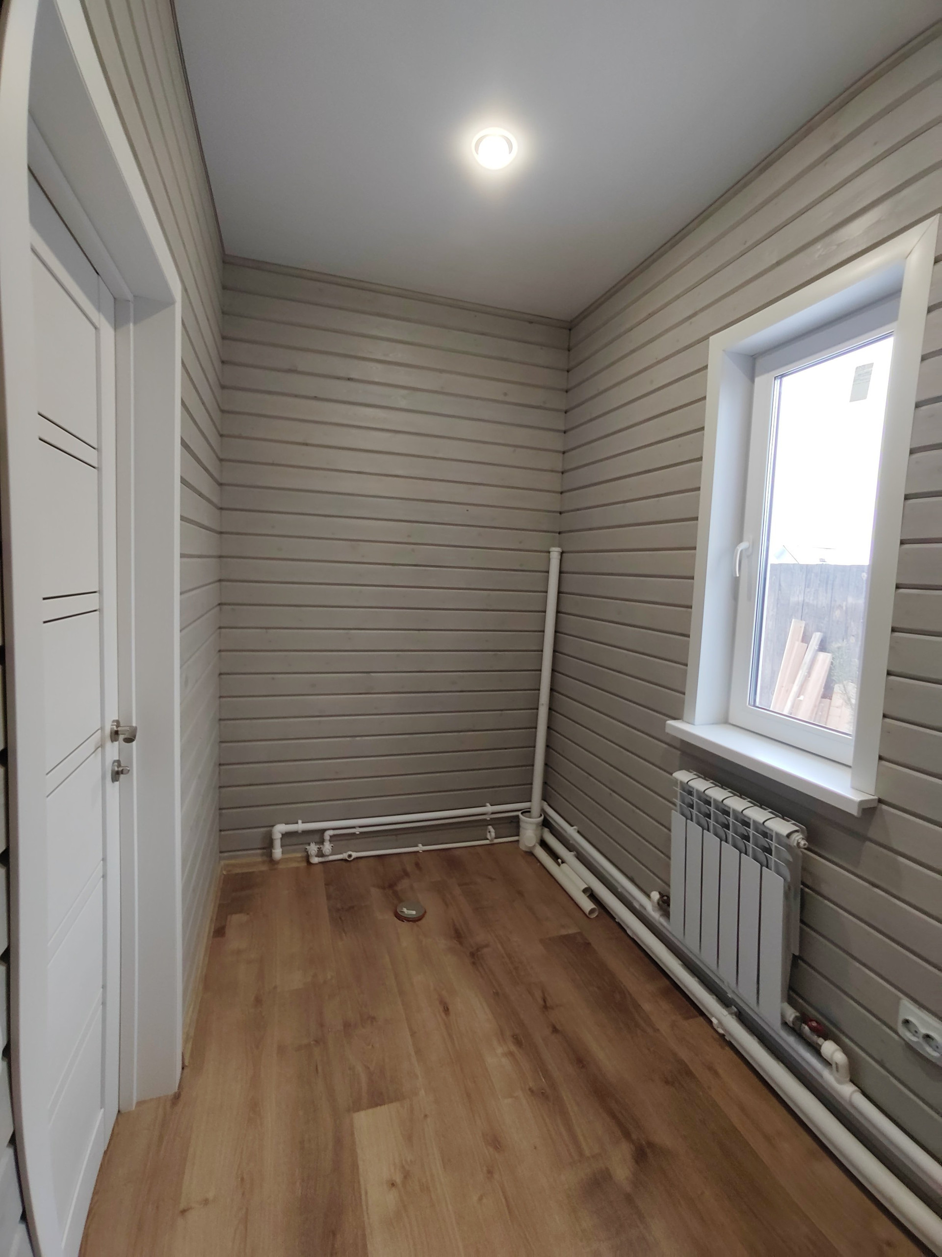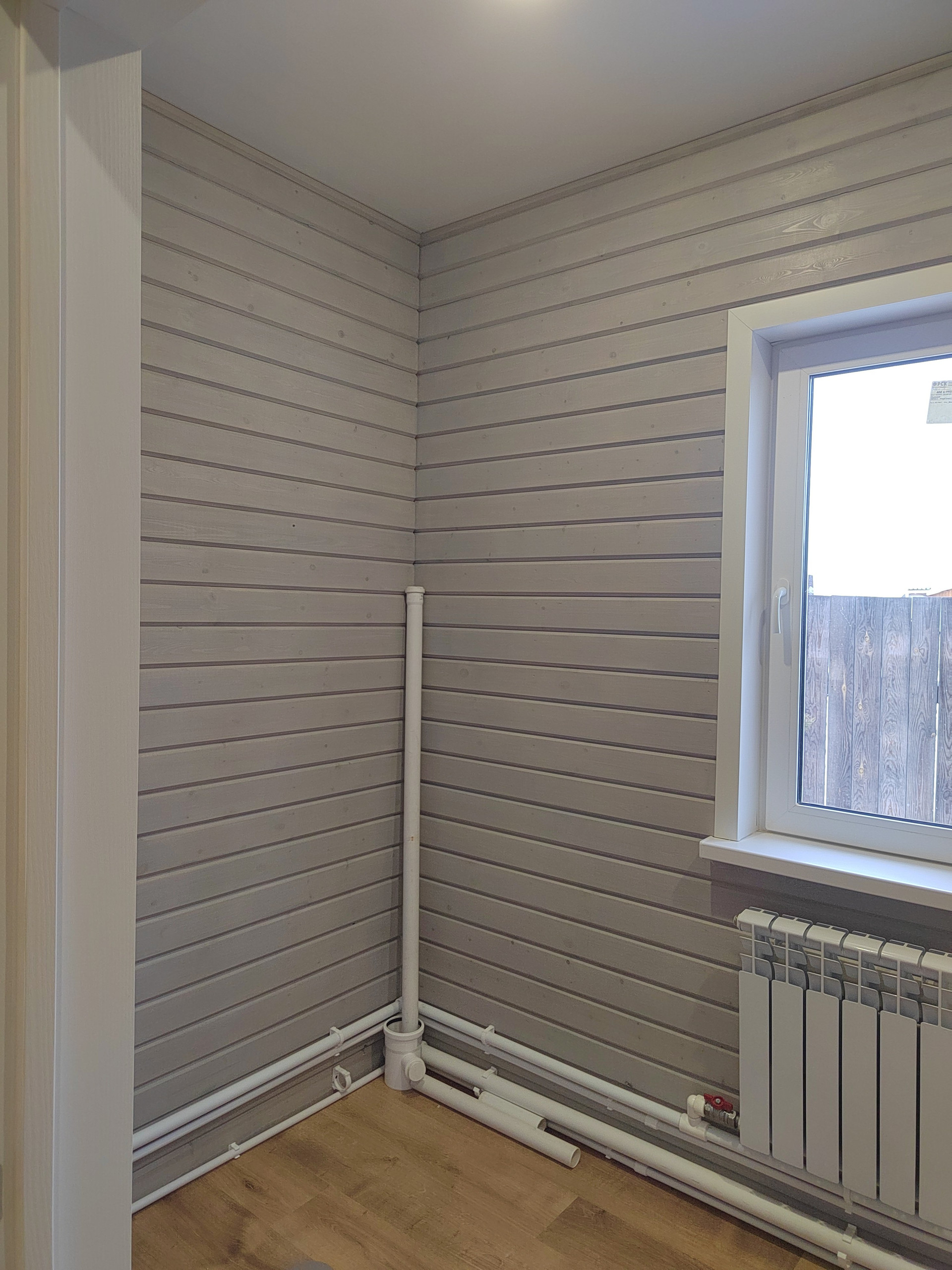 Ванная комната , туалет в доме. Стены-дерево с имитацией бруса,пол-ламинат,потолок натяжной.
