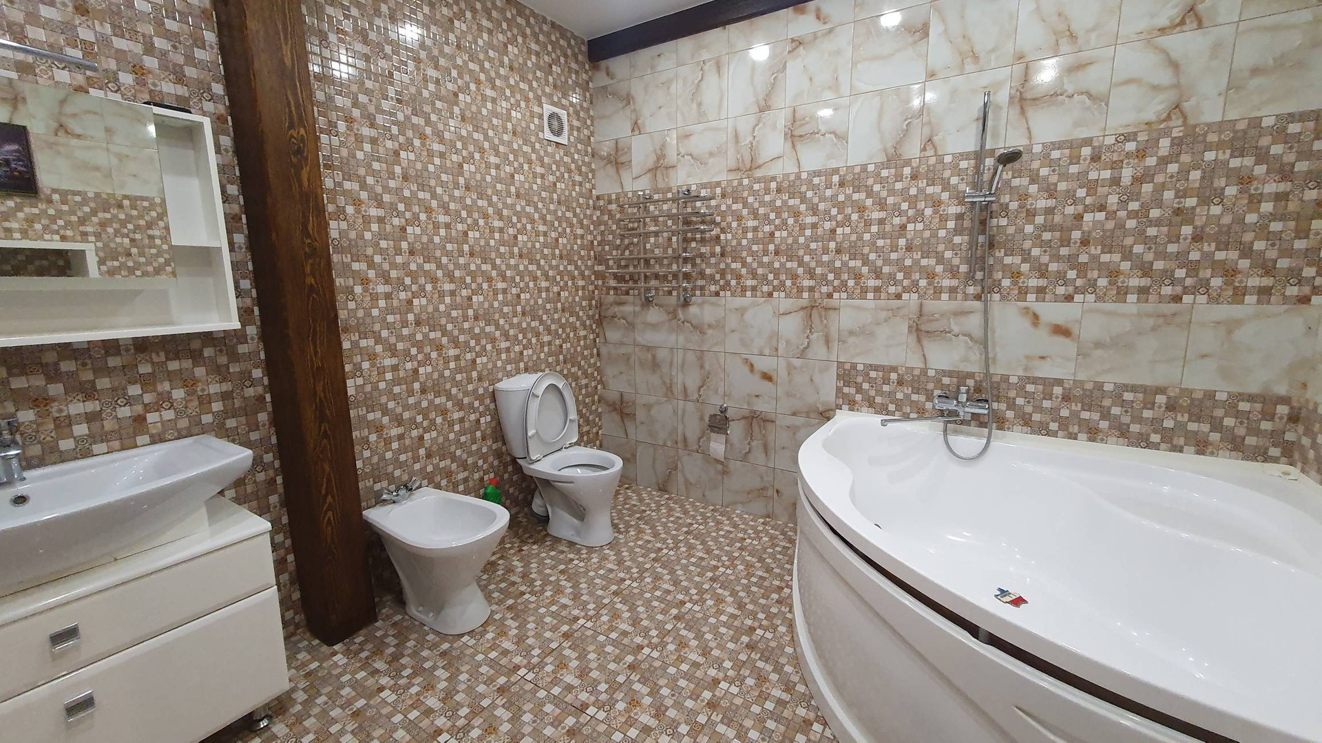 Отопление эл.котел 15 Квт., тёплый водяной пол в прихожей,туалете и ванной, чугунные радиаторы в комнатах,розлив - медь.