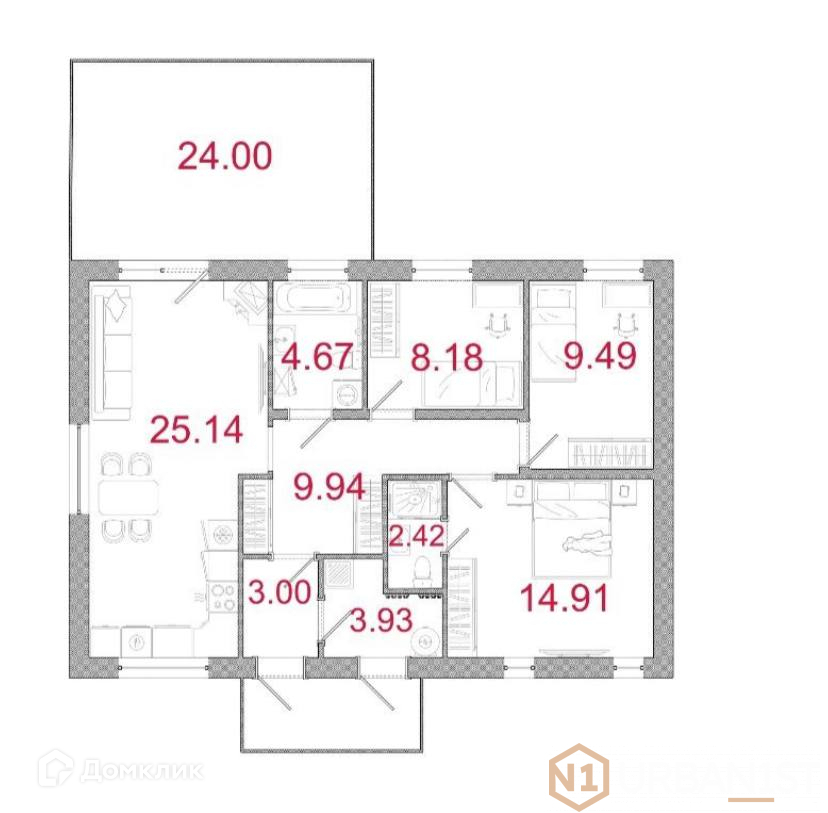 В доме 3 спальни, в том числе одна мастер-спальня со своим санузлом, просторная кухня-гостиная, большая терраса 24 кв.м. и мансарда 45,8 кв.м. Высокие потолки в комнатах - 3м., в гостиной - 5,5 м. ("второй свет").