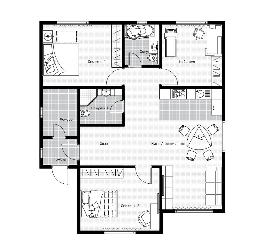 Практичный одноэтажный дом в классическом стиле общей площадью 110м2. Преимущество данного проекта – это функциональность. Дом условно разделен на две части с помощью небольшого холла, отделяющий просторную гостиную с кухней от спальной зоны, состоящую из трех универсальных комнат, которые можно использовать в качестве спальни, детской или кабинета. Также в доме имеется отдельная гардеробная, два санузла и техническая  комната, в которой можно расположить котельное оборудование или использовать в качестве кладовой.