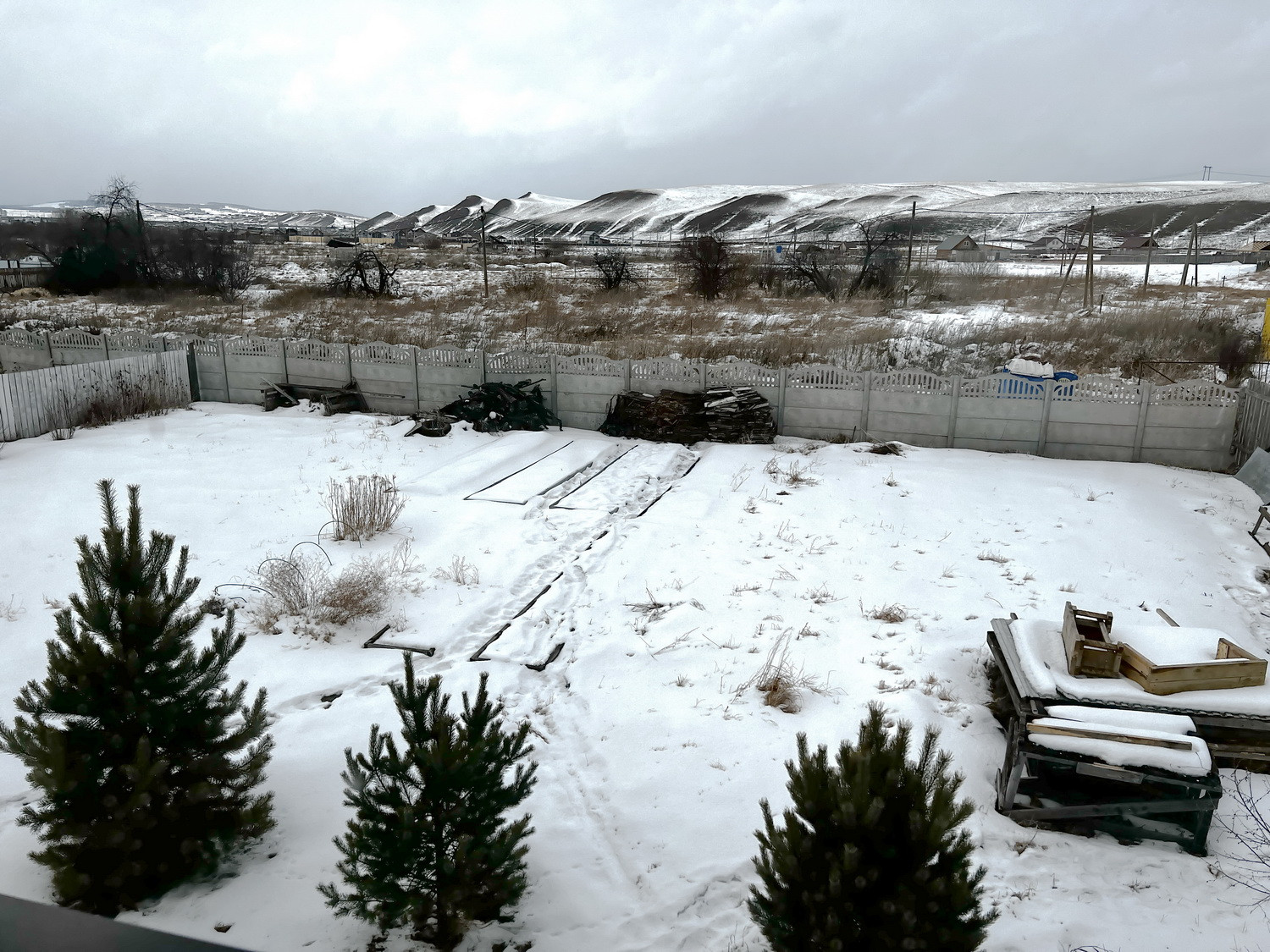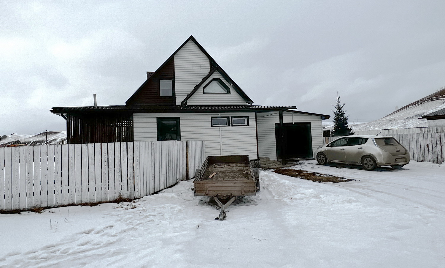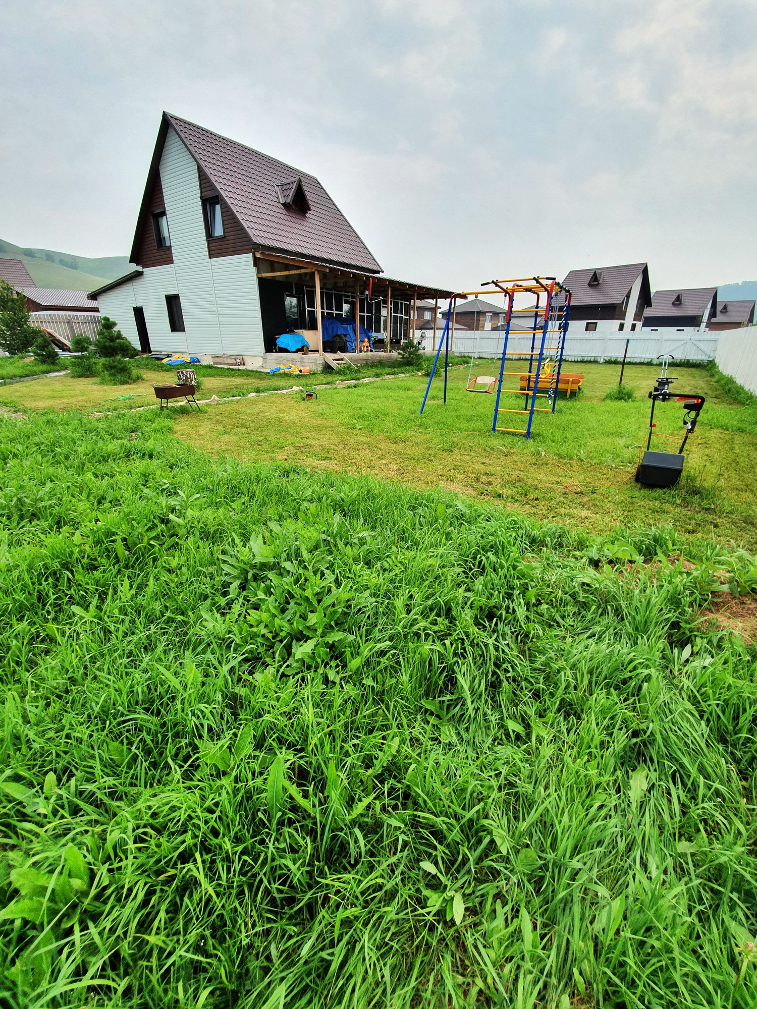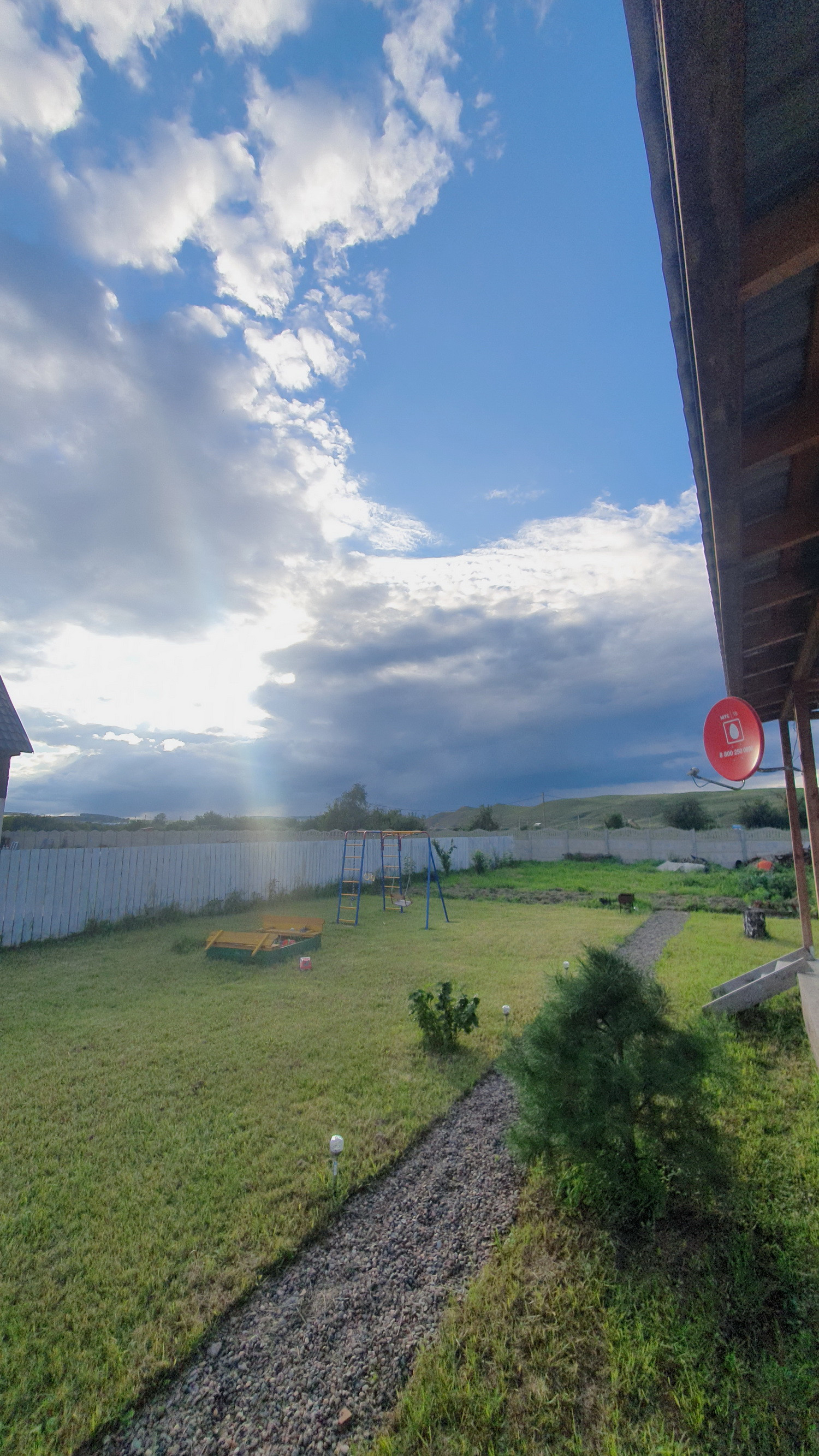 Забор из дерева. На участке детская игровая горка и песочница.