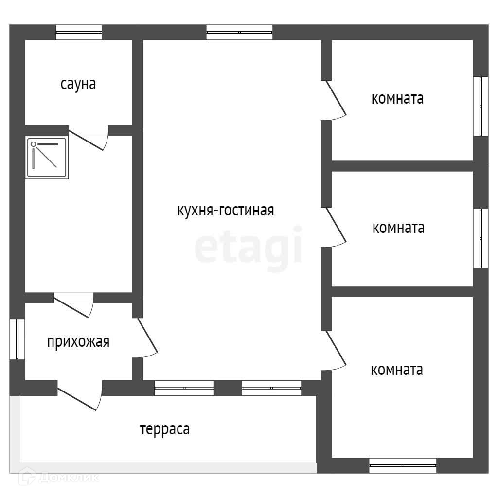 По проекту, планировка дома подразумевает наличие 3 жилых комнат, просторной кухни-гостиной, совмещённого сан. узла, помещения для сауны, прихожей и большой террасы.