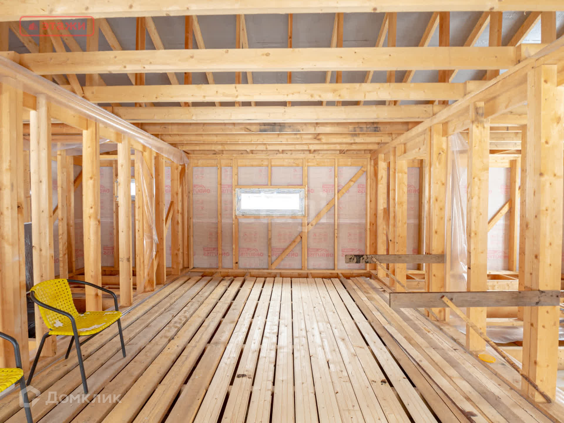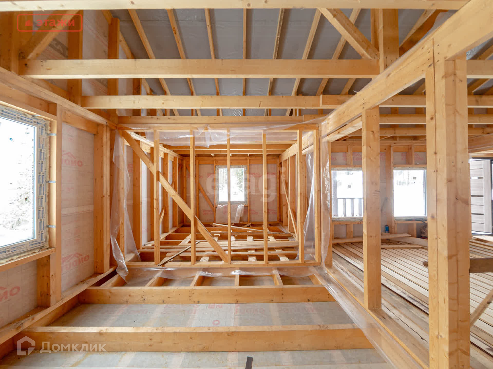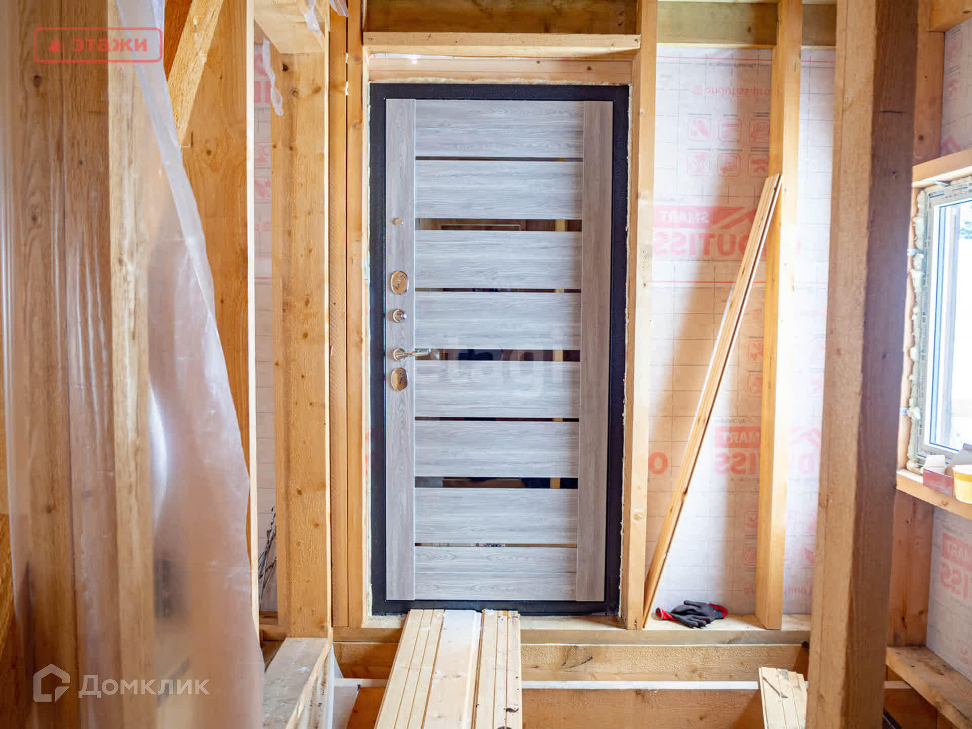 Внутри дома произведено разделение жилых помещений, а также произведена обшивка пароизоляцией. Везде установлены стеклопакеты, входная дверь с терморазрывом.
