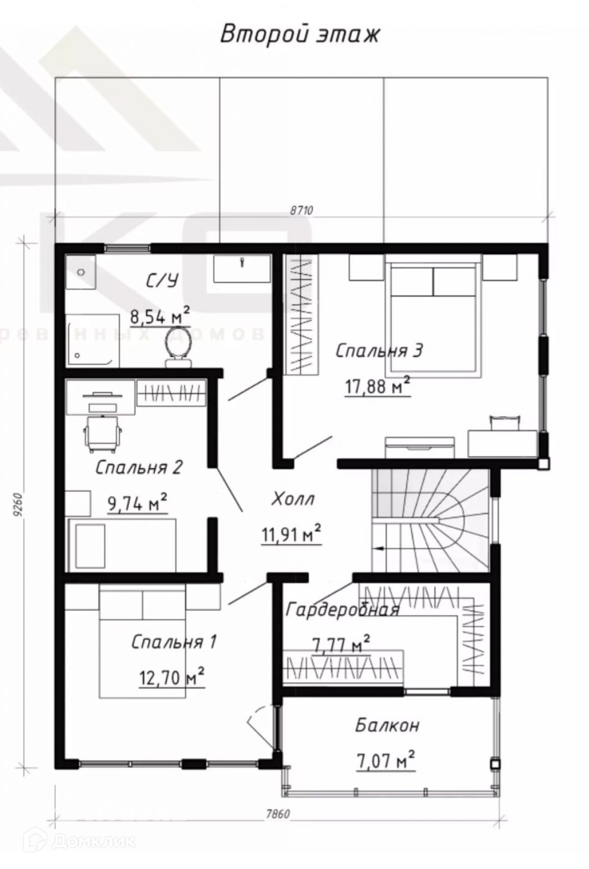 На втором этаже просторный коридор, три спальни, совмещенный санузел с душевой, гардеробная. Из одной спальни выход на большой балкон.