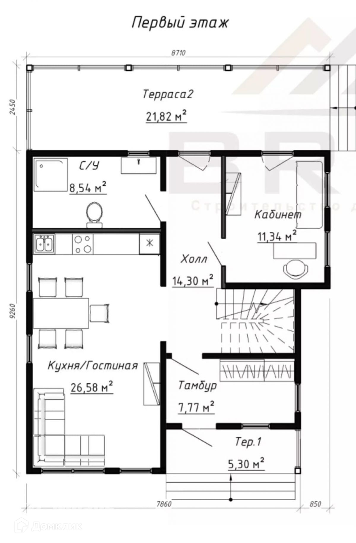 На первом этаже свободная кухня-гостиная, одна спальня (можно сделать кабинет или комнату для гостей), совмещенный санузел с душевой, душевая, бойлерная. С торцевой части дома выход на просторную, уютную террасу.