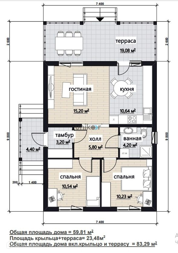 Материал: Теплоблок толщиной 400 мм, плотность D400