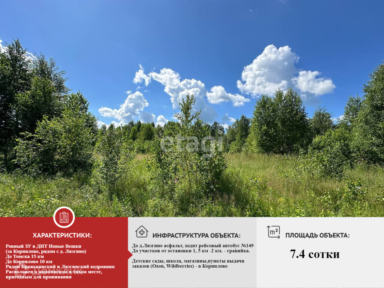 Участок ровный. Расположен в красивом и живописном и тихом месте, пригодным для проживания. Рядом с д. Лязгино, за Корнилово. до Томска 15 км.