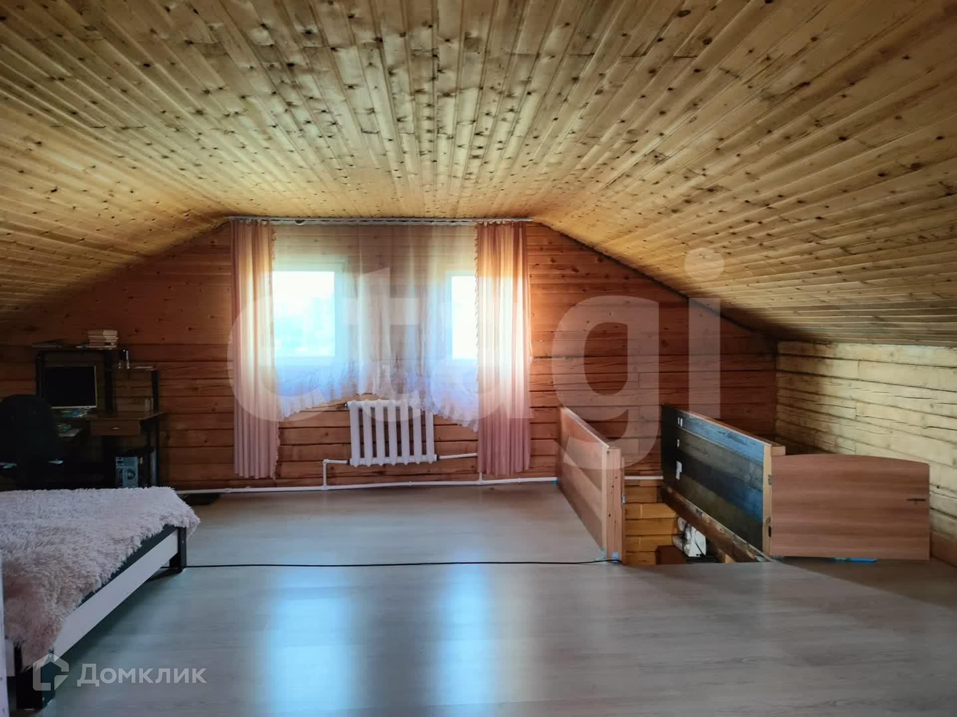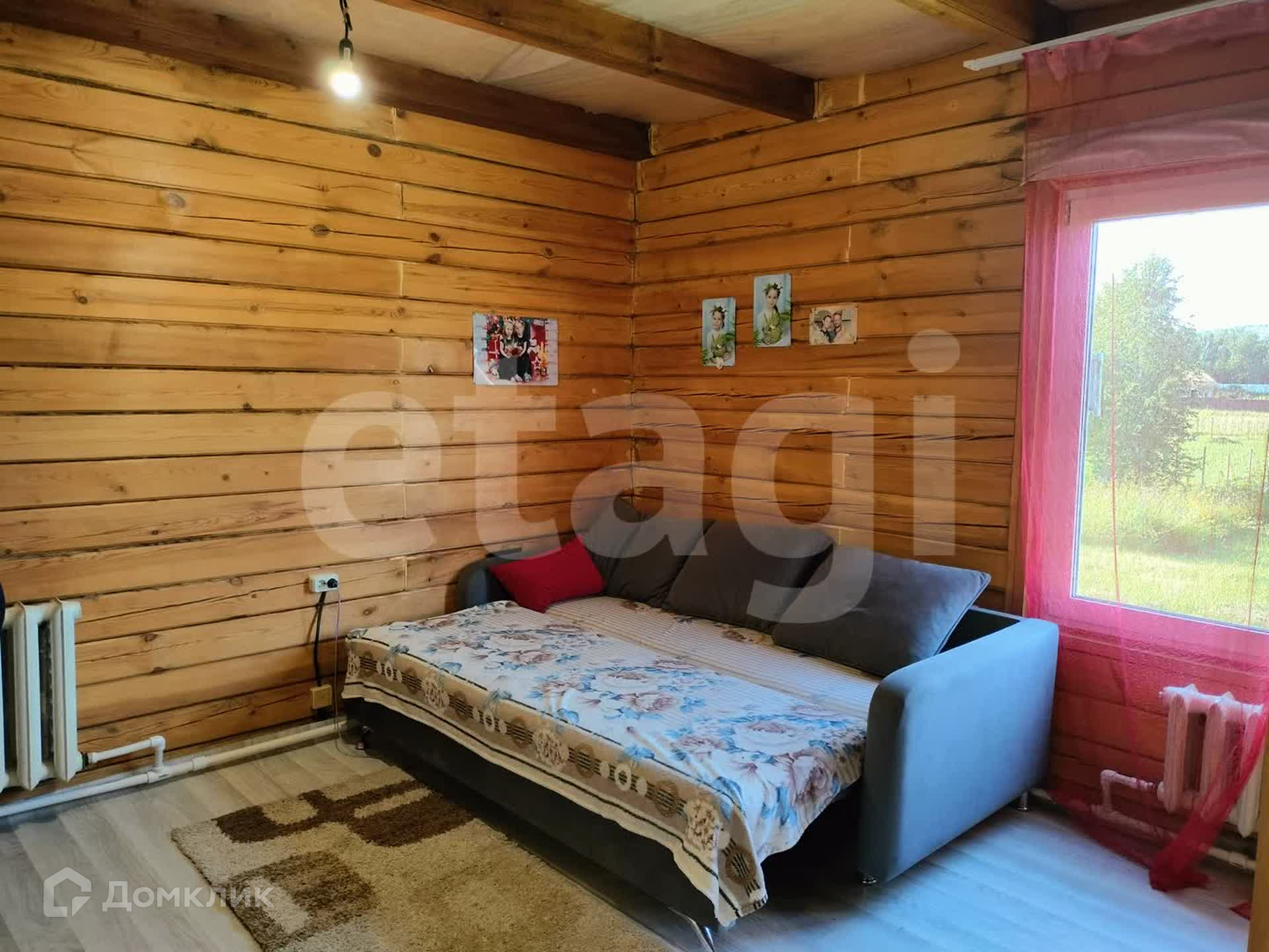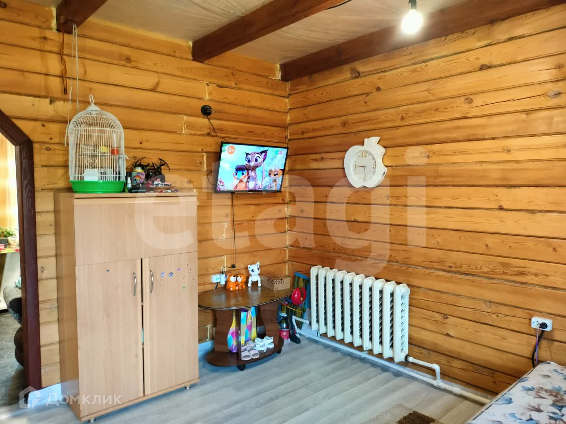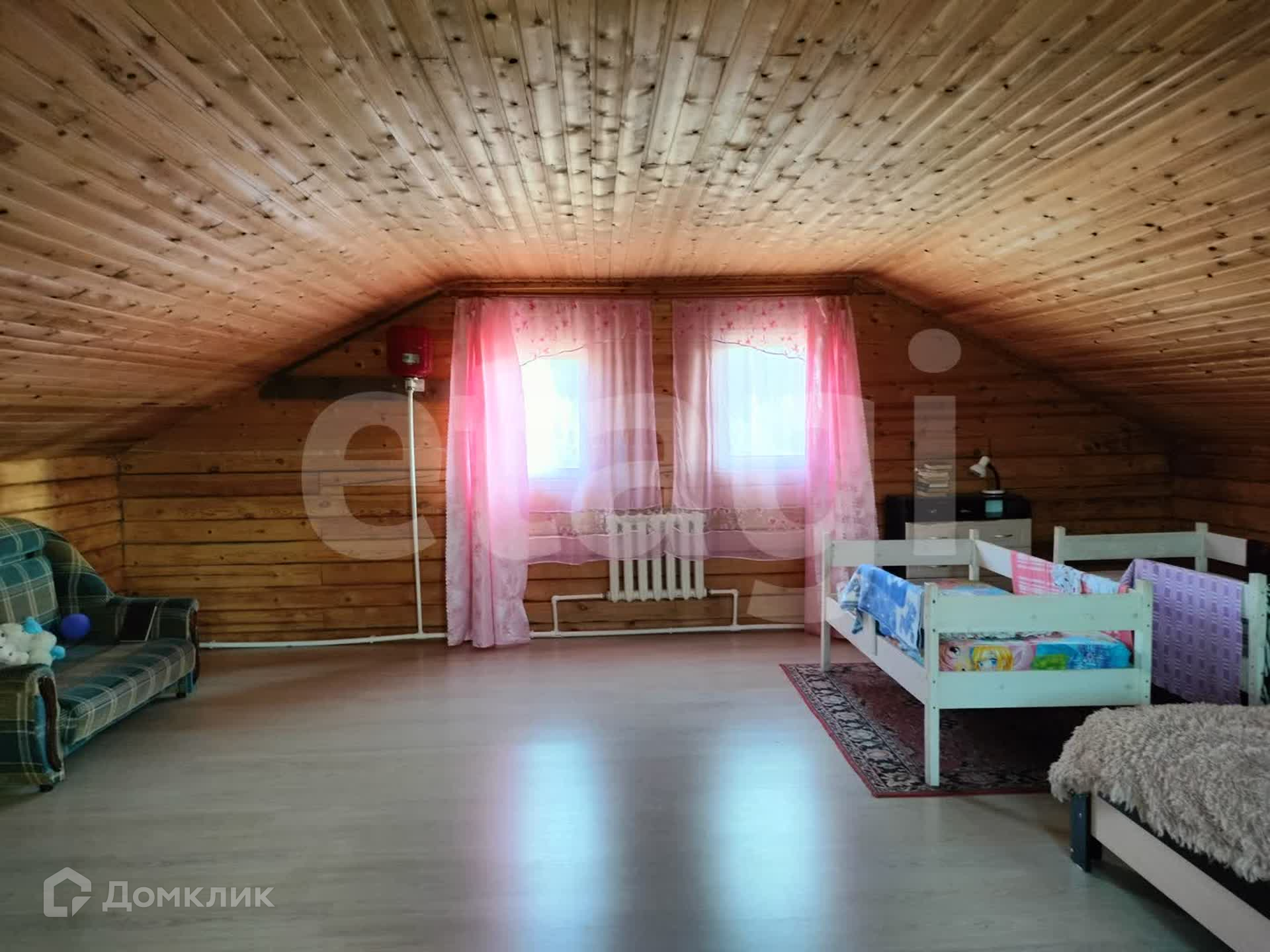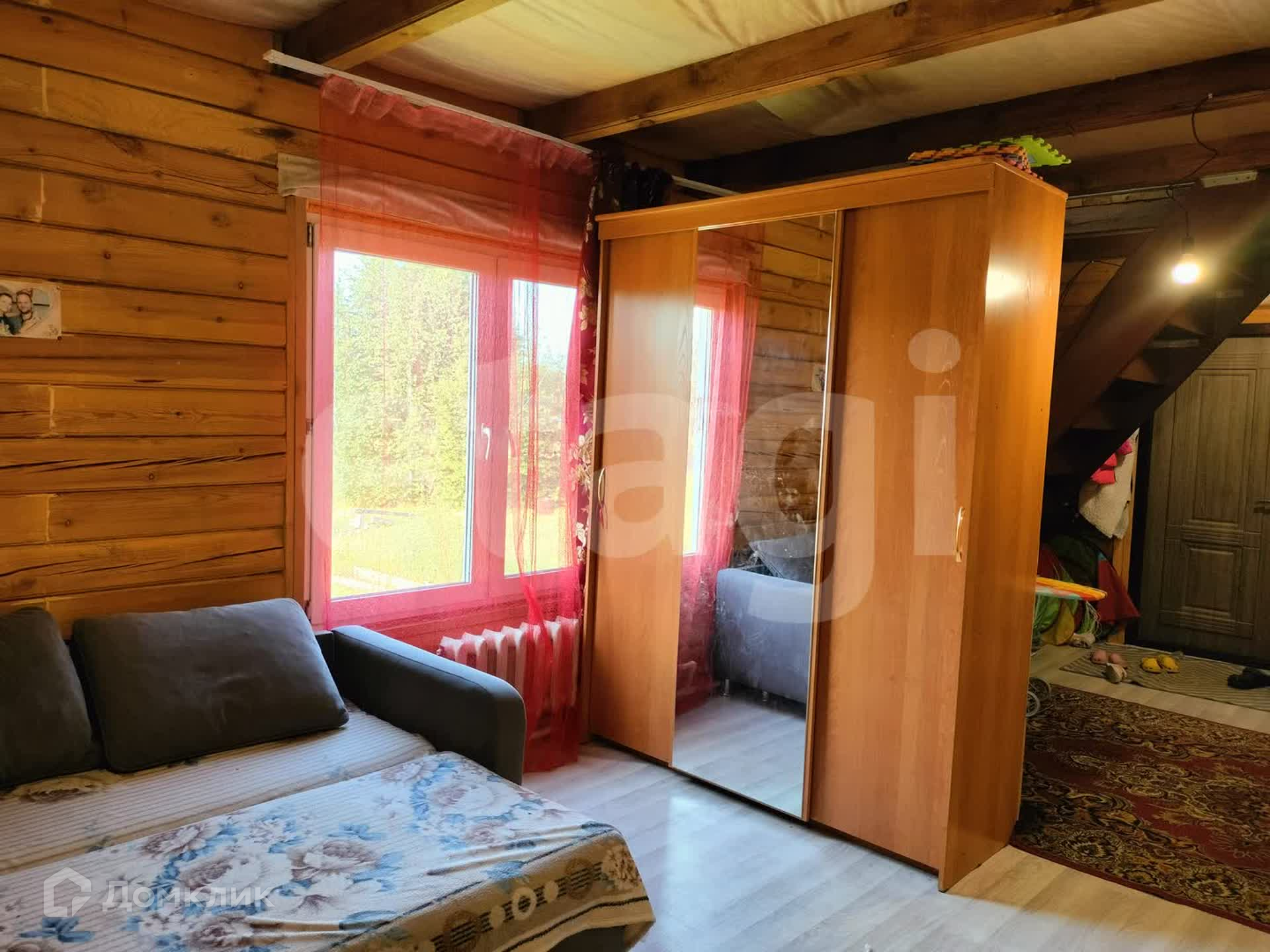 Дом из бруса, снаружи обшит сайдингом, утеплен. Внутри отделка под дерево. Потолки натяжные, везде линолеум, окна ПВХ. Санузел совмещен, есть водонагреватель. Вода - скважина (14 м), отопление - твердотопливный котел, канализация - септик.