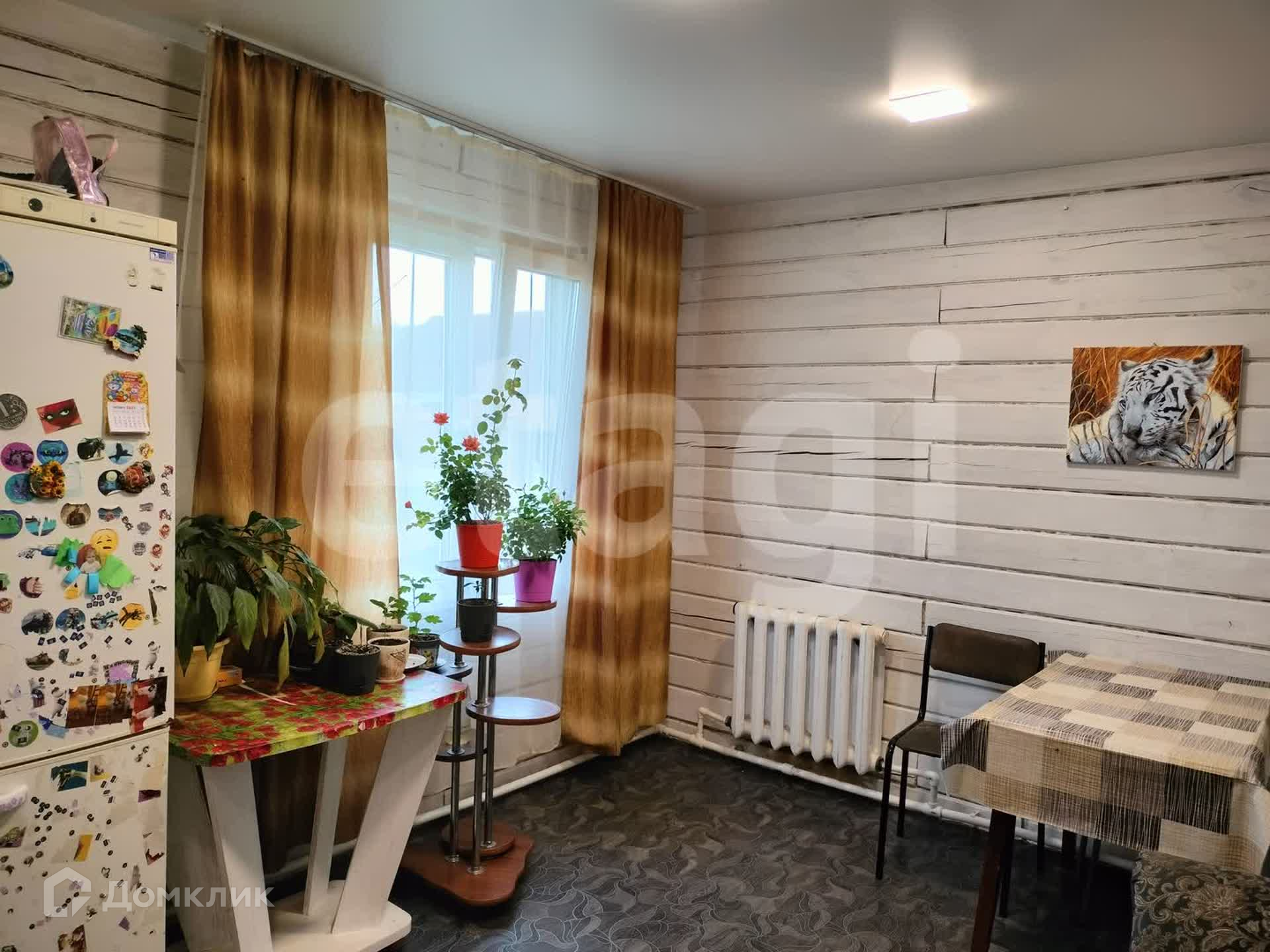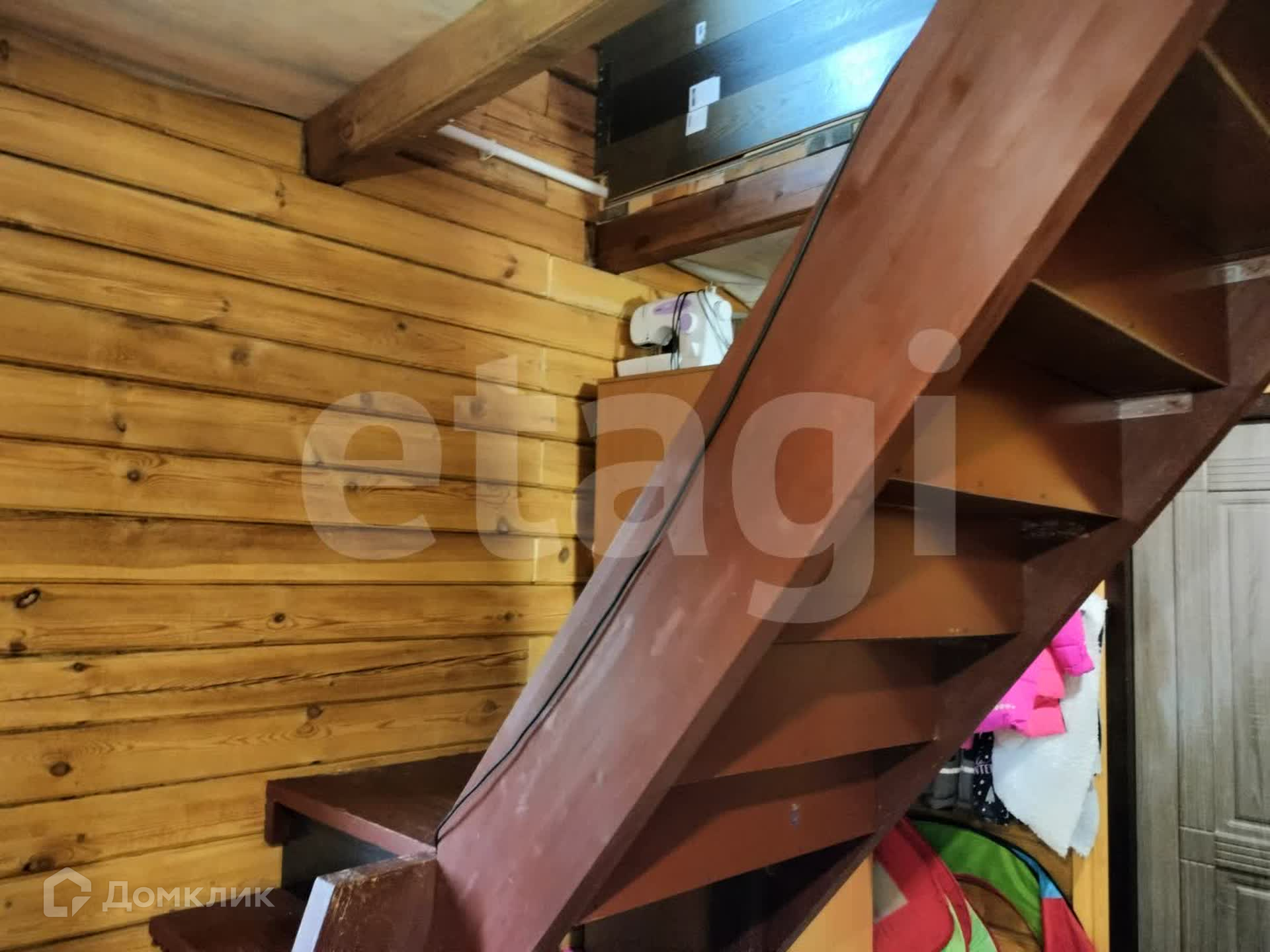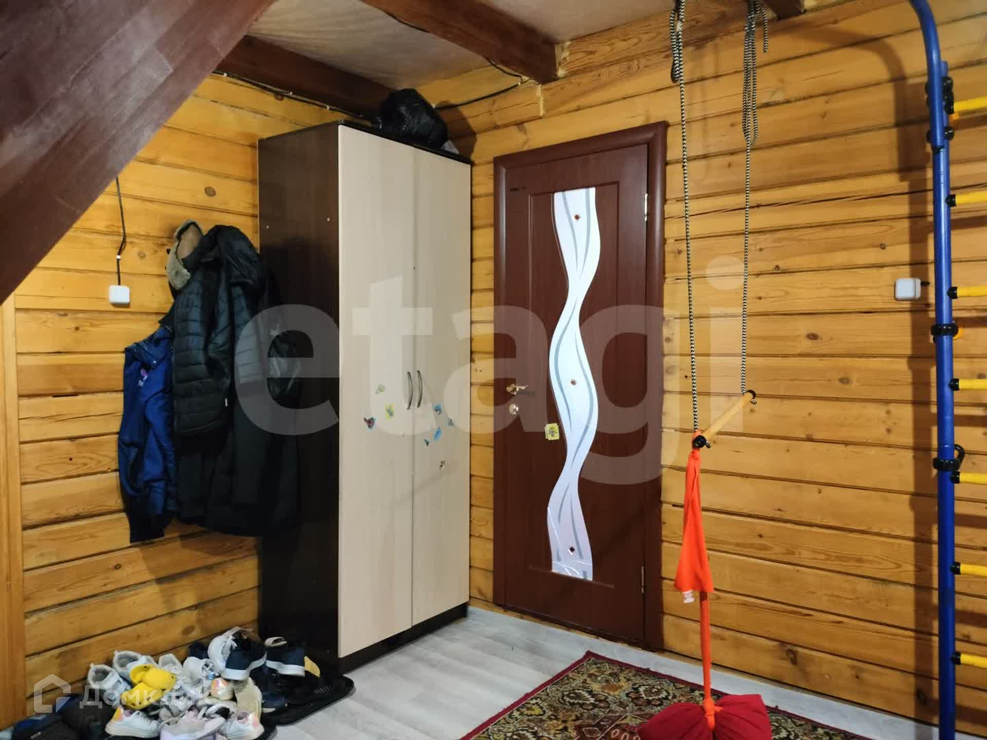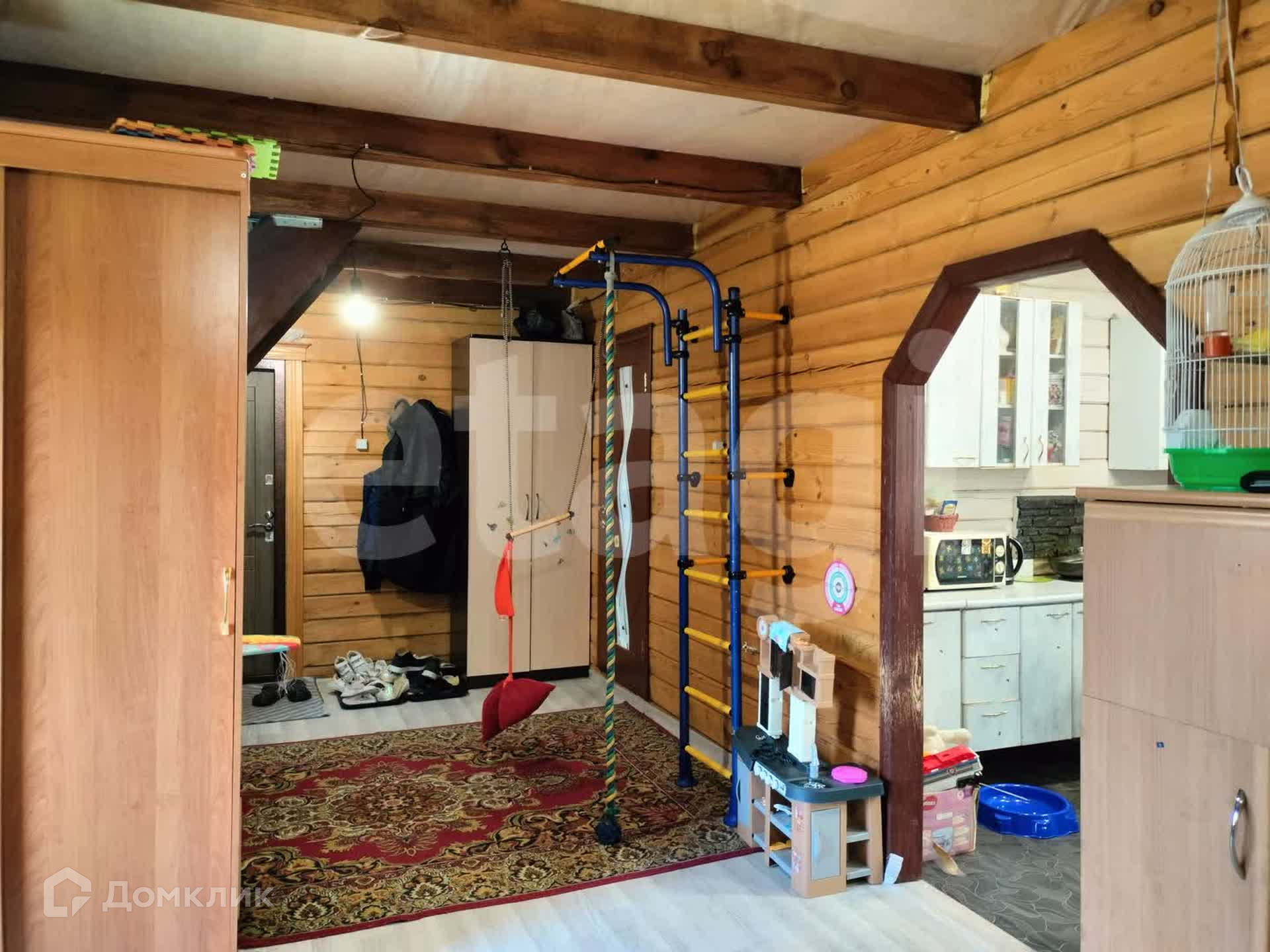 Дом из бруса, снаружи обшит сайдингом, утеплен. Внутри отделка под дерево. Потолки натяжные, везде линолеум, окна ПВХ. Санузел совмещен, есть водонагреватель. Вода - скважина (14 м), отопление - твердотопливный котел, канализация - септик.