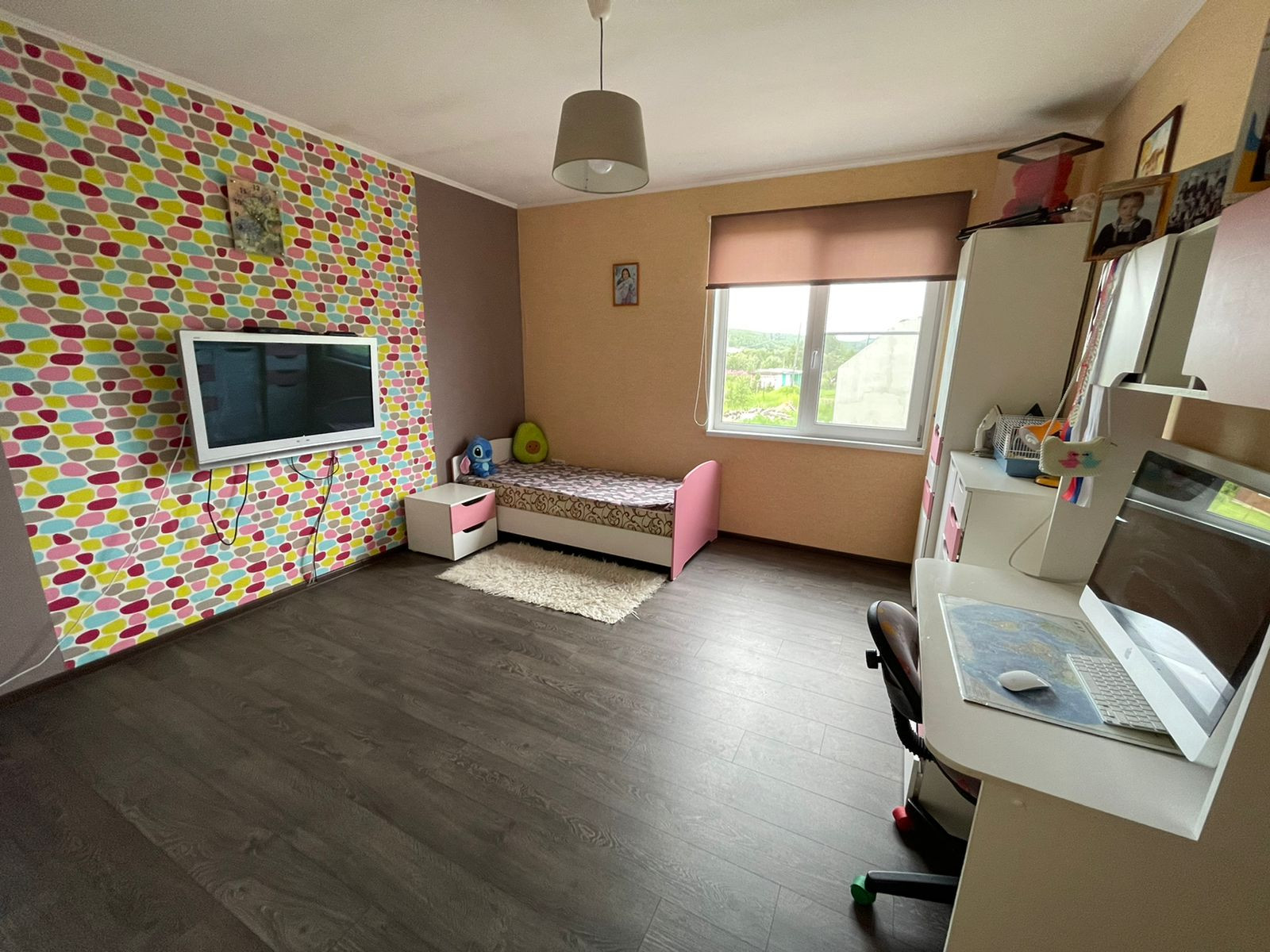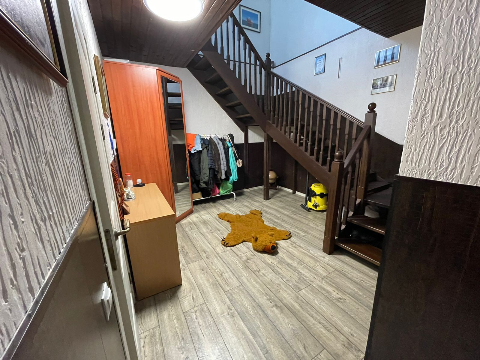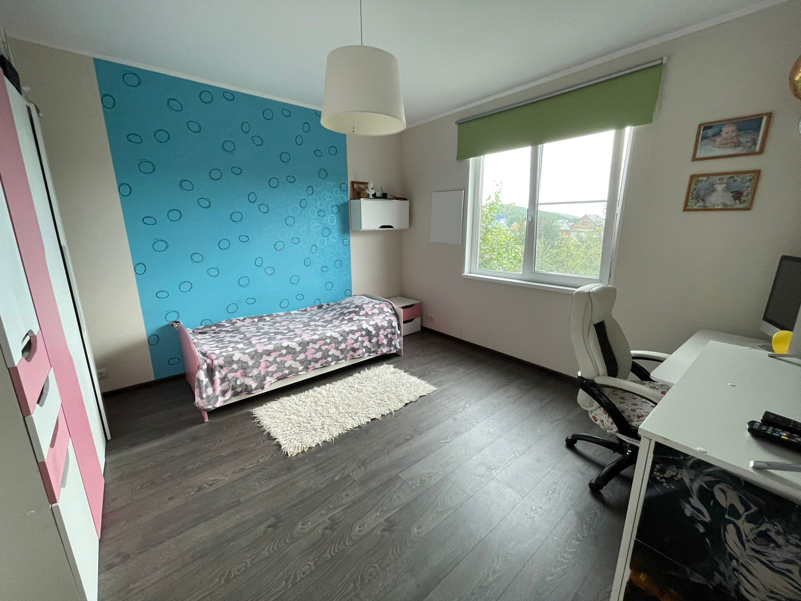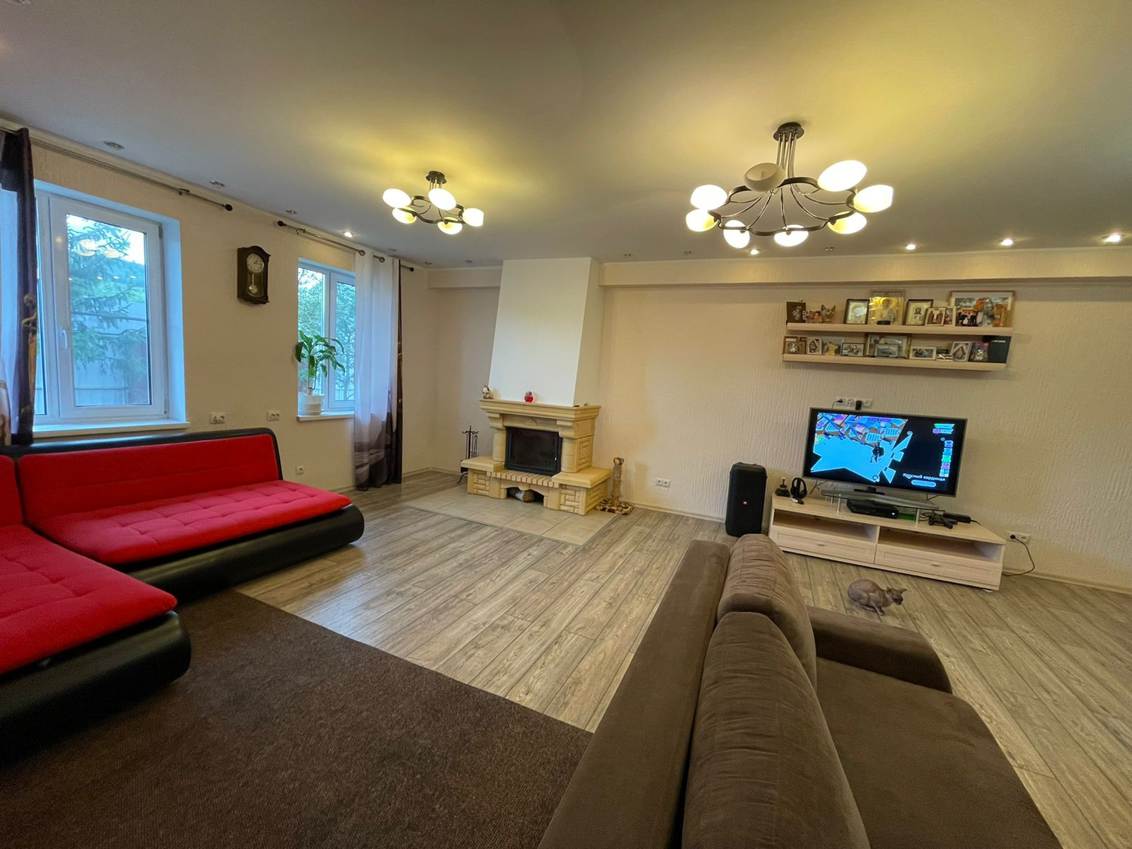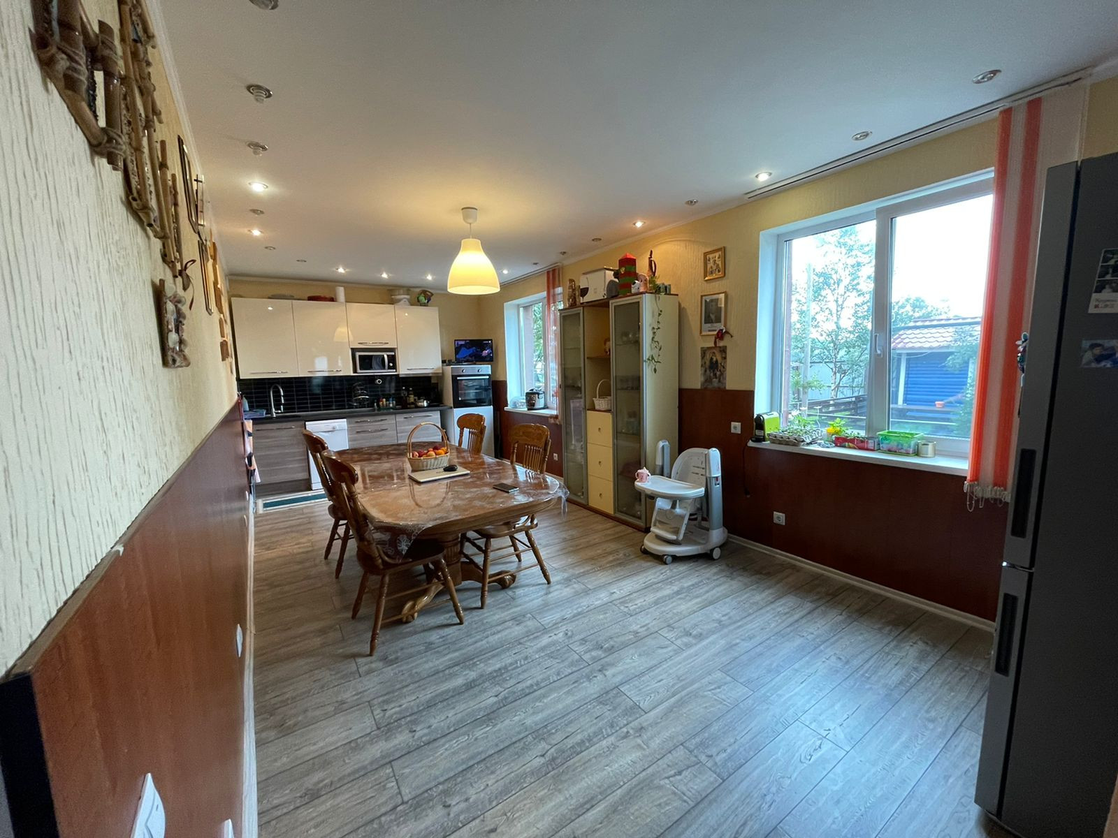 1 этаж – гoстиннaя c камином, просторная кухня, теплый диодный пол, детская комната, с/у с душевой.
