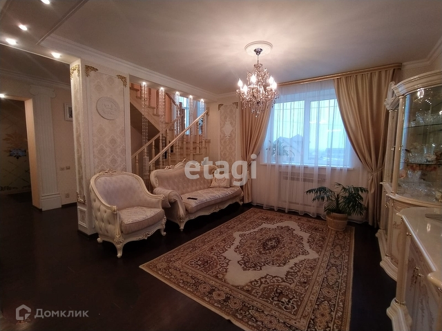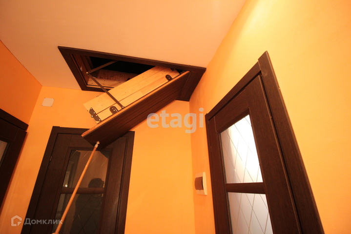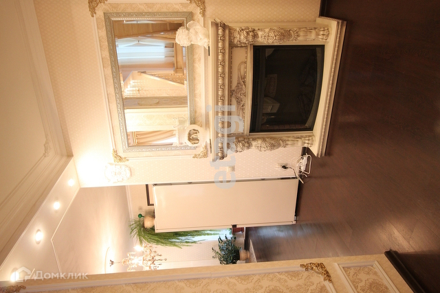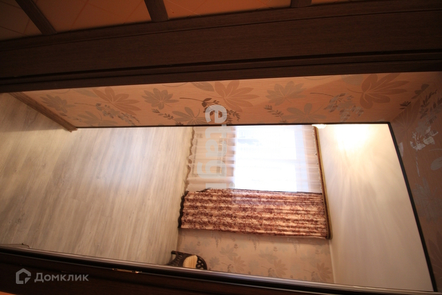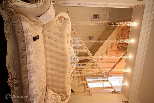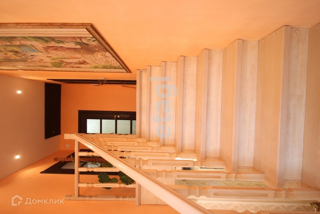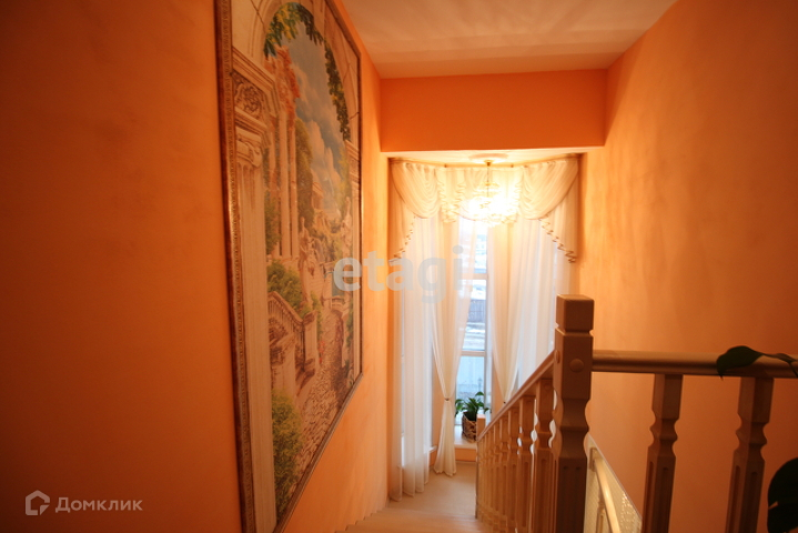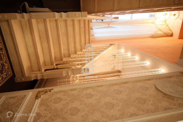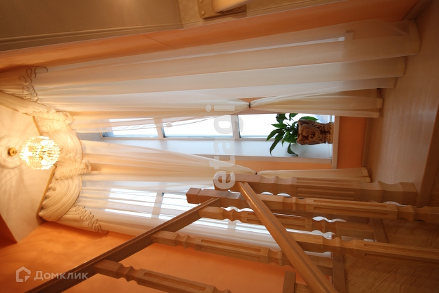 Вход на второй этаж расположен между гостиной и прихожей. Представляет их себя лестницу из массива дерева, имеет окно на межлестничной площадке, оформленное шторами и дополнительным освещением.