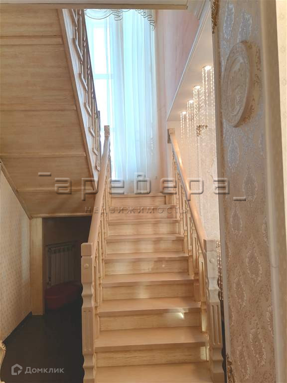 Вход на второй этаж расположен между гостиной и прихожей. Установлена лестница из массива дерева, в межлестничном пролете есть витражное окно, оформленное шторами и дополнительным освещением.