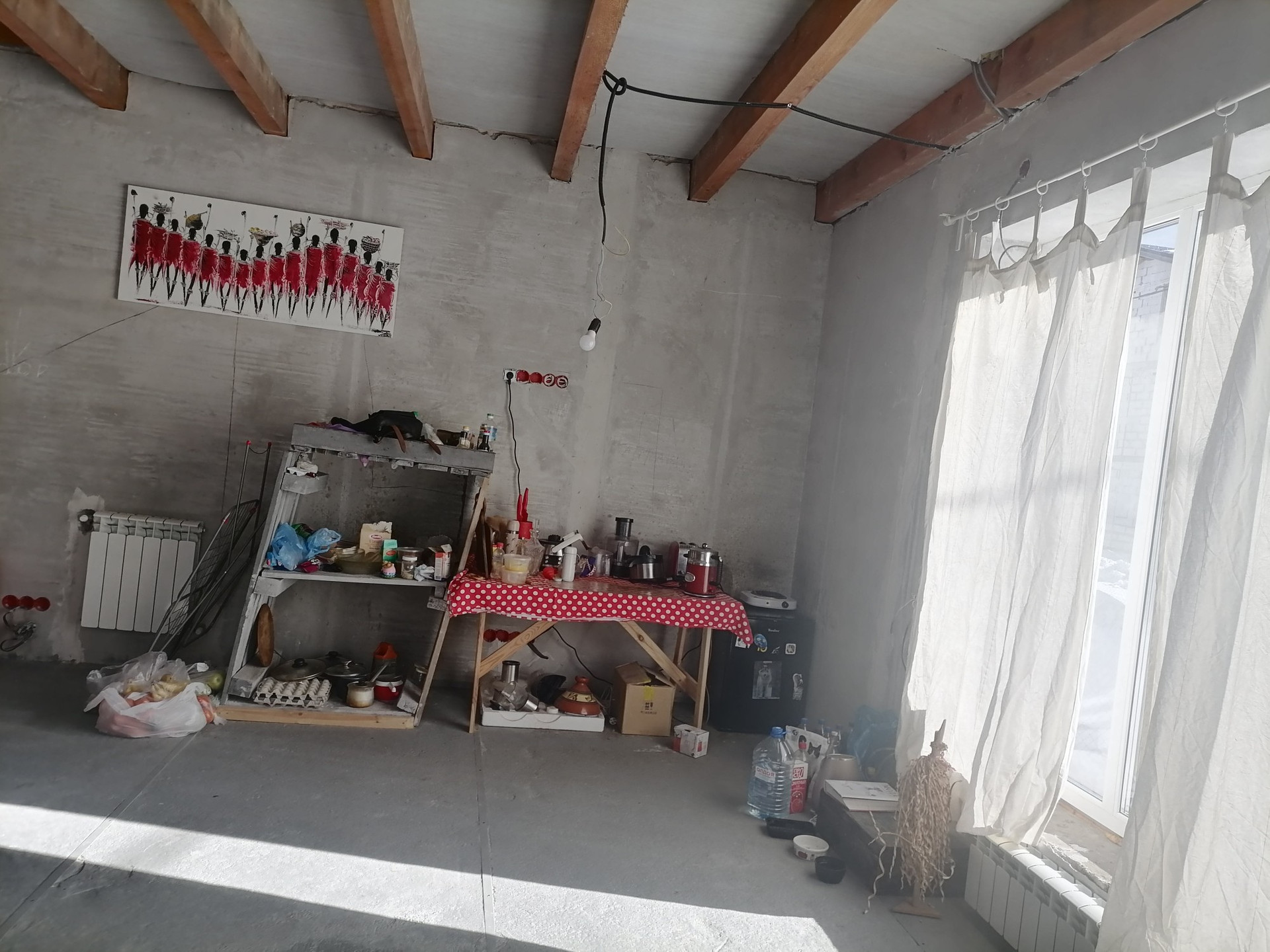 Электрика полностью разведена, стеклопакеты и трубы Rehau, наружная дверь с терморазрывом, качественное и дорогое оборудование: котёл Proterm, напольные батареи, бойлер Thermex, розетки Legrand, дизайнерская мебель, выполненная собственными руками. Всё делала для себя, но планы изменились.