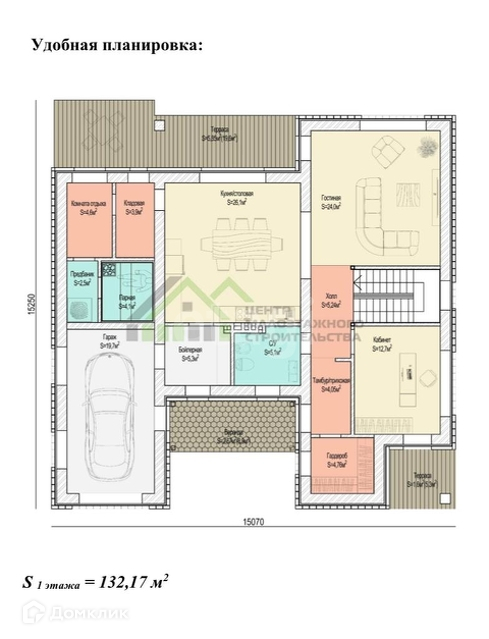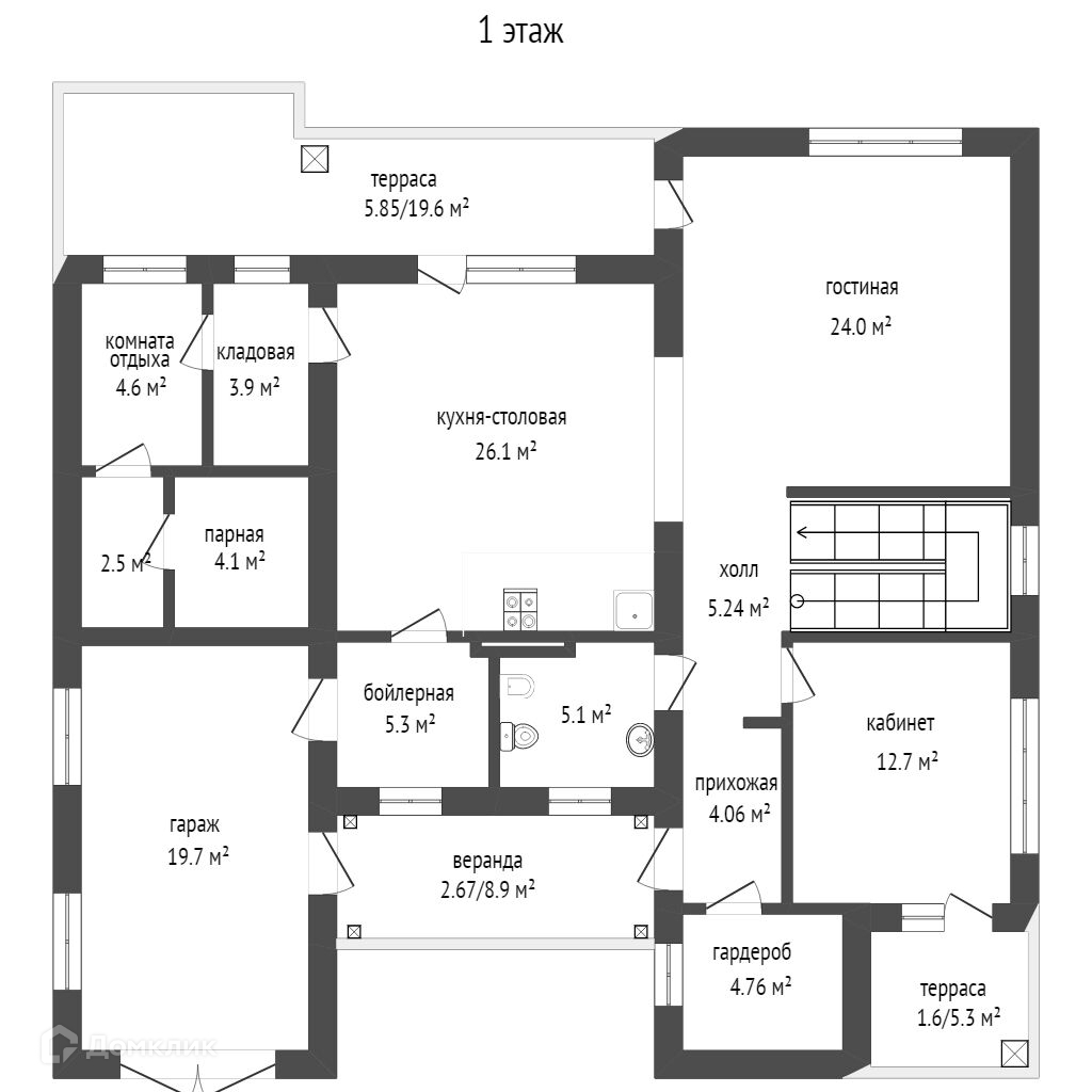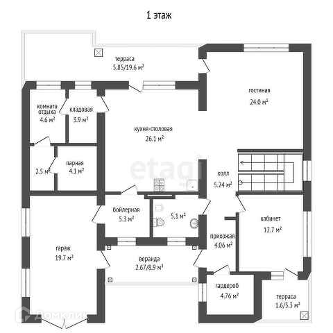 На первом этаже расположены: тамбур-прихожая, холл, гардероб, рабочий кабинет, просторная гостиная, кухня/столовая с выходом на террасу, бойлерная, санузел, кладовая при кухне, с возможностью попадания из гаража(очень удобно) комната отдыха, моечная, парная, гараж/мастерская, крыльцо, две террасы.