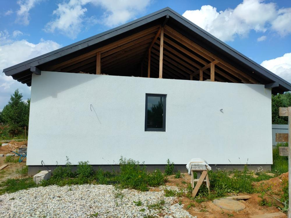Кровля: мягкая черепица утеплитель-минеральная вата 200 мм. Фасад: декоративная штукатурка.