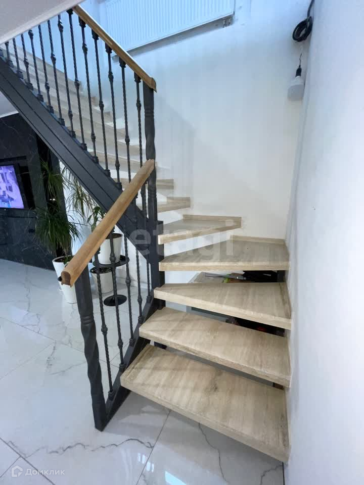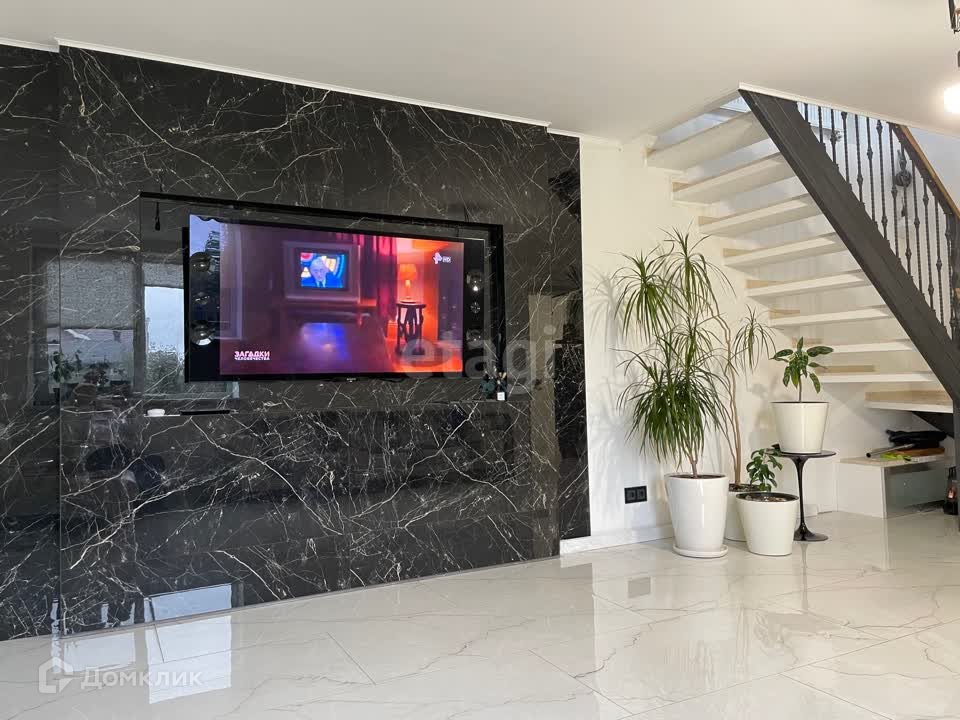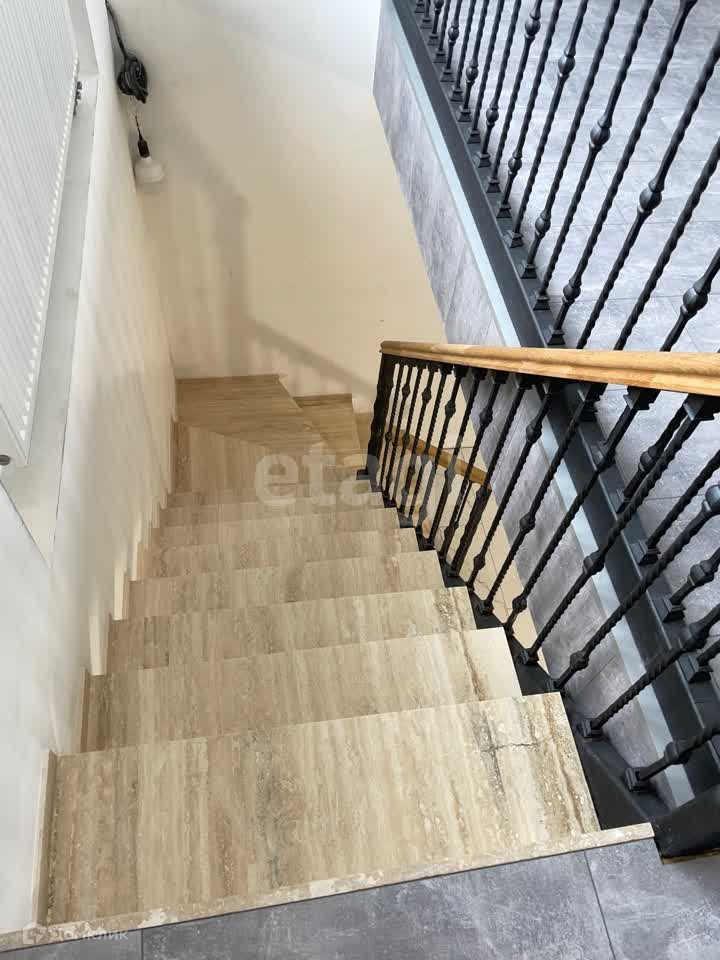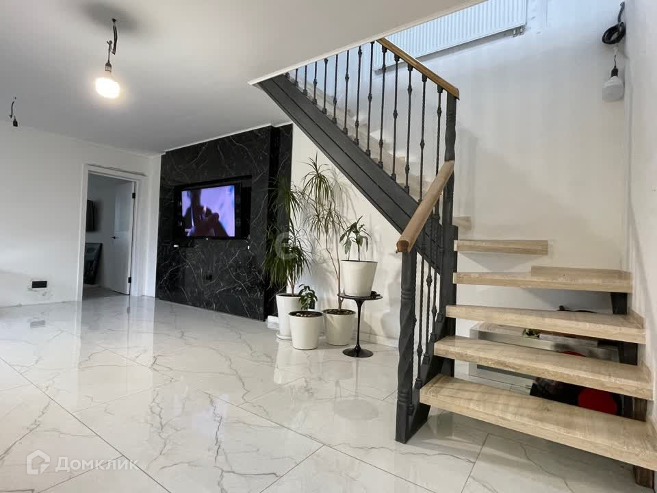 Гостей встречает большая гостиная зона с выходом в кухню. Пол на первом этаже с подогревом, есть система "умный дом", роскошная кованная лестница с мраморными ступенями. Кухонная зона со встроенной техникой. Оборудованная бойлерная.
