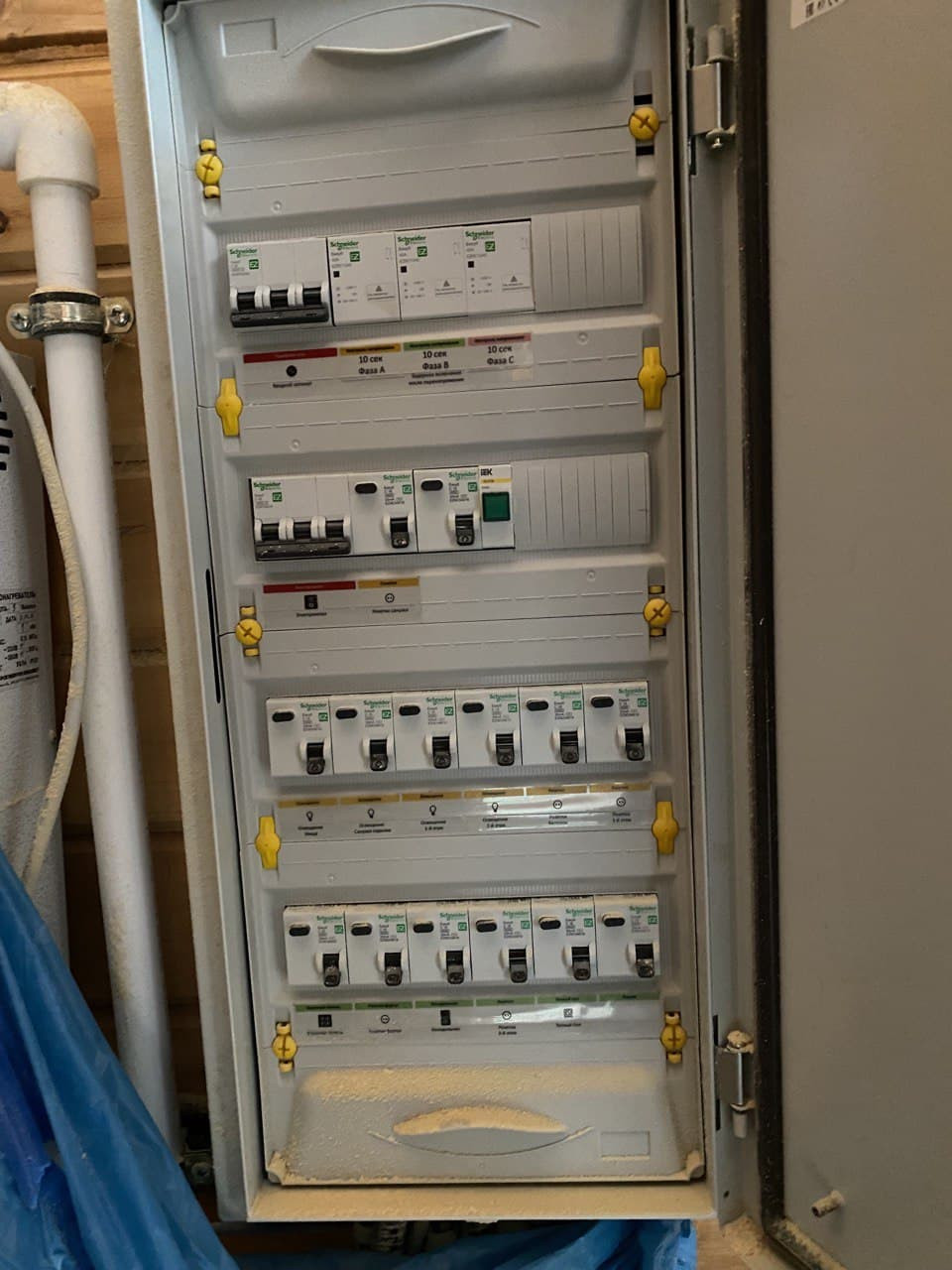 Выполнена проводка электричества из негорючего кабеля, выделенная мощность на участок 15 кВт. Заложен кабель для интерьерной подсветки фасада. Сделана разводка для тёплого пола. На каждый электроприбор заложен отдельный автомат (Шнайдер). Отопление водяное с электрокотлом, возможно переключение на газ , газ в ДНТ .