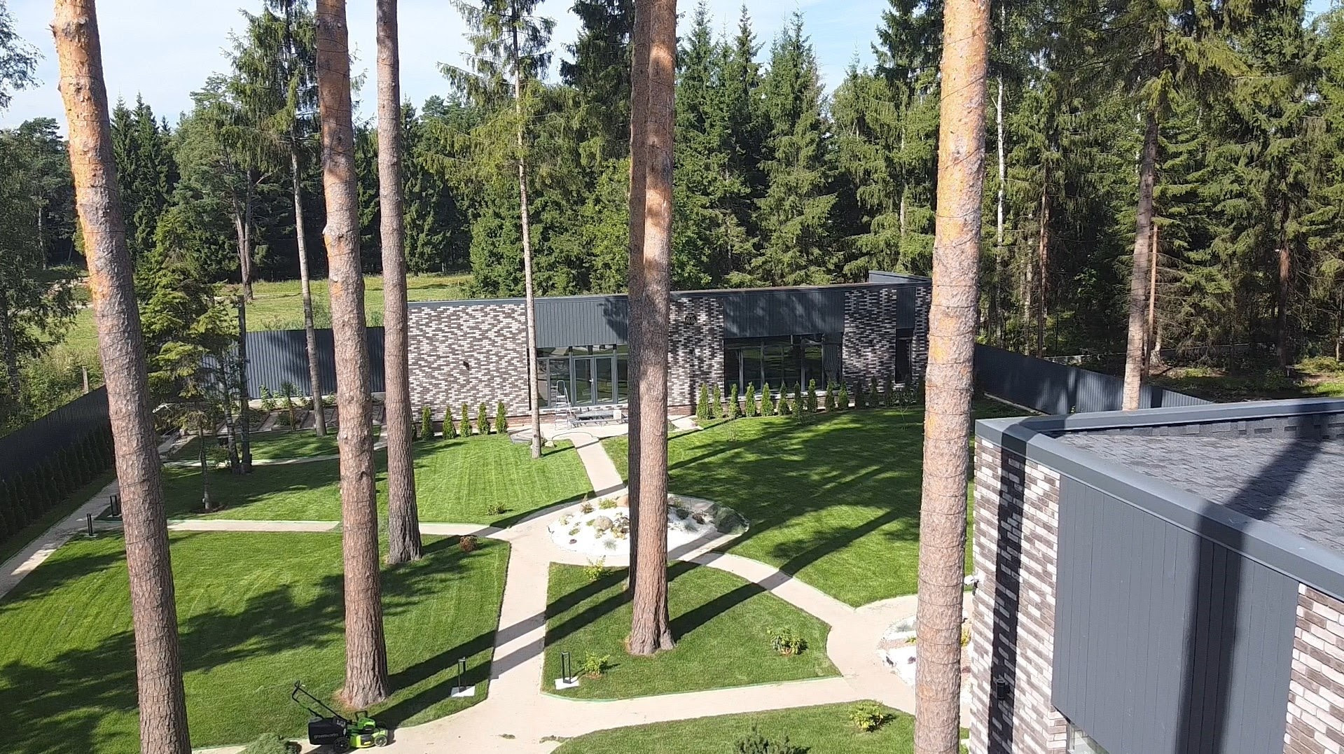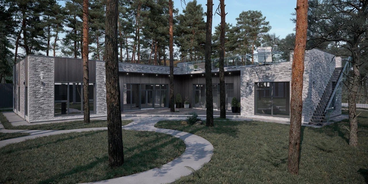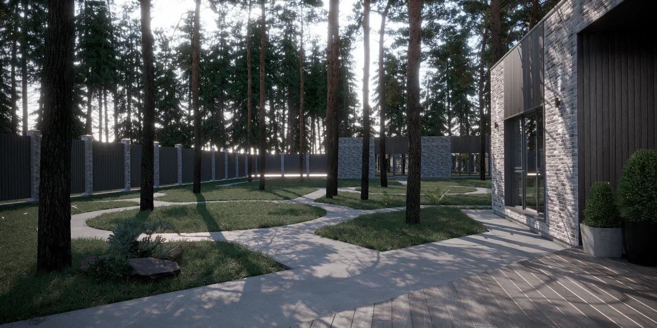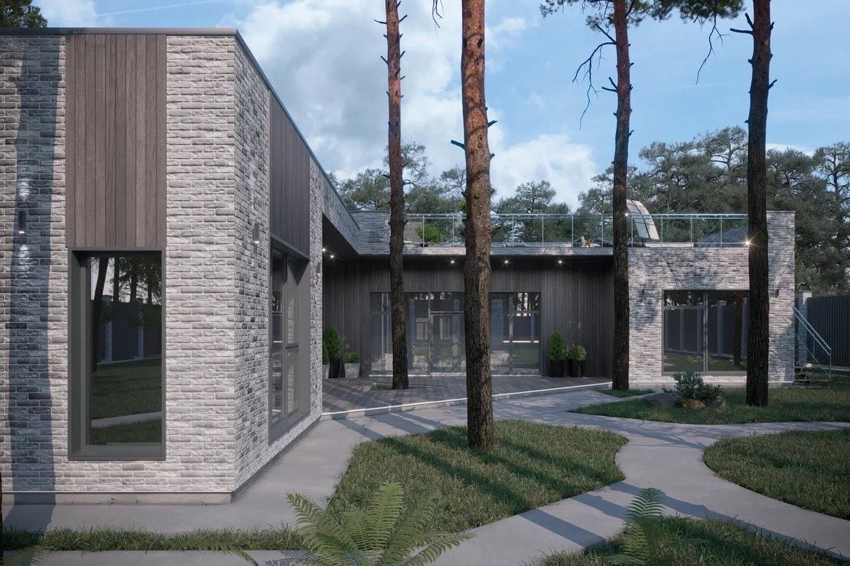 Архитектурная концепция соответствует формирующимся трендам загородного рынка: при строительстве используется газобетон, облицованный бельгийским кирпичом ручной формовки, а на площади в 330 м2 в один уровень разместились 4 спальни и кабинет, просторная кухня-гостиная площадью 50 кв.м. с камином и выходом на веранду площадью более 55 кв.м. Спроектированы две гардеробные комнаты, прачечная, кладовая. Комфорт кроется в деталях: вход в дом доступен как с улицы, так и из гаража.