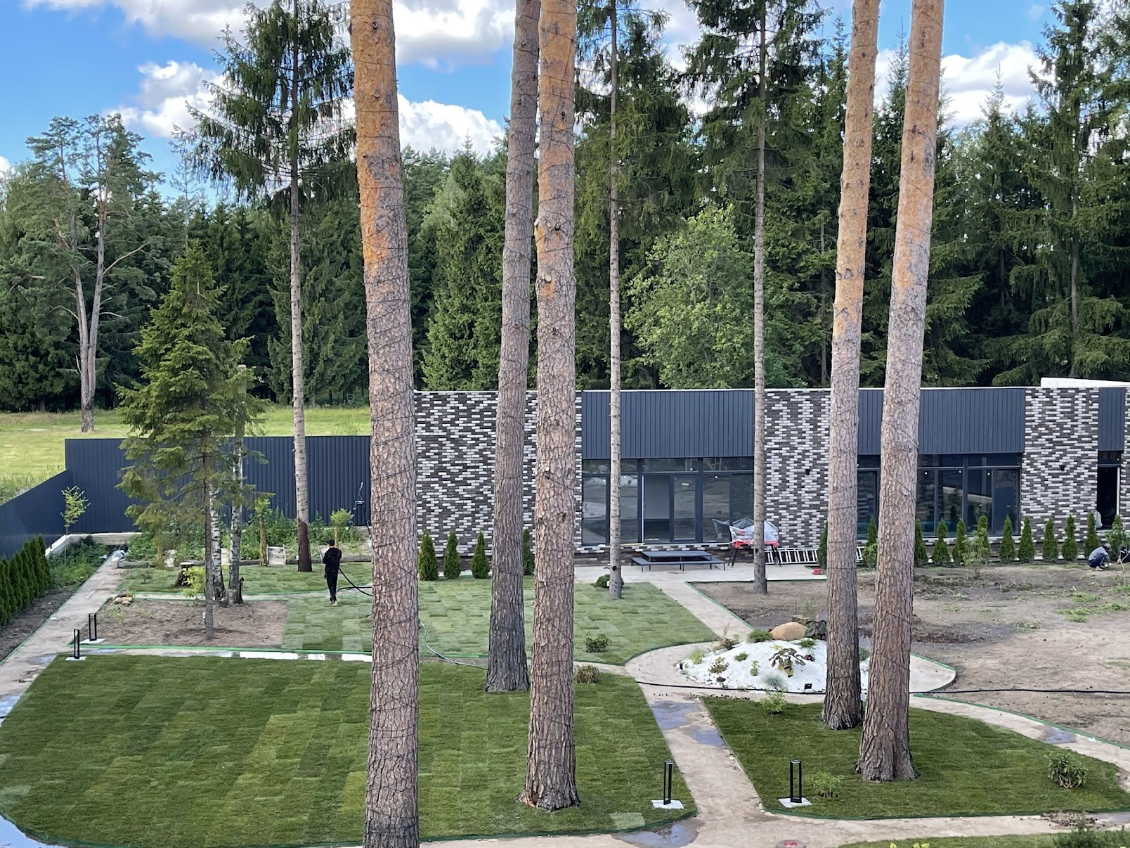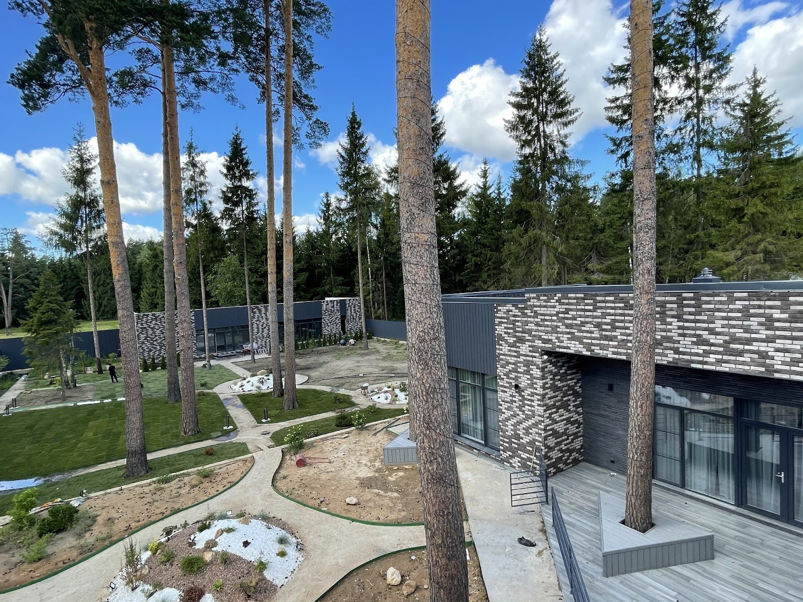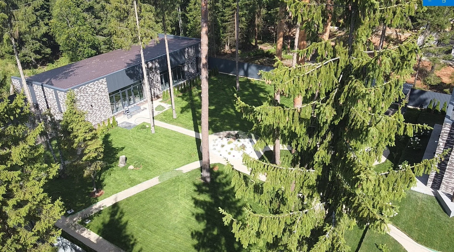 Архитектурная концепция соответствует формирующимся трендам загородного рынка: при строительстве используется газобетон, облицованный бельгийским кирпичом ручной формовки, а на площади в 330 м2 в один уровень разместились 4 спальни и кабинет, просторная кухня-гостиная площадью 50 кв.м. с камином и выходом на веранду площадью более 55 кв.м. Спроектированы две гардеробные комнаты, прачечная, кладовая. Комфорт кроется в деталях: вход в дом доступен как с улицы, так и из гаража.