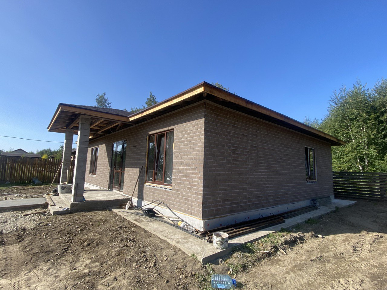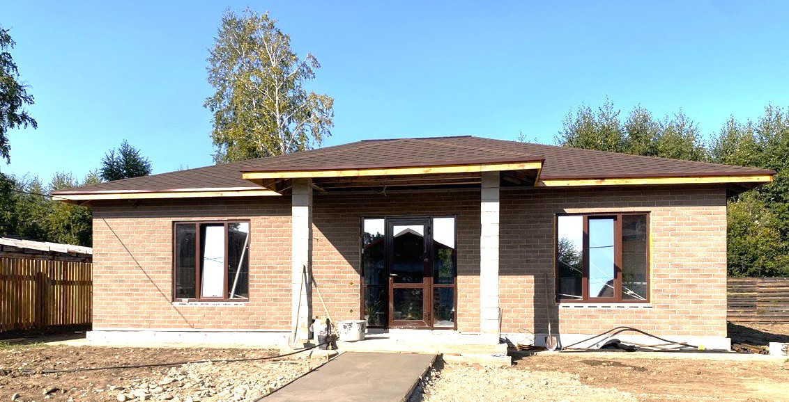 Кровля мягкая черепица, в стенах выложен сейсмопояс, отделка дома - декоративная панель