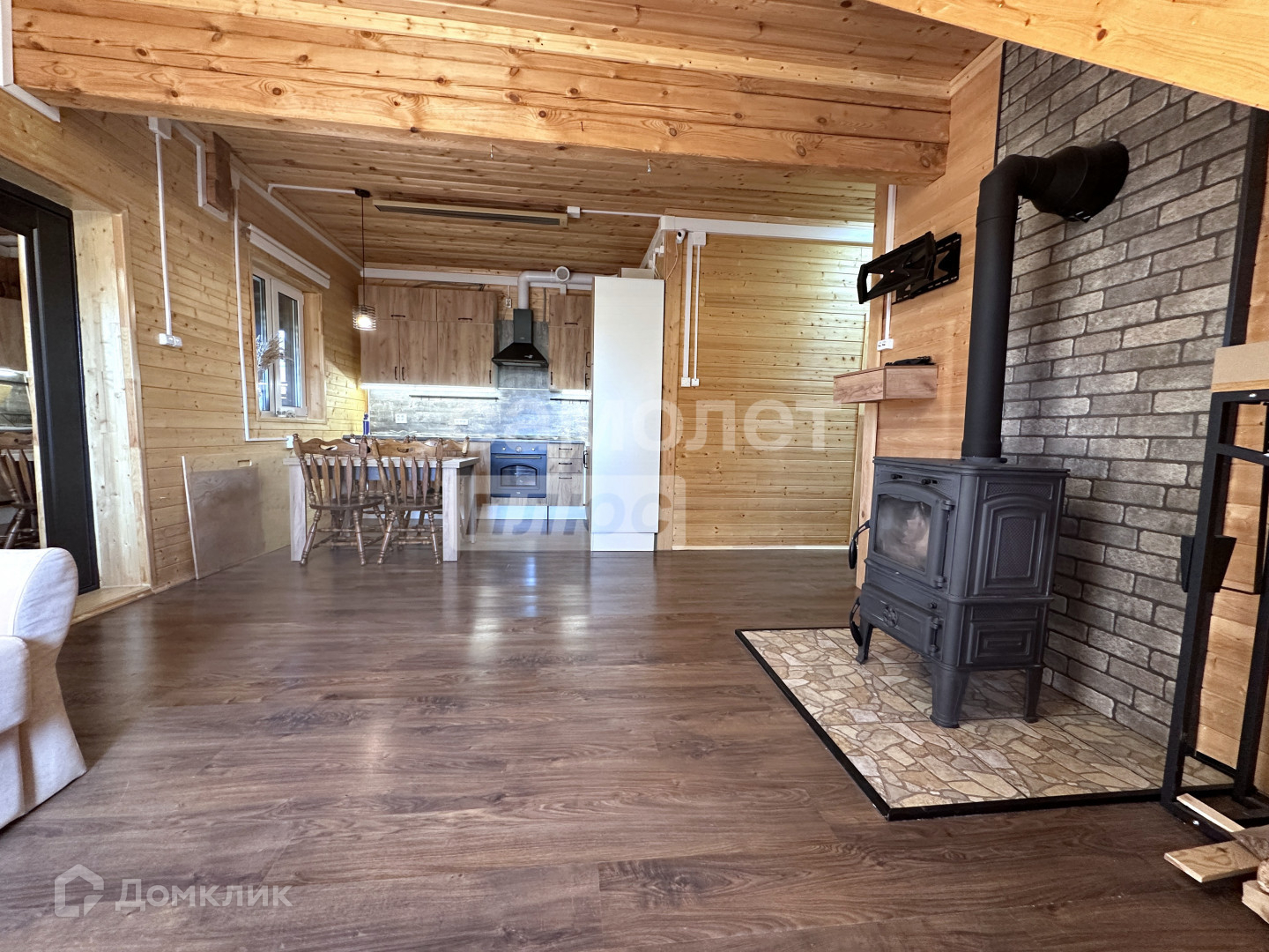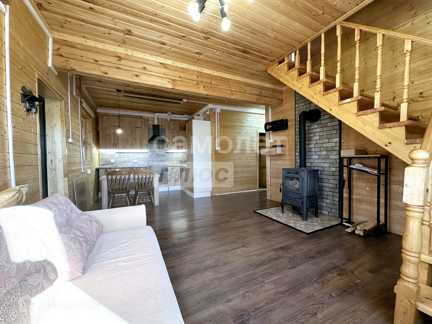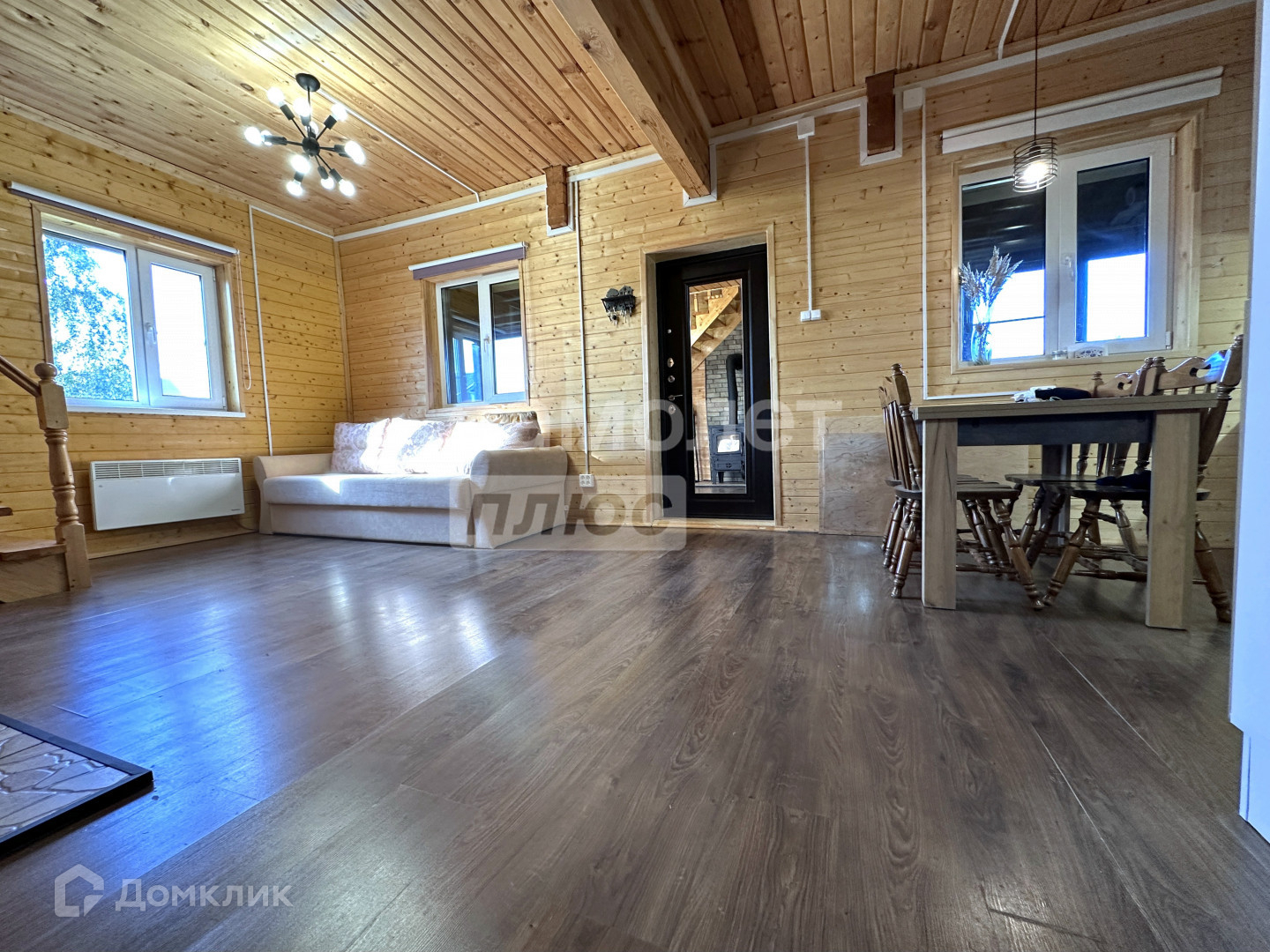 * На первом этаже: просторная гостиная, совмещённая с кухней, удобная широкая прихожая, санузел, полностью отделанная комната свободного назначения. Также здесь есть бойлерная/постирочная и закрытое крыльцо.