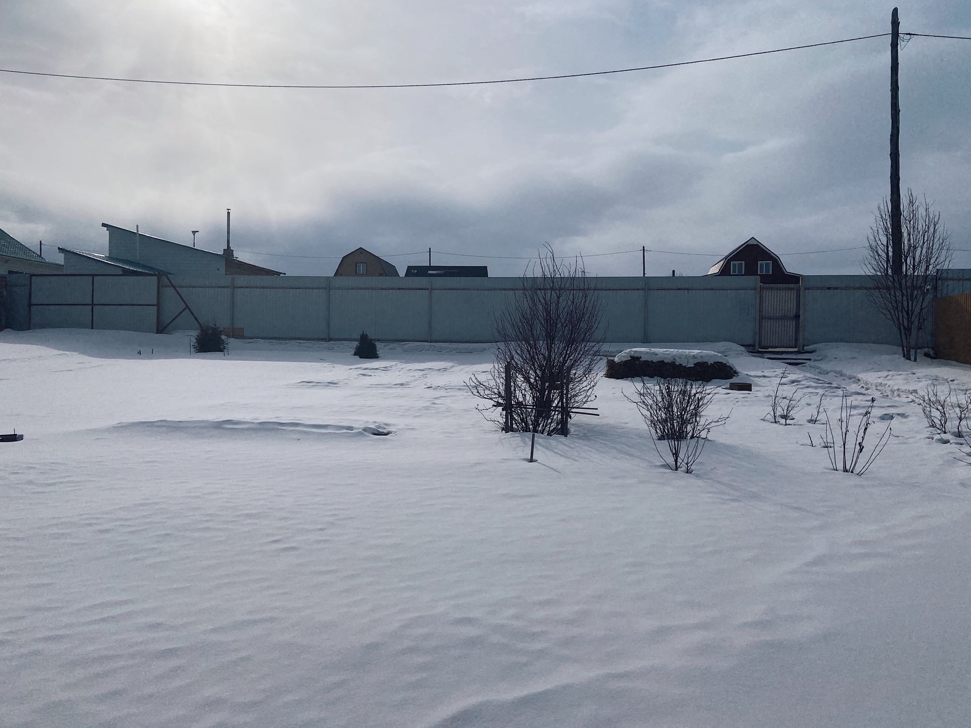 Соседи проживают круглый год, не шумные. С двух сторон участок граничит с одним соседом;