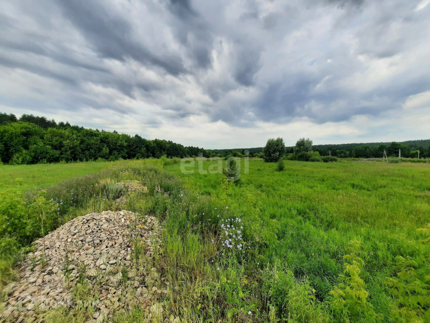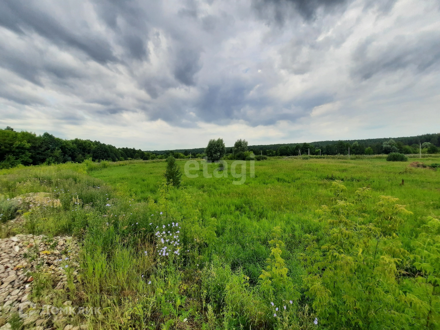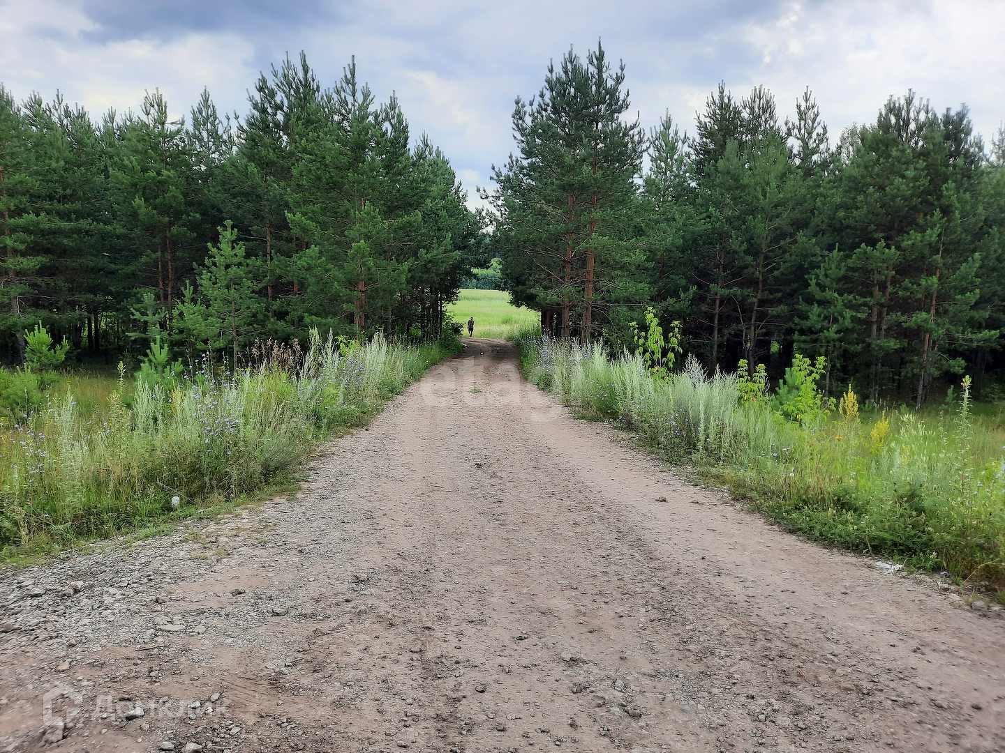До участка проходит дорога с щебнем. Стоят столбы электроснабжения.