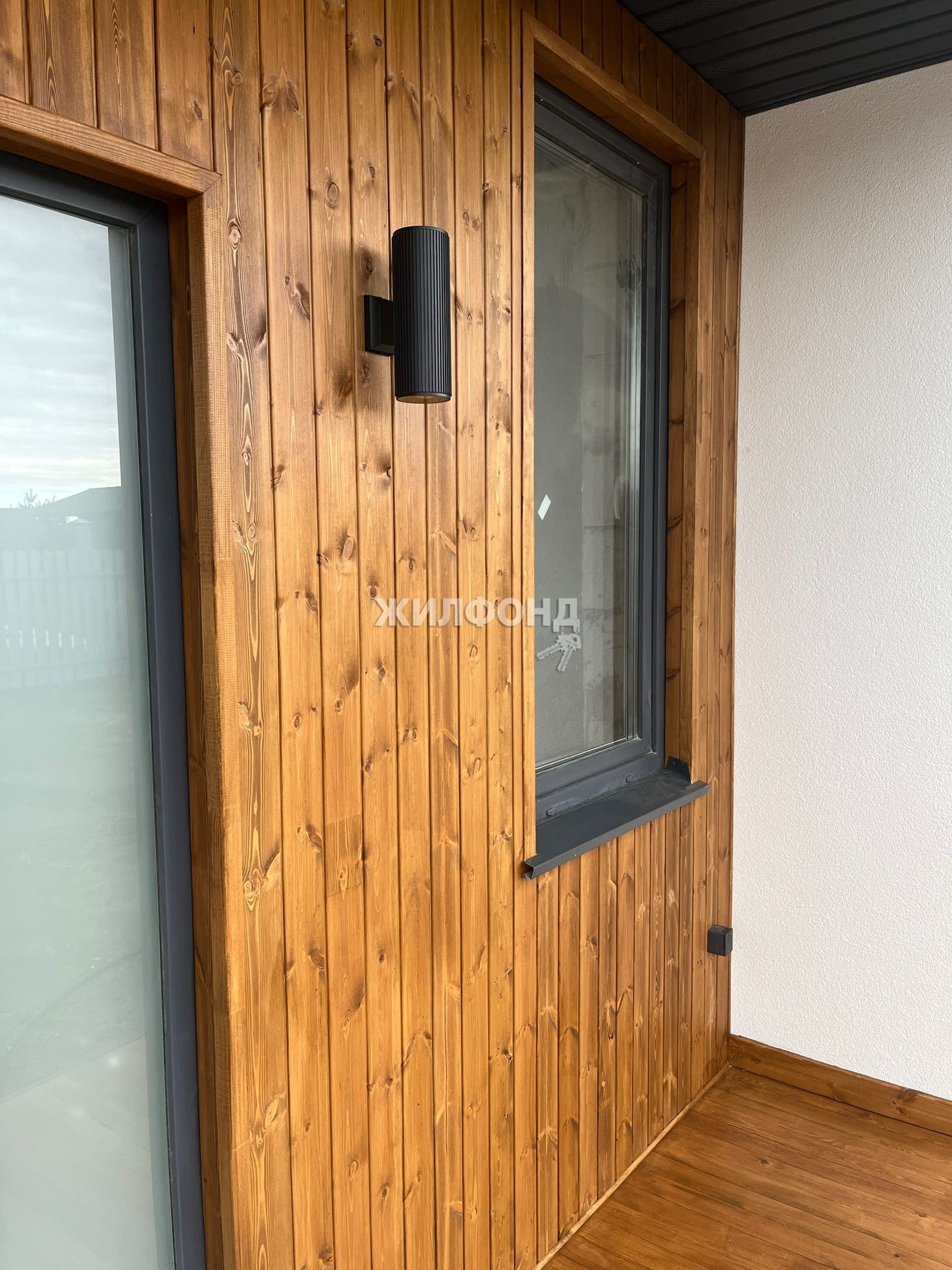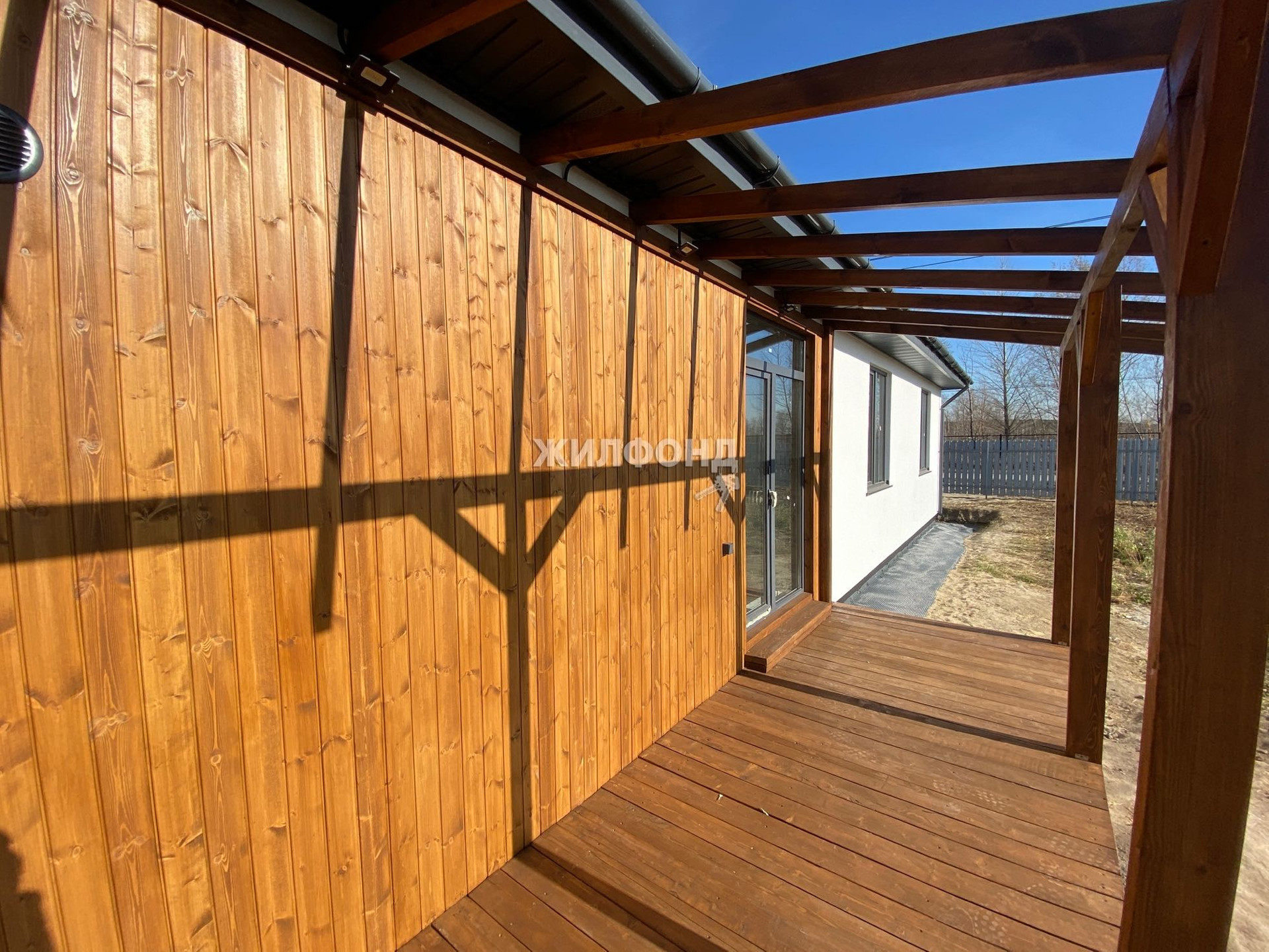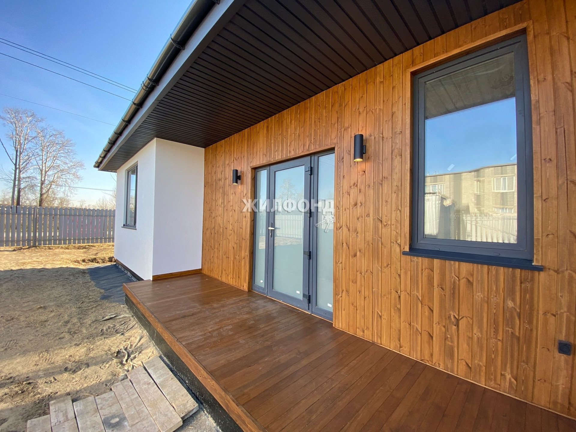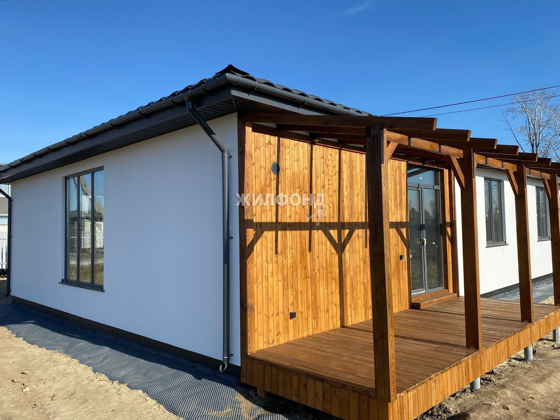 Экологичный и надежный мокрый фасад белого цвета в комбинации с деревом и фасадным освещением создает приятный уют на участке.