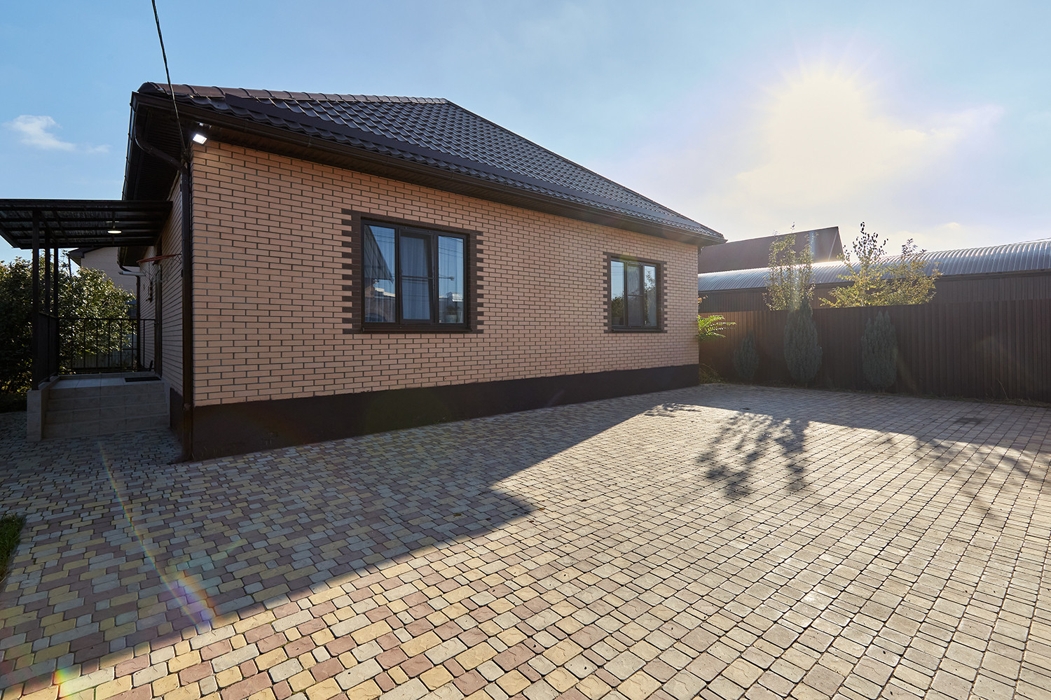 Двор вымощен тротуарной плиткой. Есть место для парковки не менее 3 автомобилей.