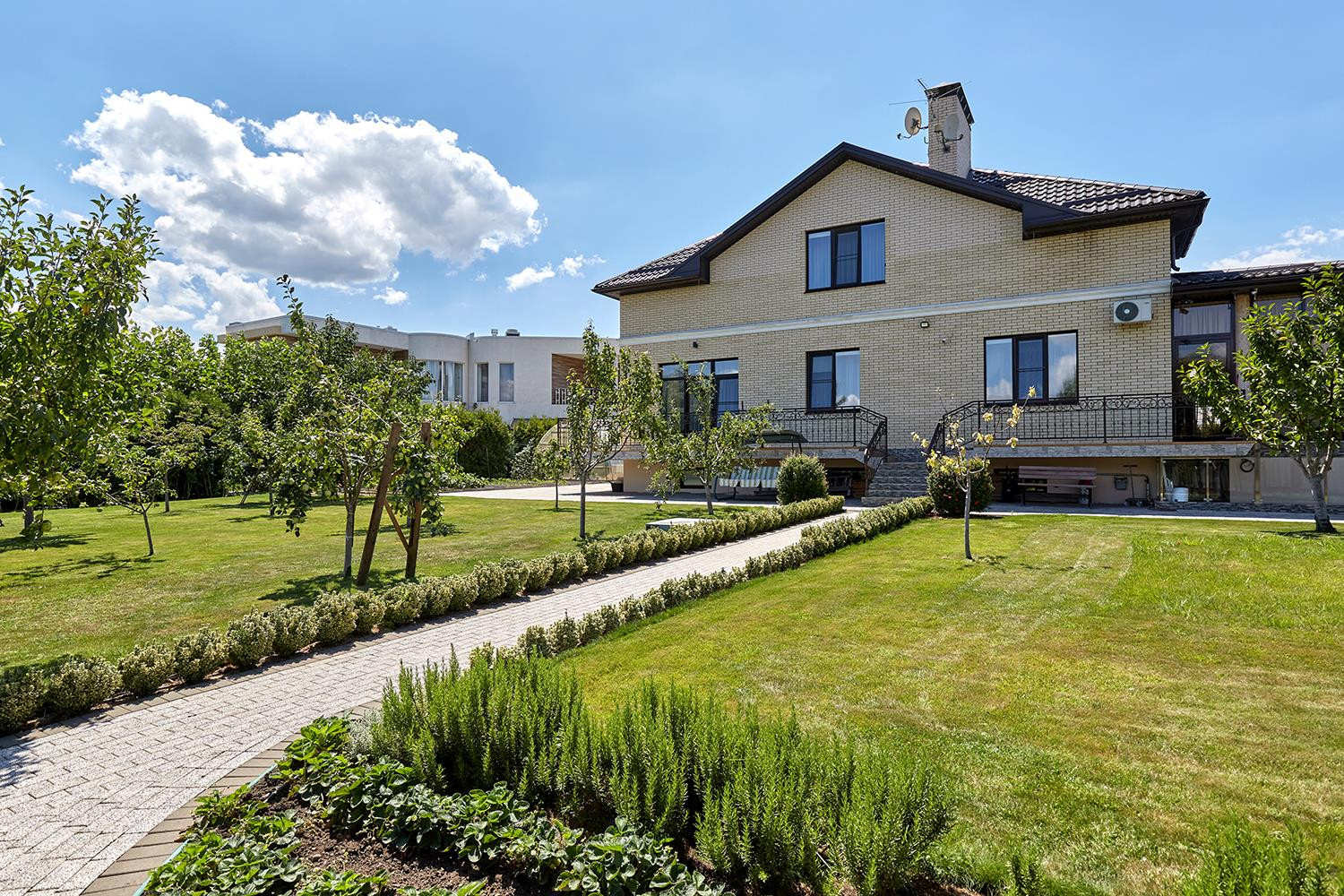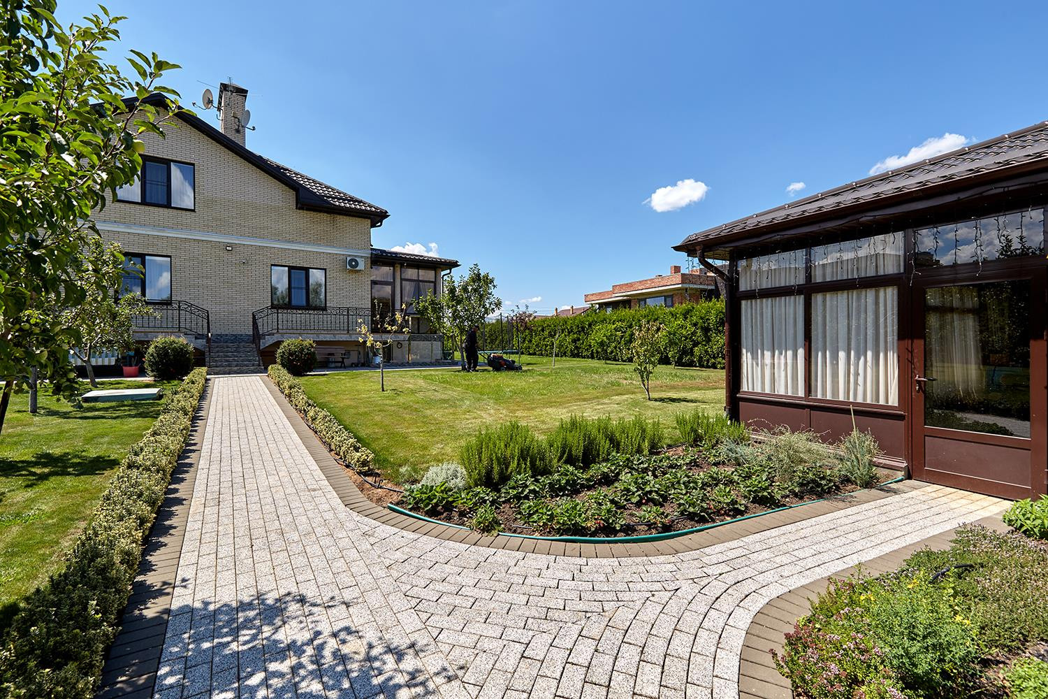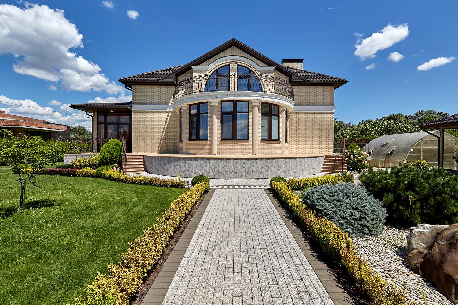 Достоинство этого дома — умеренные пространства помещений, классический дизайн интерьеров, выгодное расположение, позволяющее легко добраться до центра города Краснодара. Комфортная планировка, изысканный ландшафтный дизайн на участке, а также современное инженерное оснащение дома и участка.