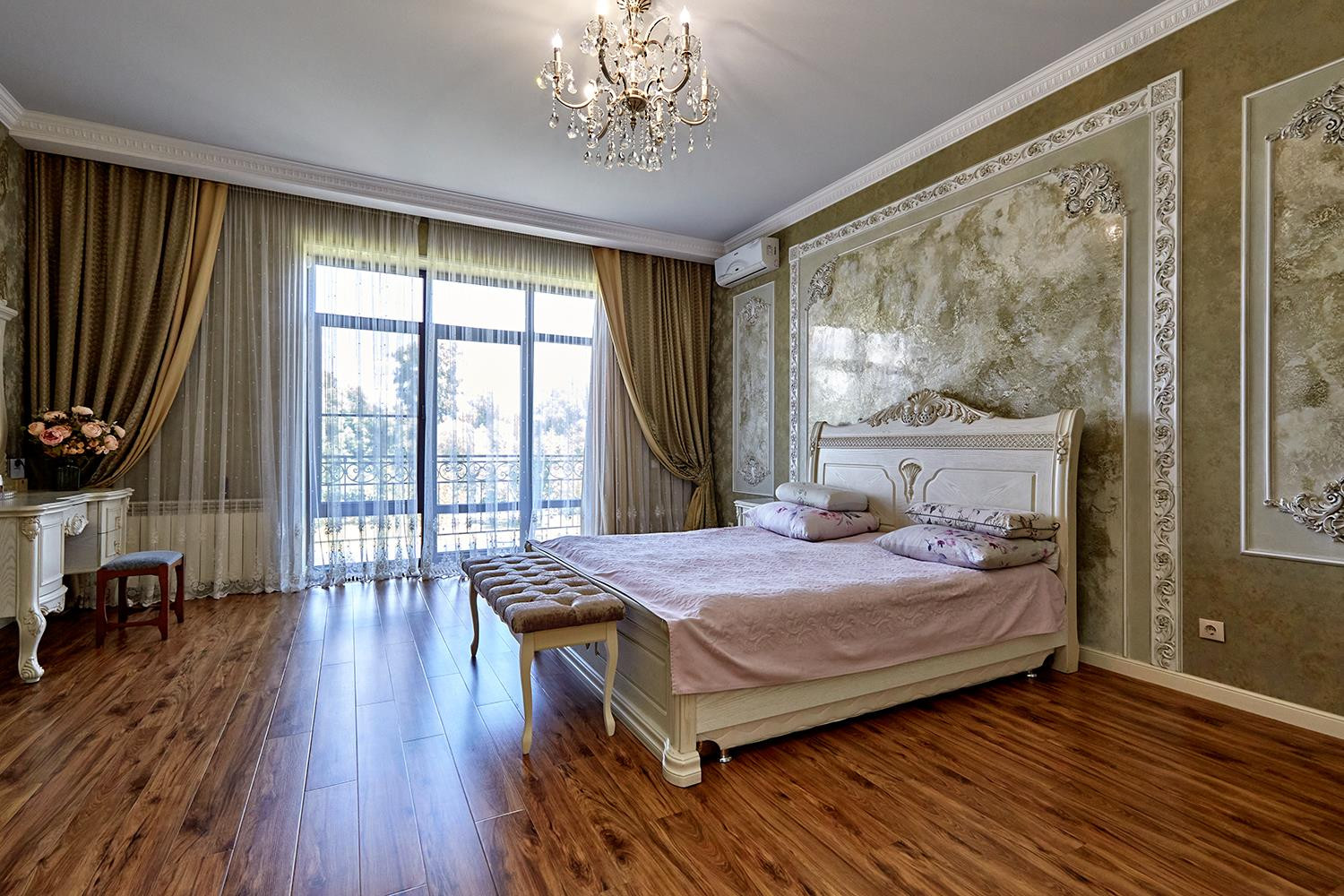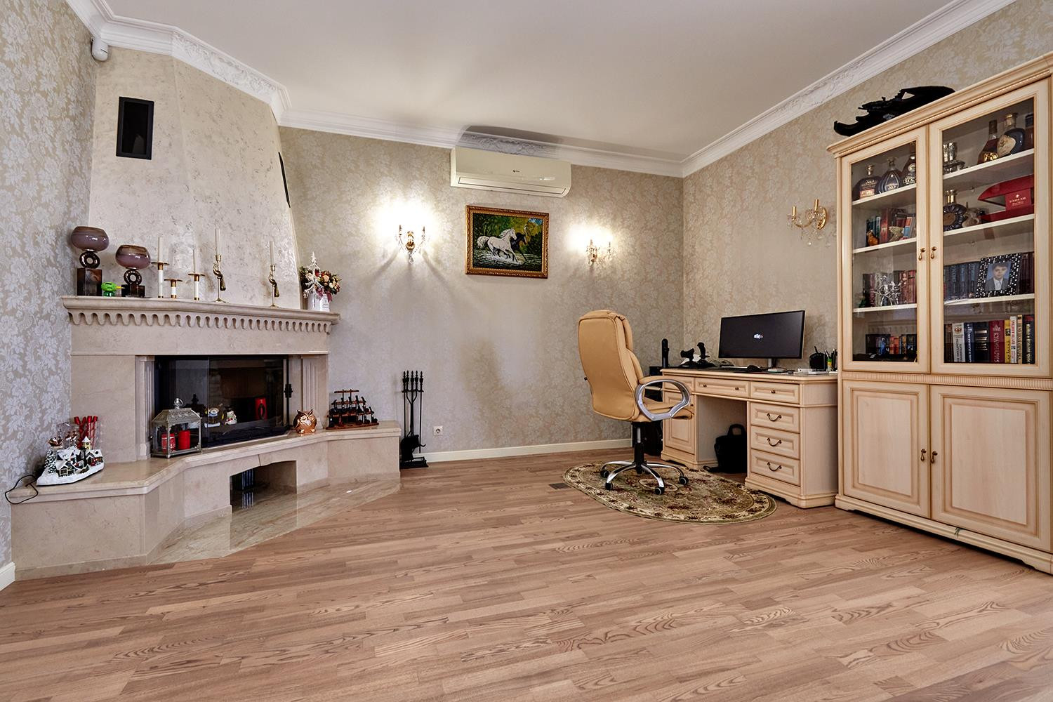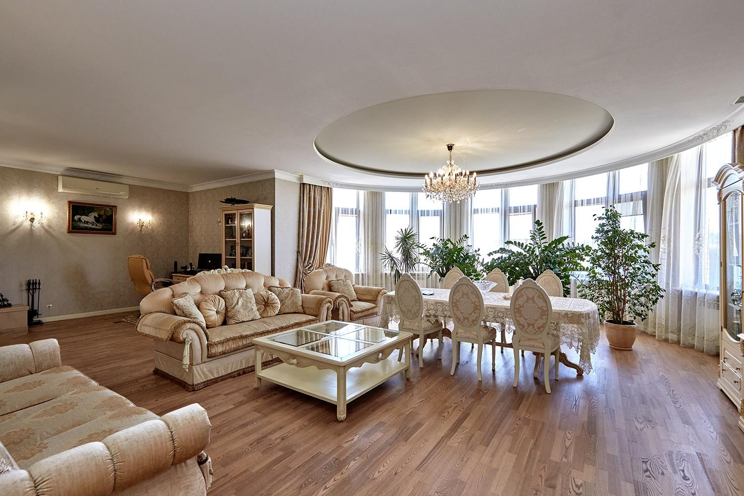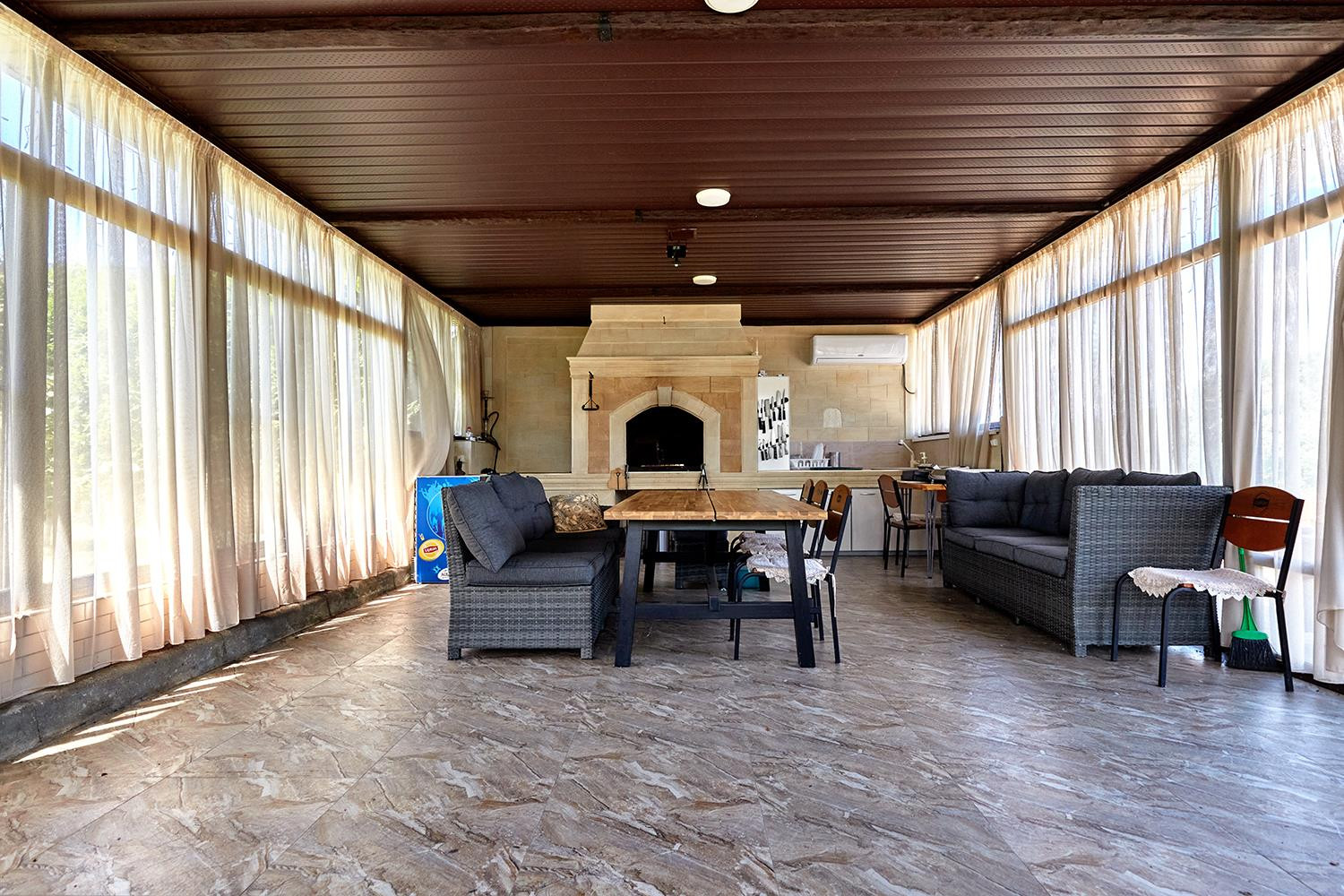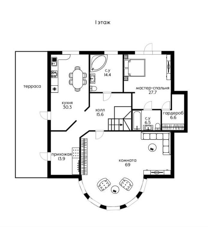 1 этаж: просторная входная зона, холл, гардеробная, гостевой с/у, рабочая профессиональная кухня столовая (Италия), гостиная с камином для приема гостей, спальня с с/у и гардеробной, терраса.
