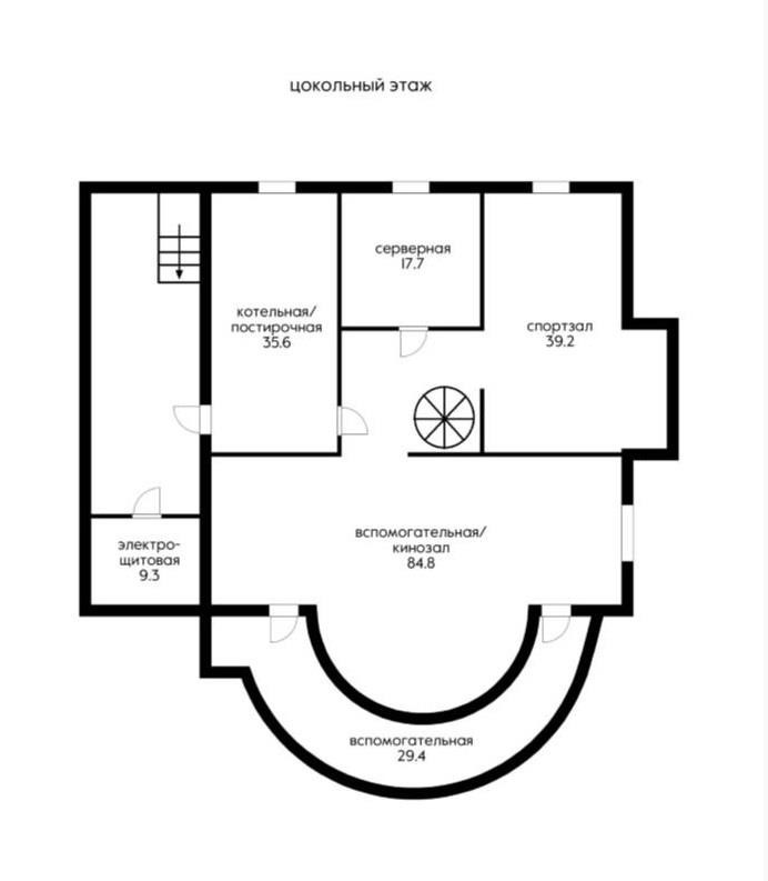 Цокольный этаж: комнаты свободного назначения (складские, гардеробные, постирочная, котельная), санузел, профессиональный спортзал, домашний кинотеатр.