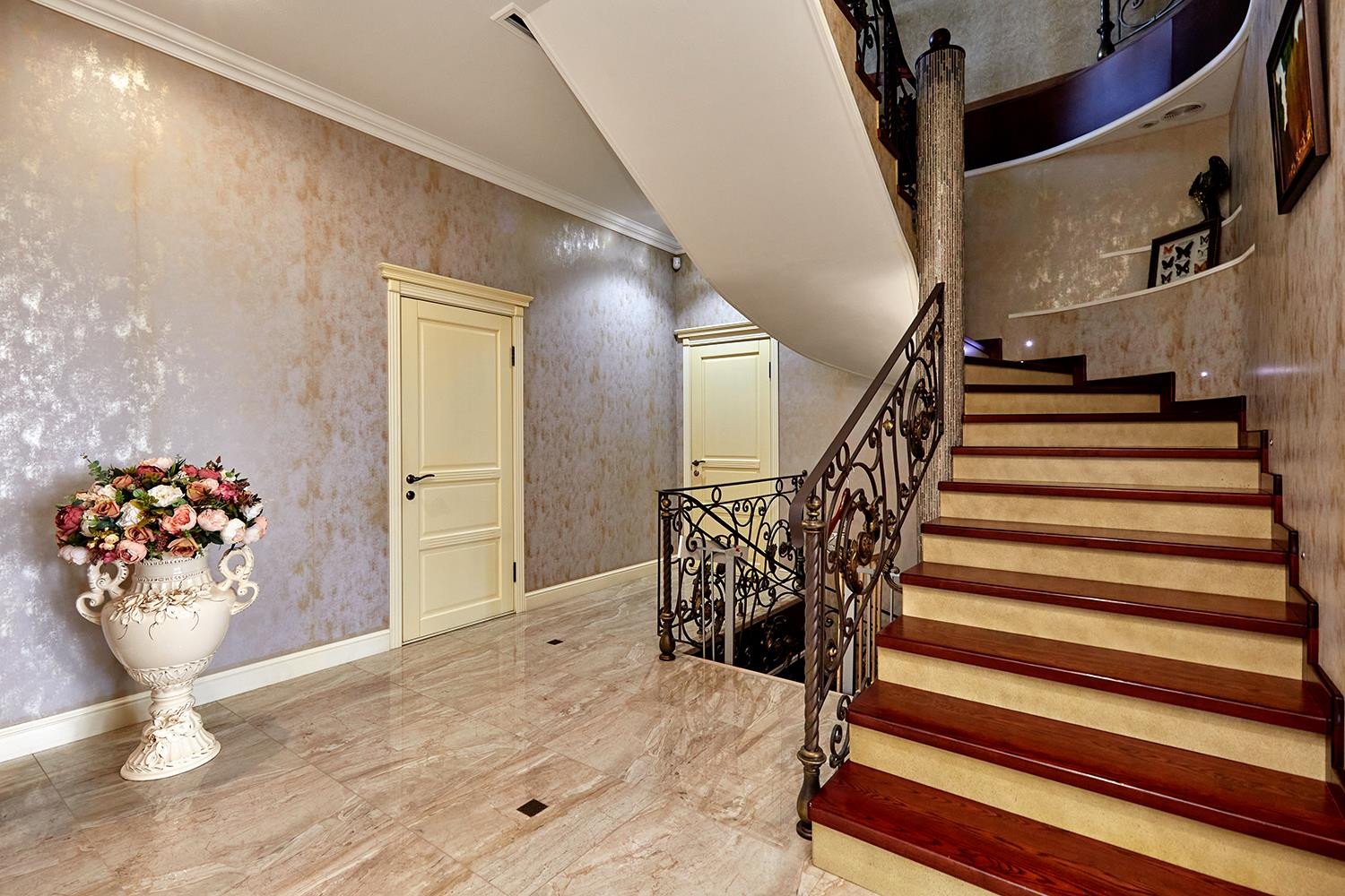 2 этаж: просторный холл, терраса, 3 спальни с гардеробными, санузел, кабинет.