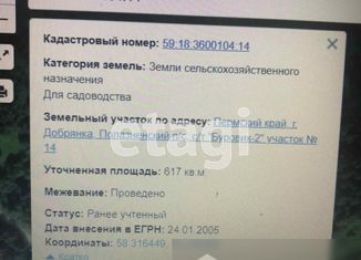 Пермский край, ДобрянкаПродам участок 13,02 сотки, земли сельхозназначения (СНТ, ДНП), 21 км до городаПермский край, Добрянский район, Полазненское г/п, СПК "Уральская Нива", урочище Зерниха , 25 км от Перми по федеральной трассе Пермь-Березники, участок примыкает к трассе, , зем. участок 1302 кв.м.,участок ровный, проезд круглогодичный, рядом начинаетс... |