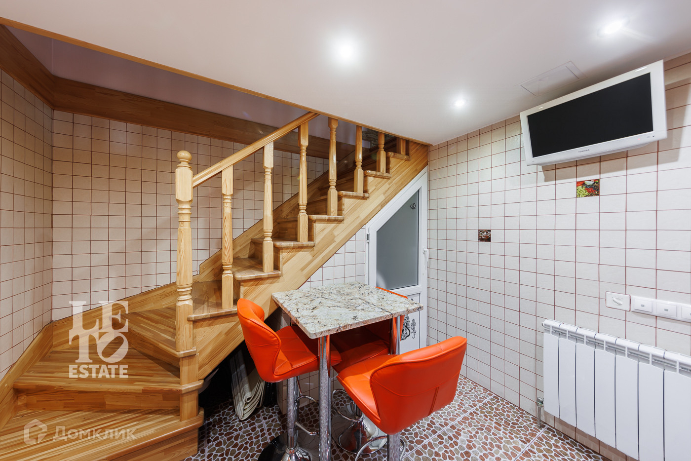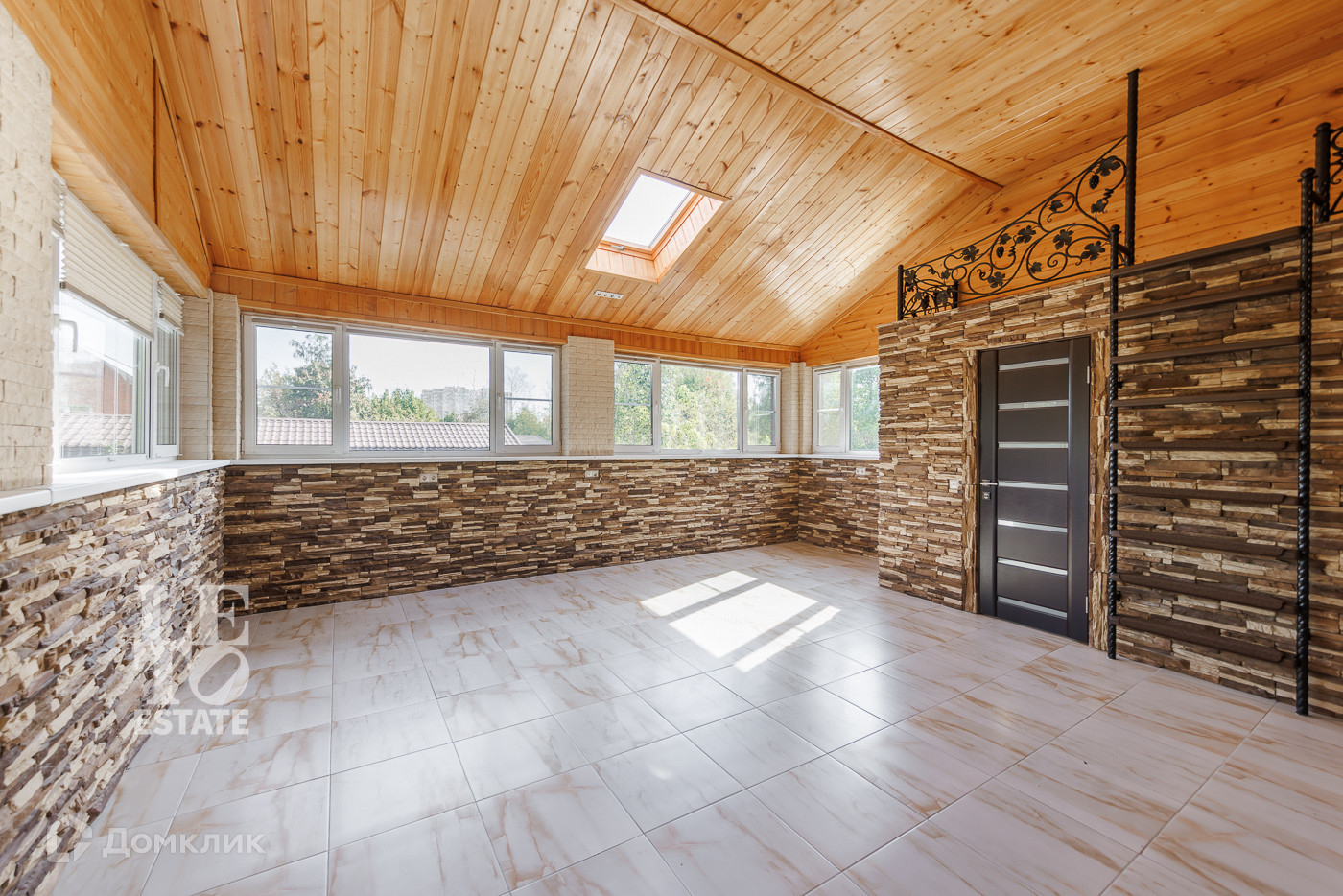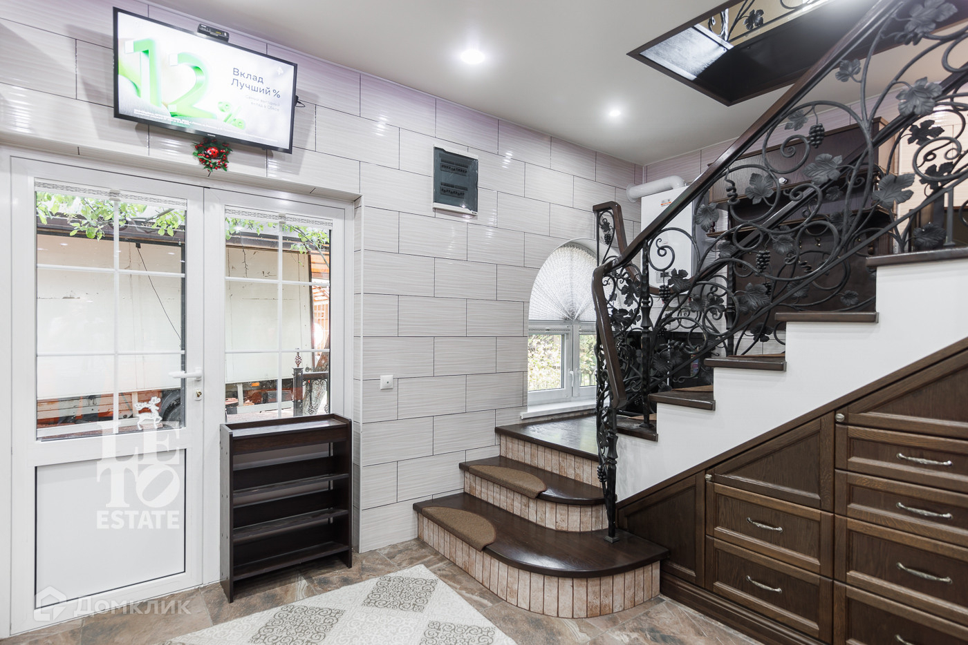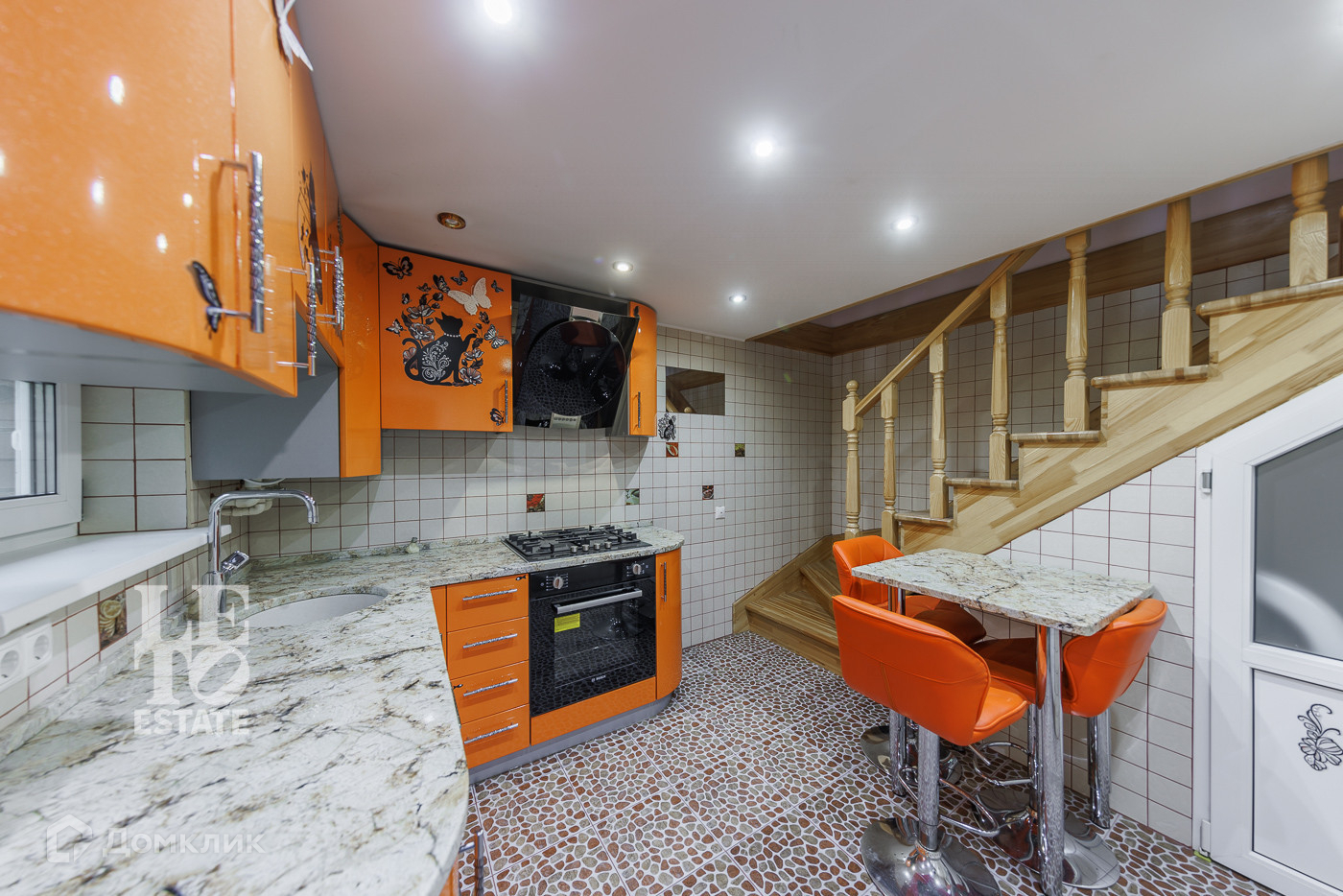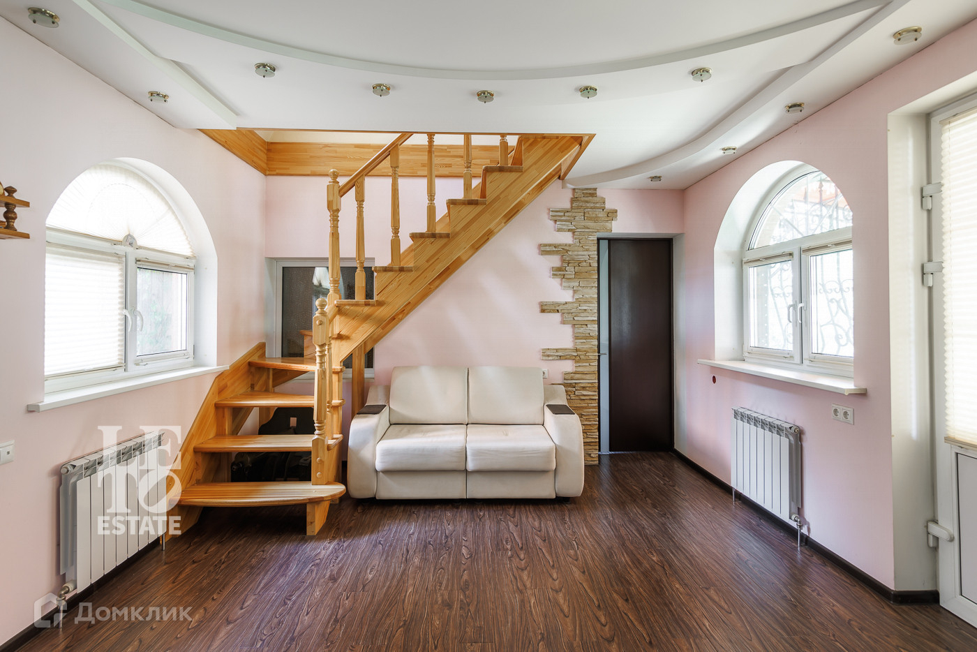 Конструкция фасада - газобетонные блоки (400 мм), слой теплоизоляции (120 мм), отделка облицовочным керамическим кирпичом (50 мм). Дом 144,9 кв.м. построен в стиле твунхауса и имеет два раздельных входа. В каждой части дома на первом этаже находится кухня и гостевой санузел. Деревянная лестница с двух сторон ведет на второй и третий этажи дома.