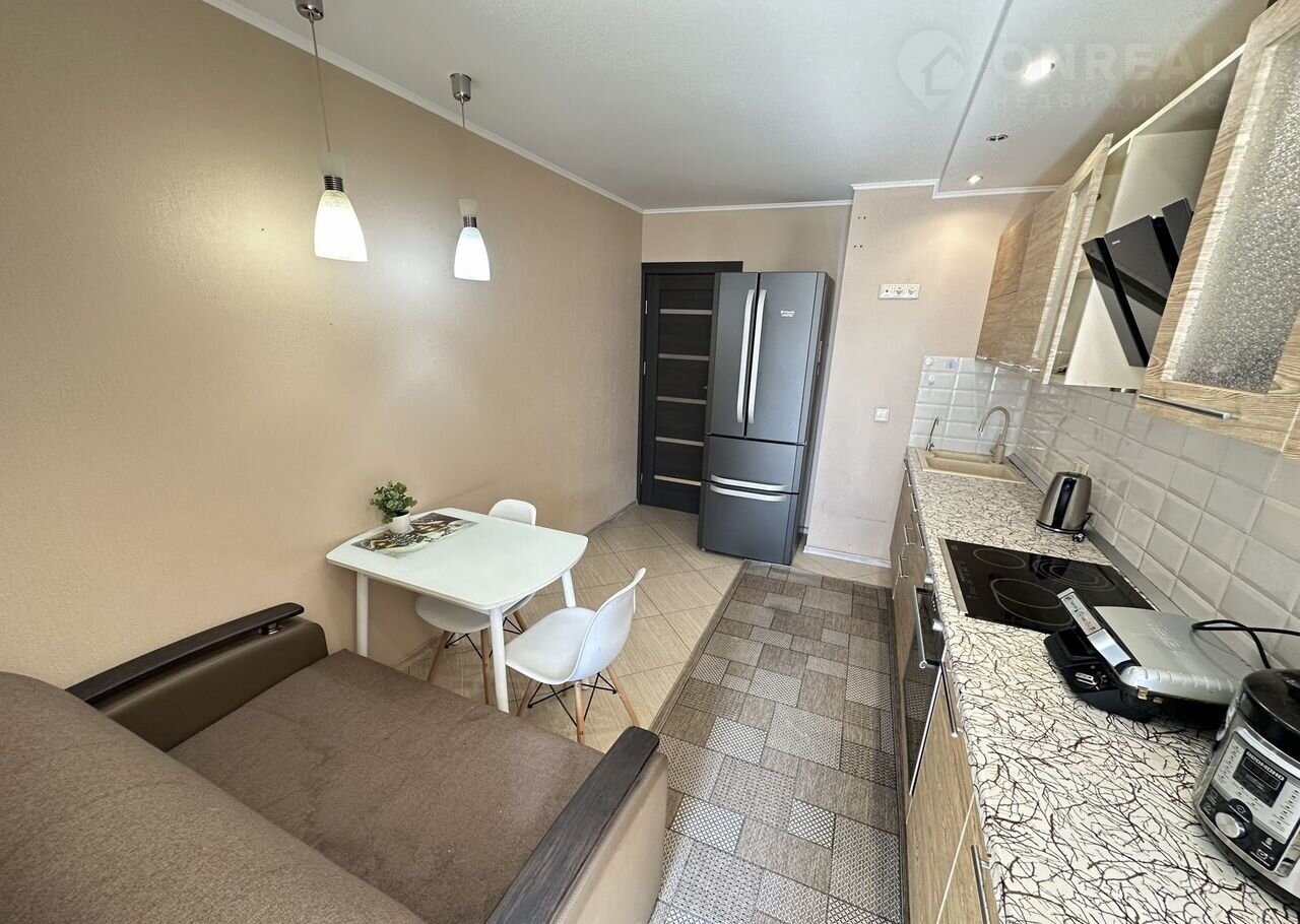Полностью оборудованная кухня со встроенным вместительным гарнитуром и встроенной бытовой техникой (варочная панель, духовой шкаф, вытяжка, посудомоечная машина), холодильник.