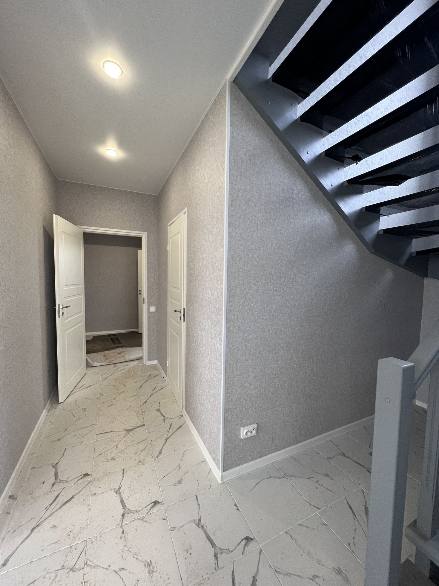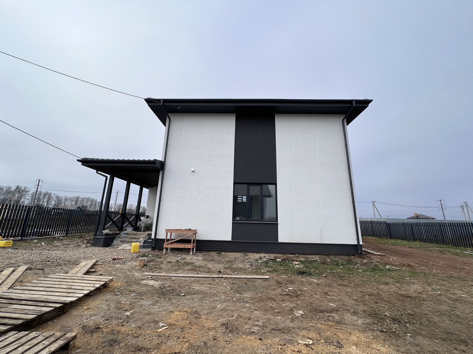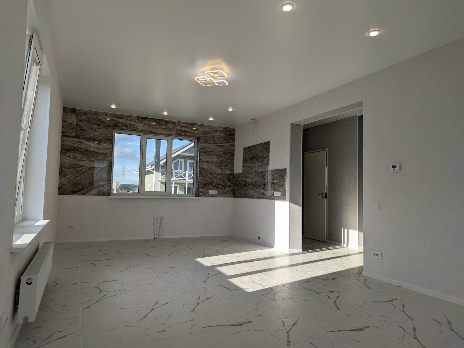 Дом с полной отделкой: обои, натяжные потолки, трехзонное освещение гостиной, точечные светильники, люстры, вся необходимая сантехника, плитка (керамогранит) в сан.узлах.
