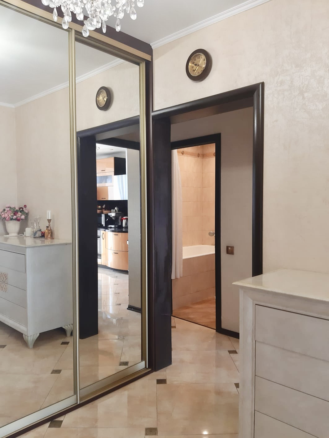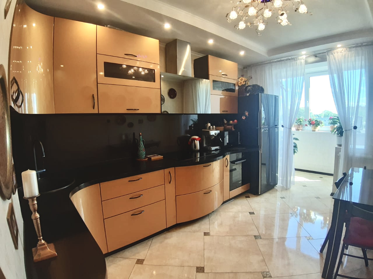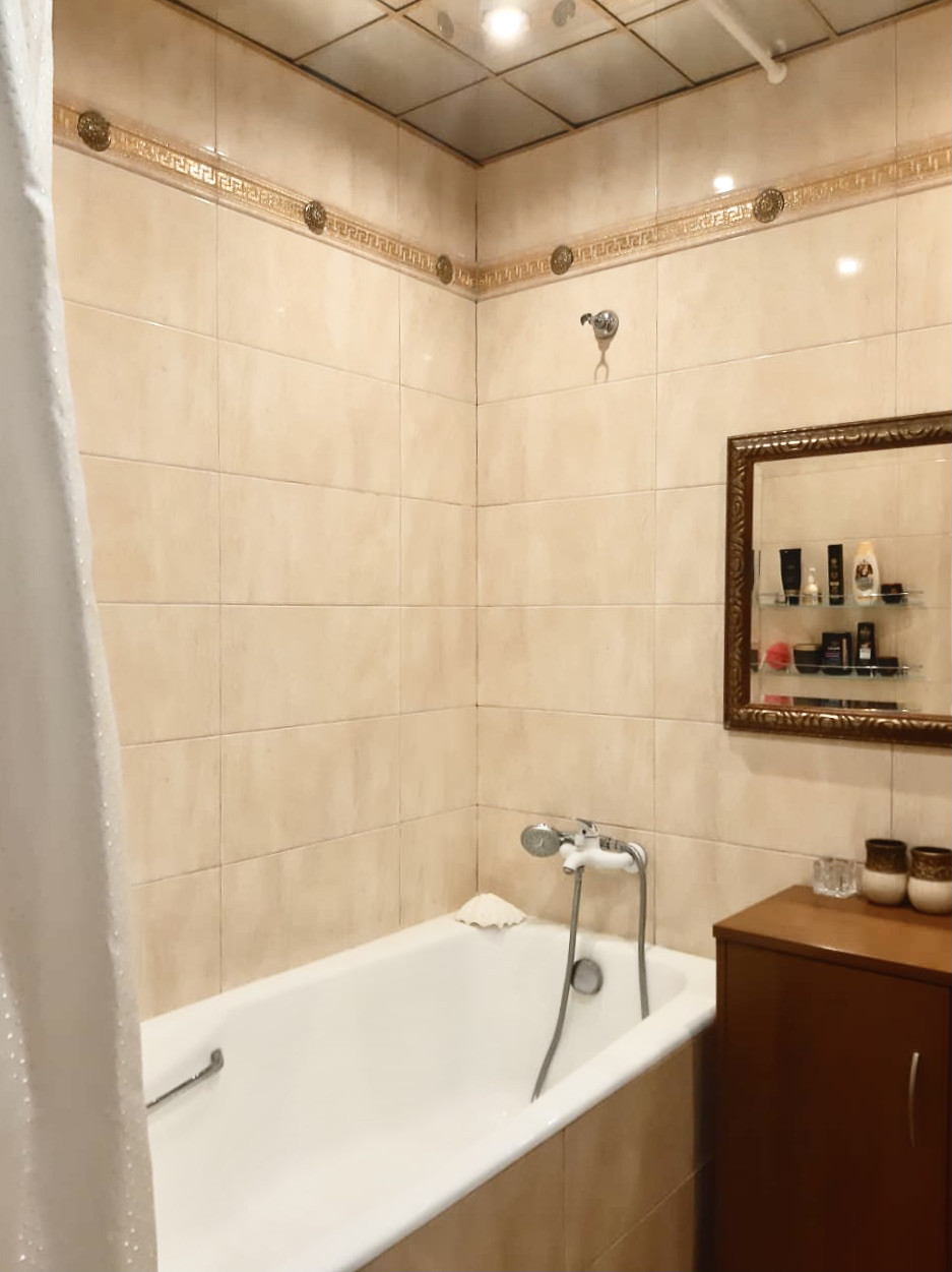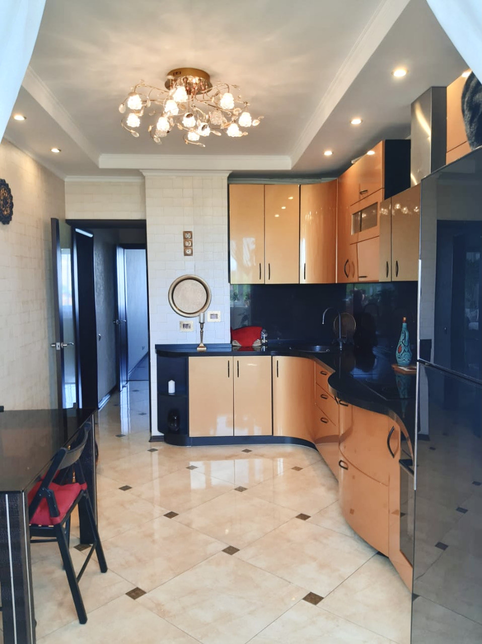 Современный и качественный ремонт квартиры. Можно въехать и жить. Из окон можно наслаждаться и восходами, и закатами. Просторная и теплая квартира, остается встроенная мебель, включая стильную сияющую золотистую кухню, оборудованную бытовой техникой. Пол с подогревом на кухне. Есть кондиционер. Всё в отличном состоянии. Гостиную 20 кв.м украшает эркер, лоджия из кухни, изолированная спальня, большой коридор, есть гардеробная, сан.узел с зеркальным потолком.