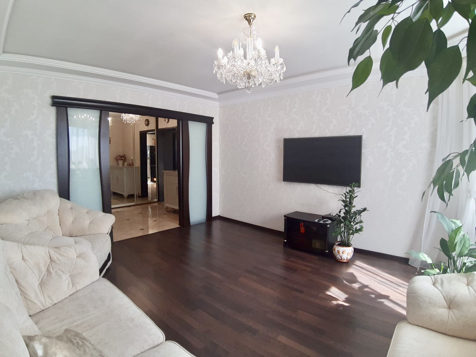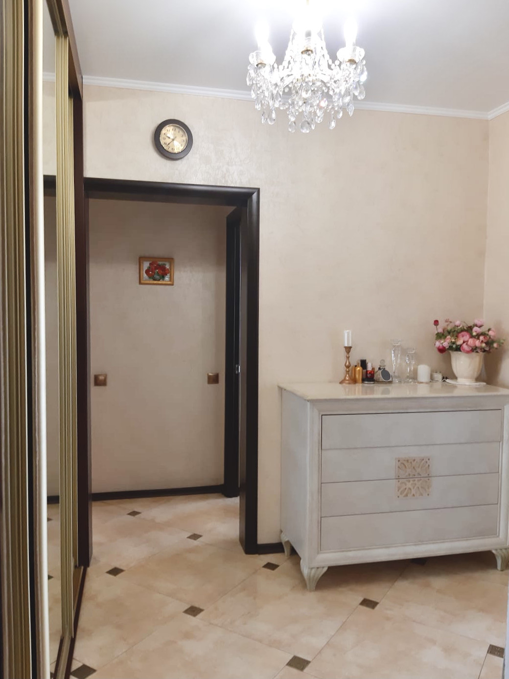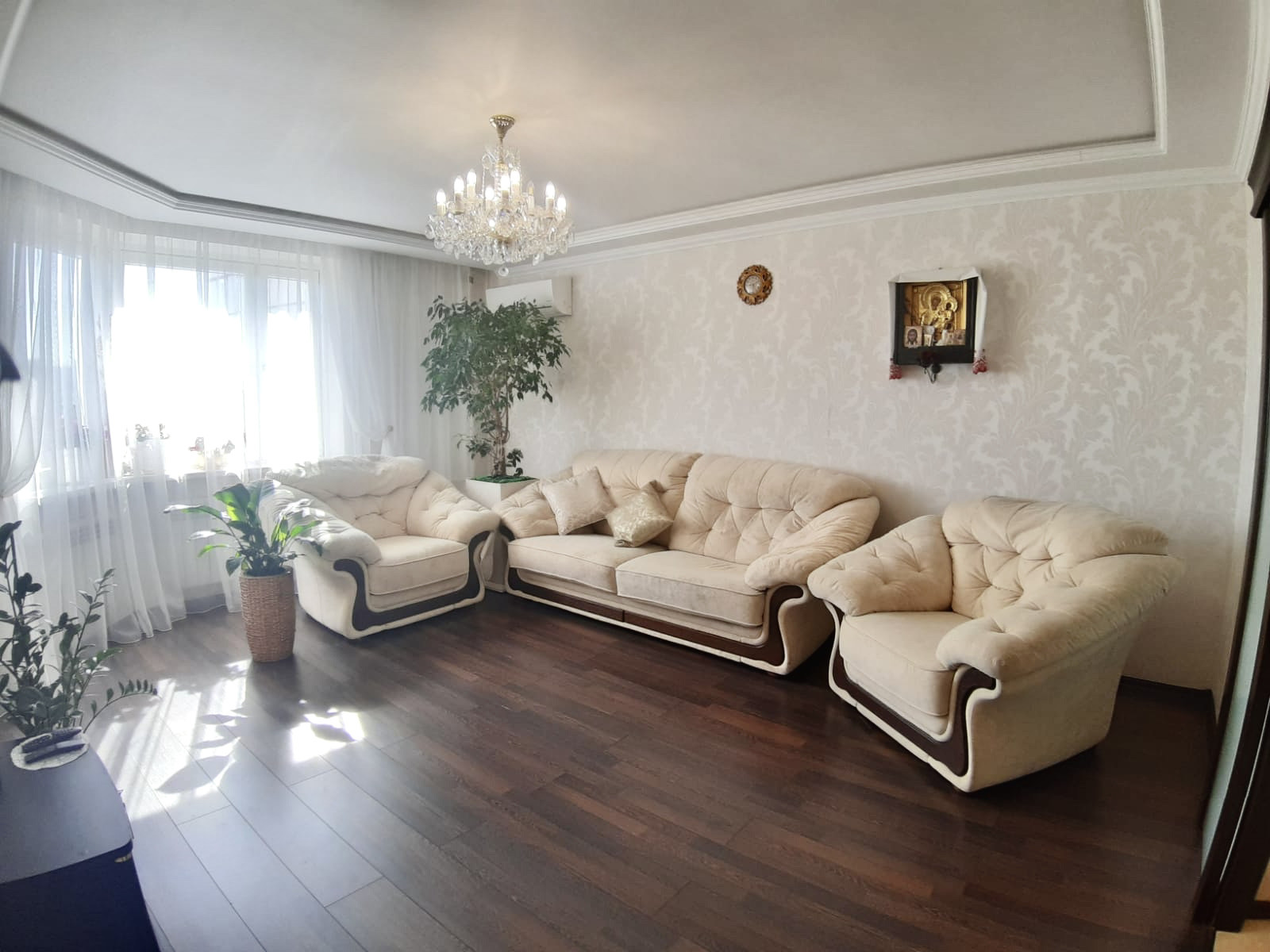 Современный и качественный ремонт квартиры. Можно въехать и жить. Из окон можно наслаждаться и восходами, и закатами. Просторная и теплая квартира, остается встроенная мебель, включая стильную сияющую золотистую кухню, оборудованную бытовой техникой. Пол с подогревом на кухне. Есть кондиционер. Всё в отличном состоянии. Гостиную 20 кв.м украшает эркер, лоджия из кухни, изолированная спальня, большой коридор, есть гардеробная, сан.узел с зеркальным потолком.