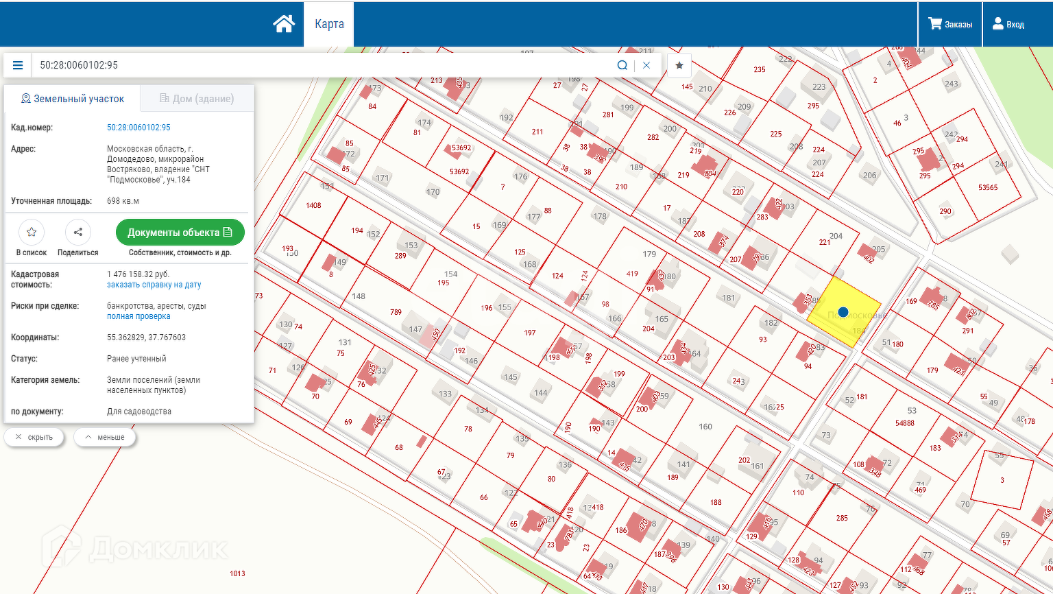 Участок в СНТ, 6.98 сот. на продажу в Домодедово, СНТ Подмосковье, 184