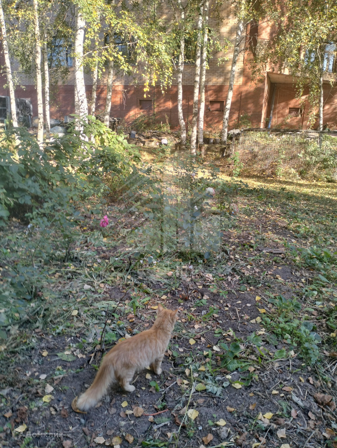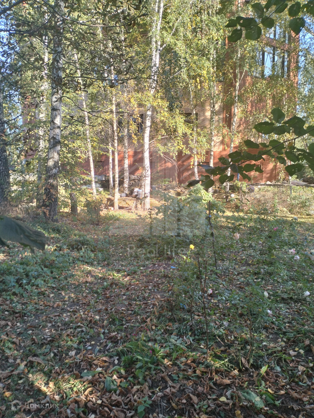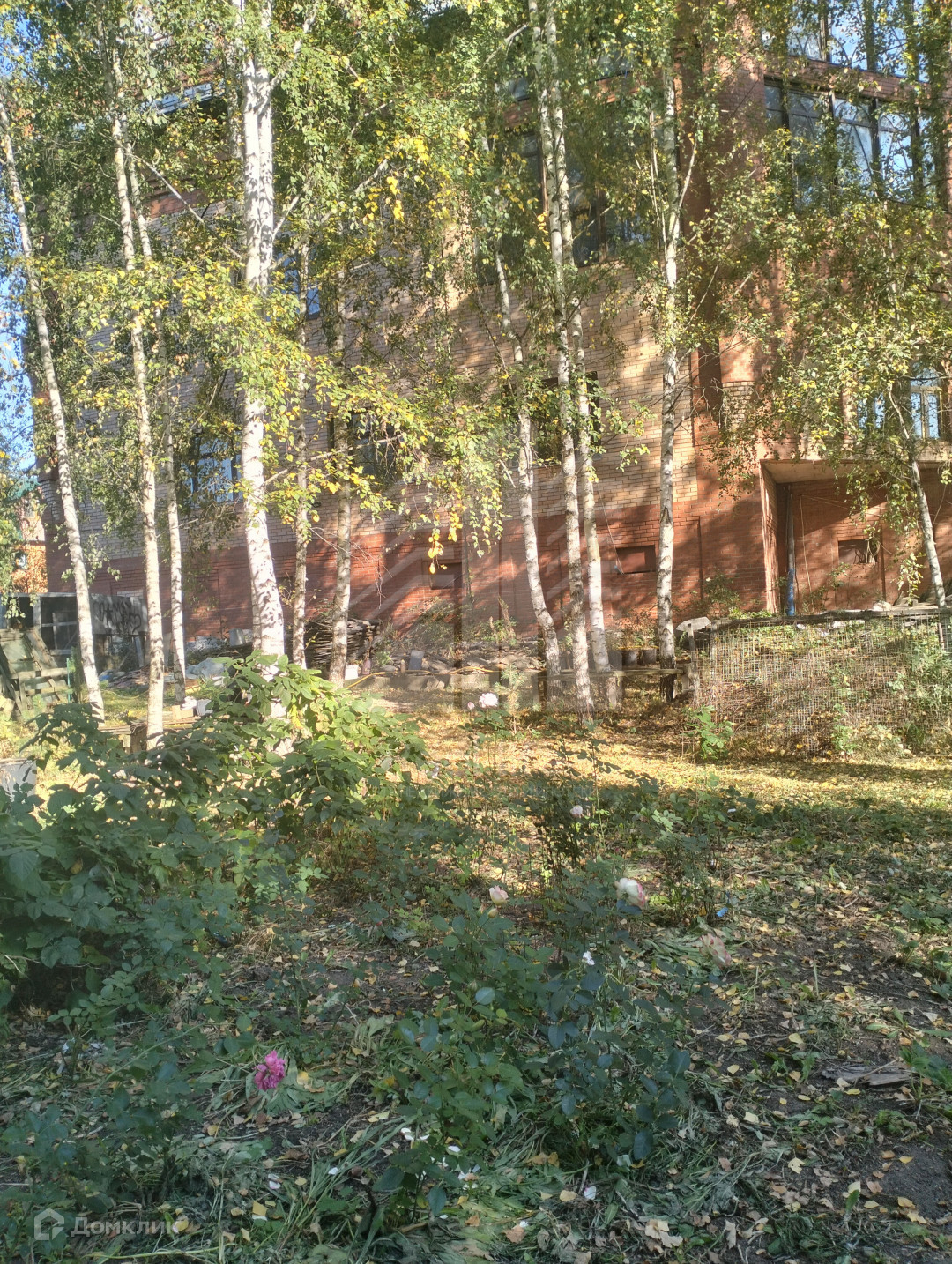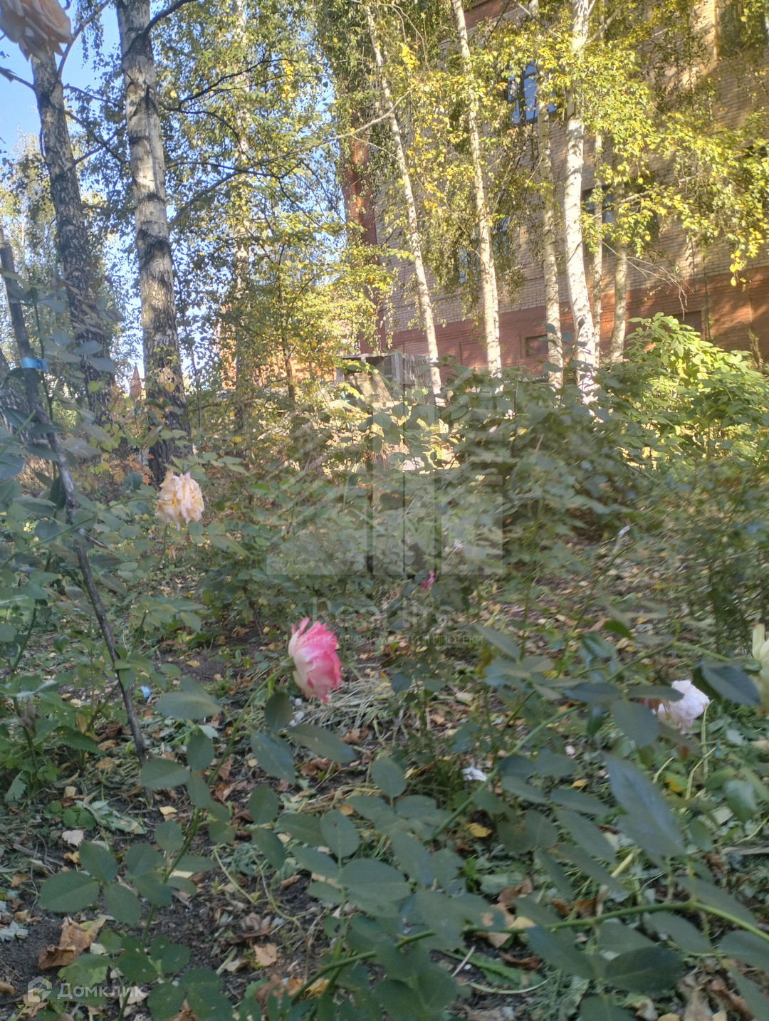 На участке растут березы, плодовые деревья, розы.