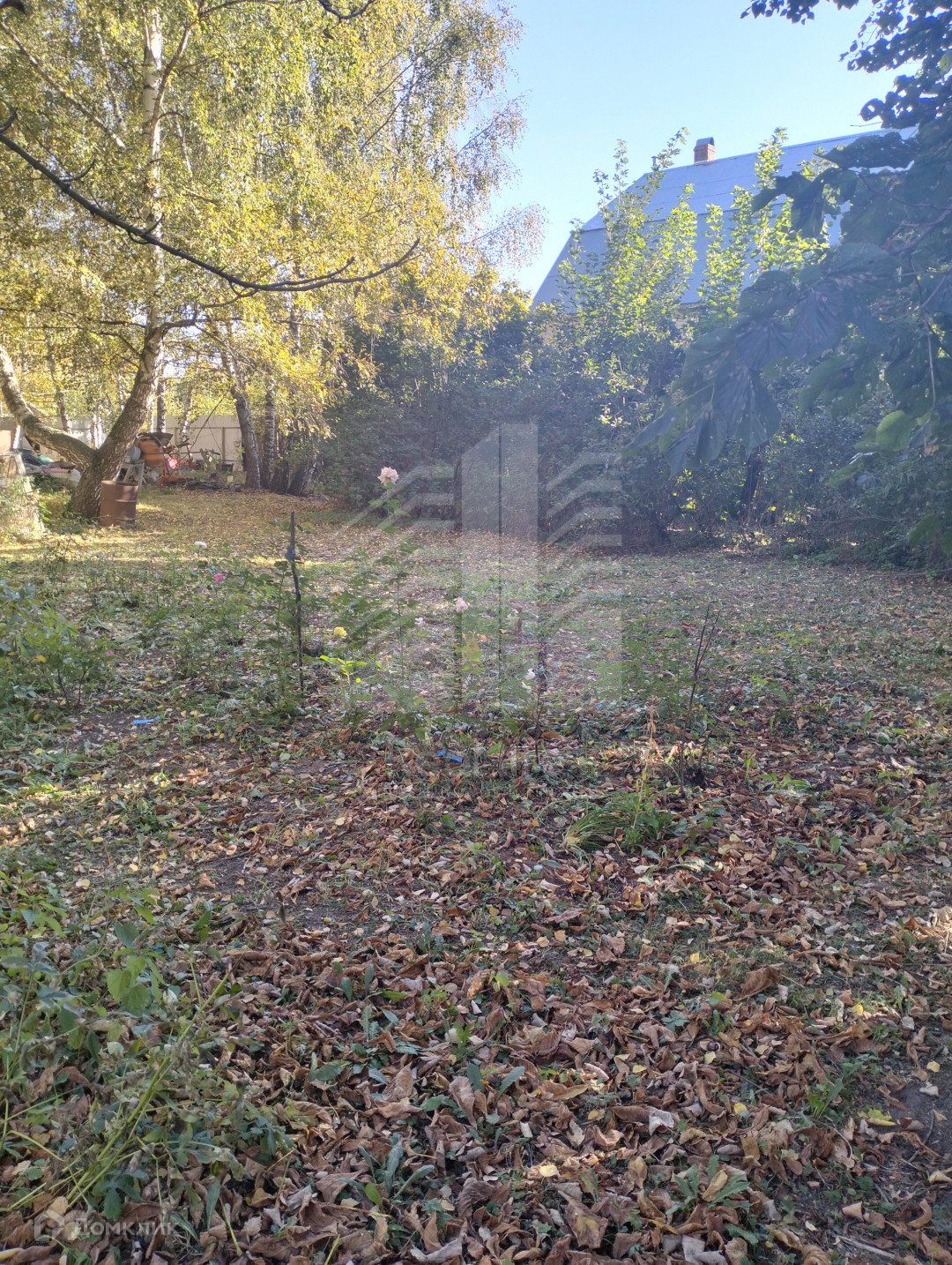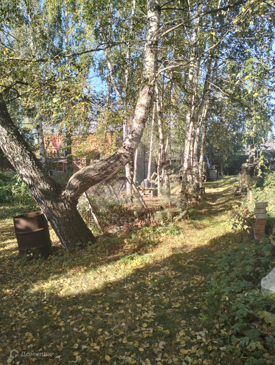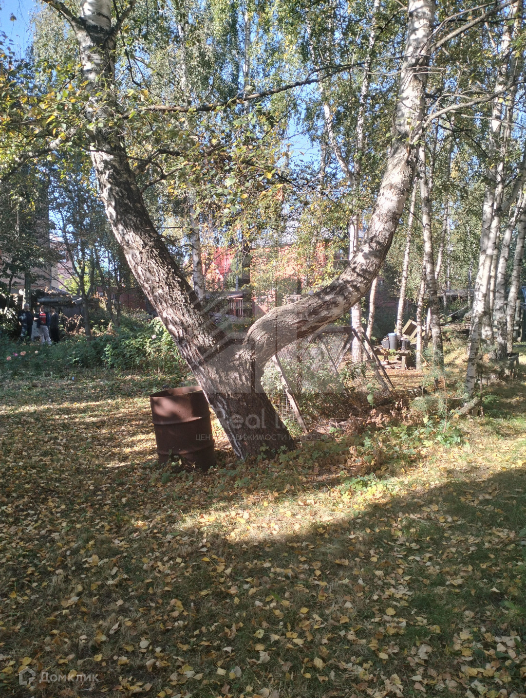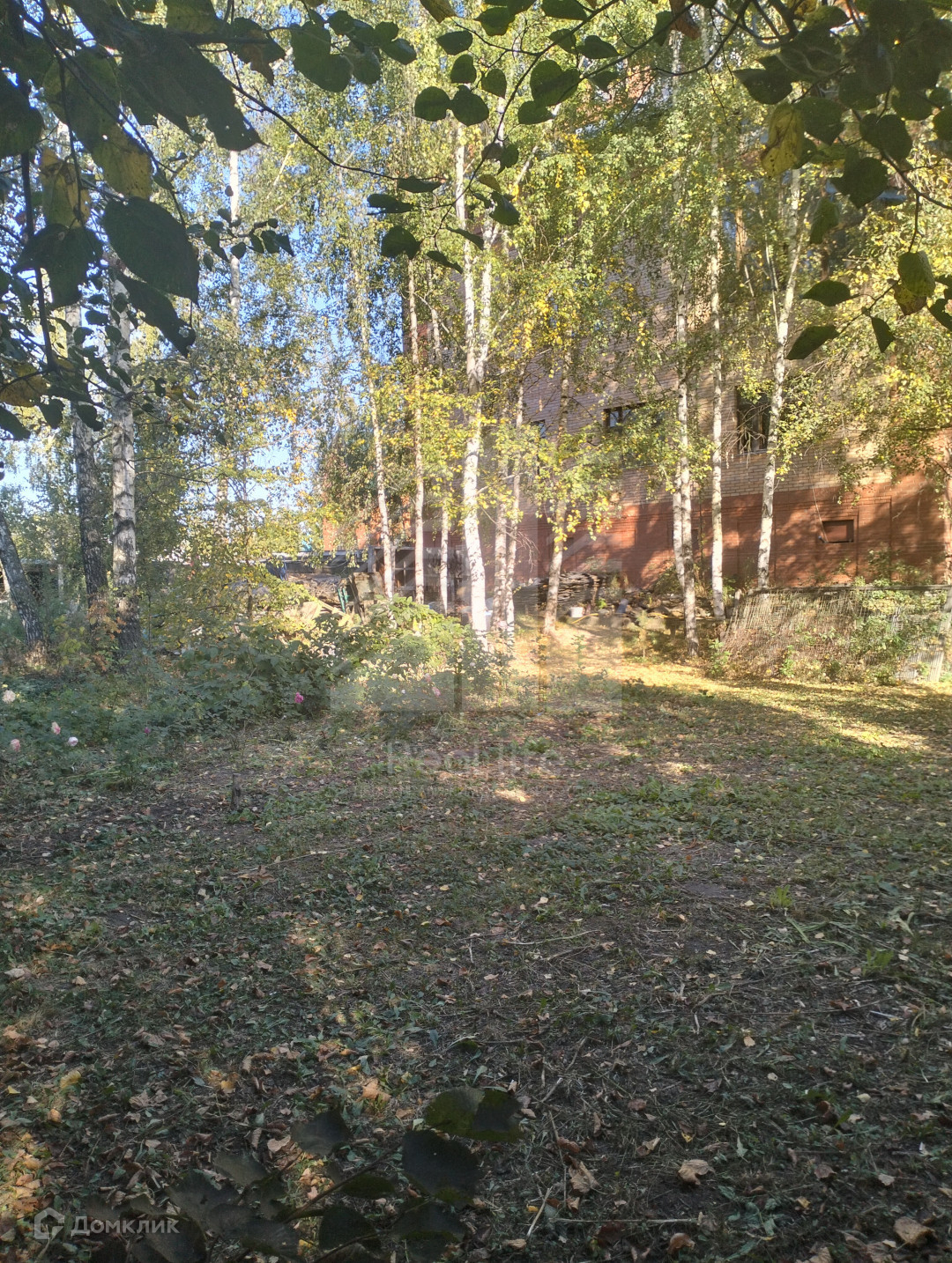 На участке растут березы, плодовые деревья, розы.