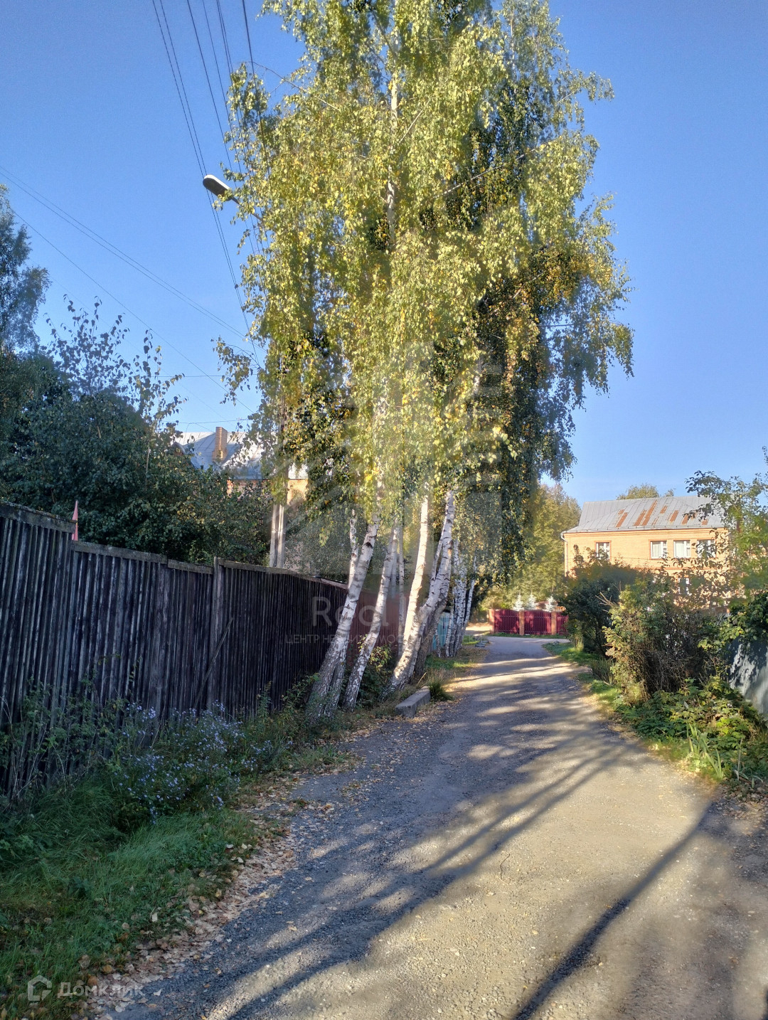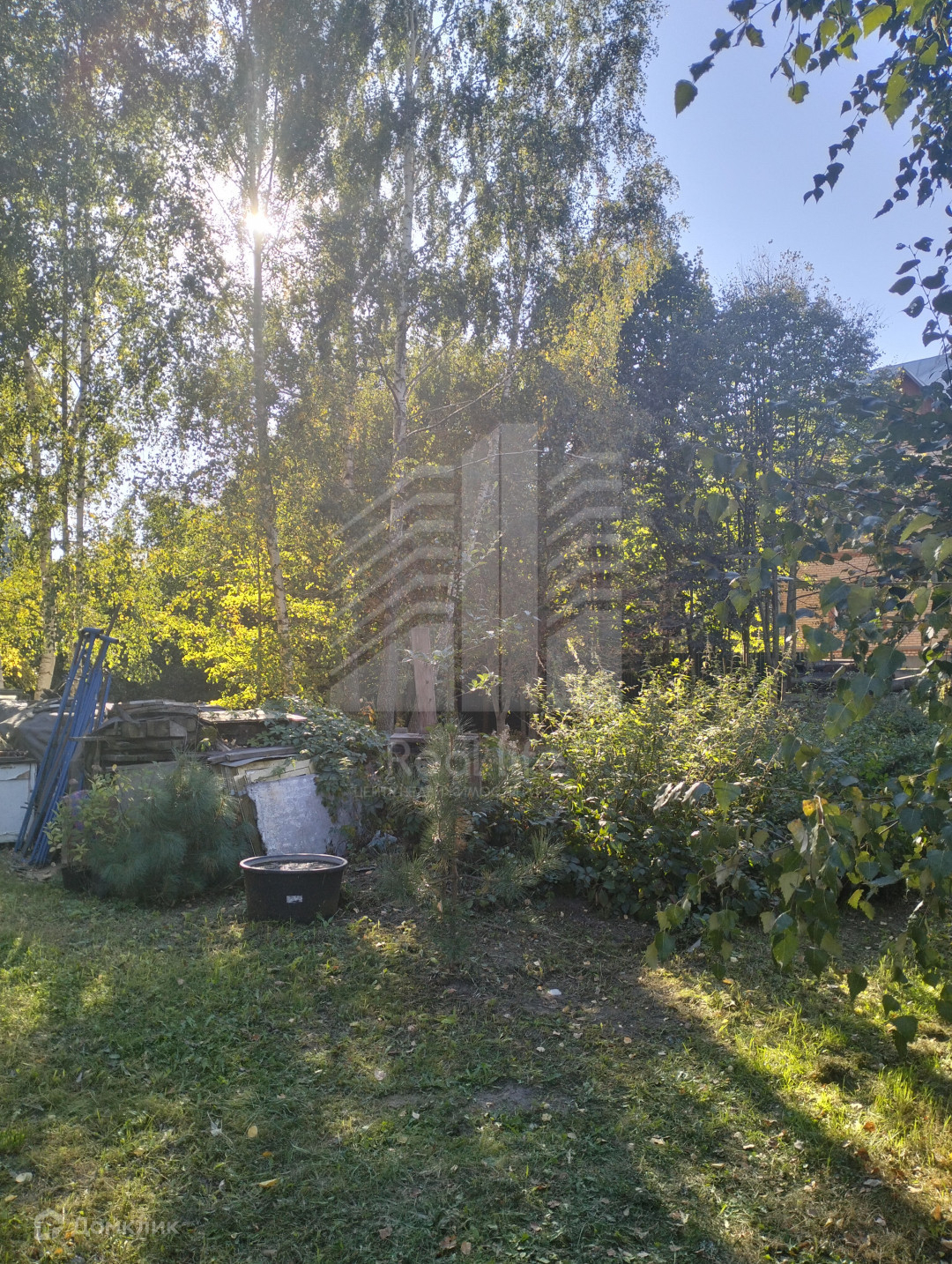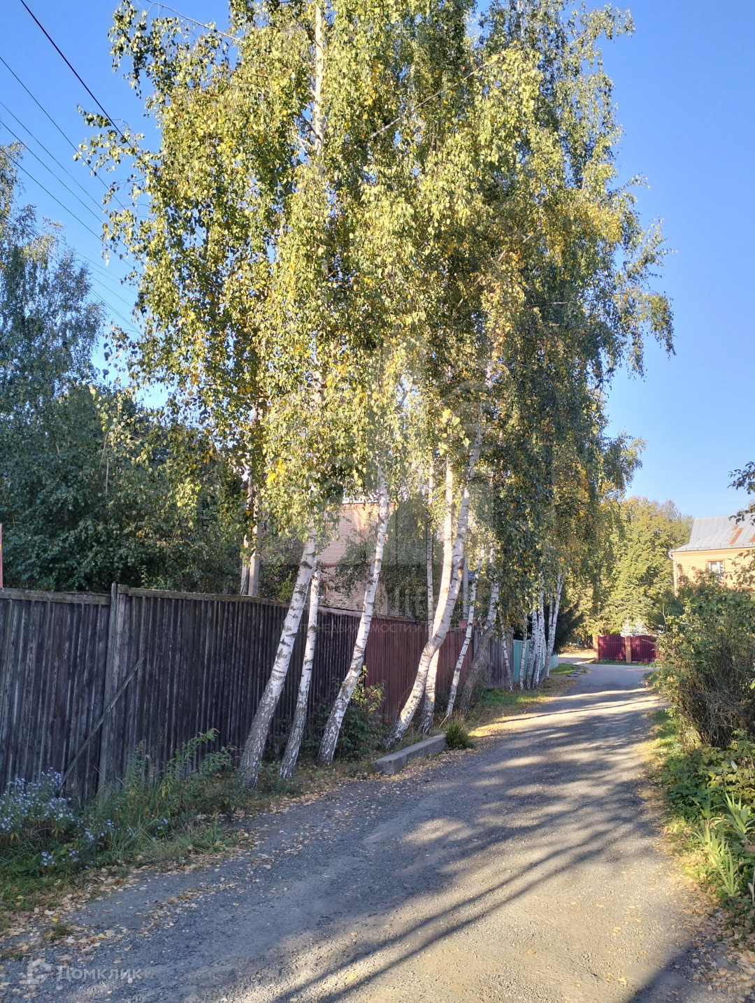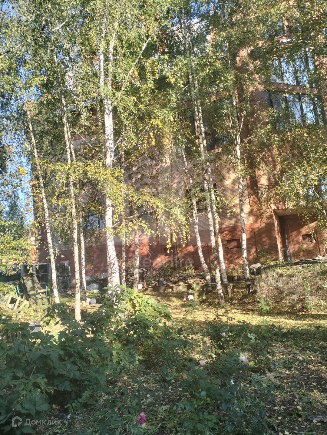 На участке растут березы, плодовые деревья, розы.