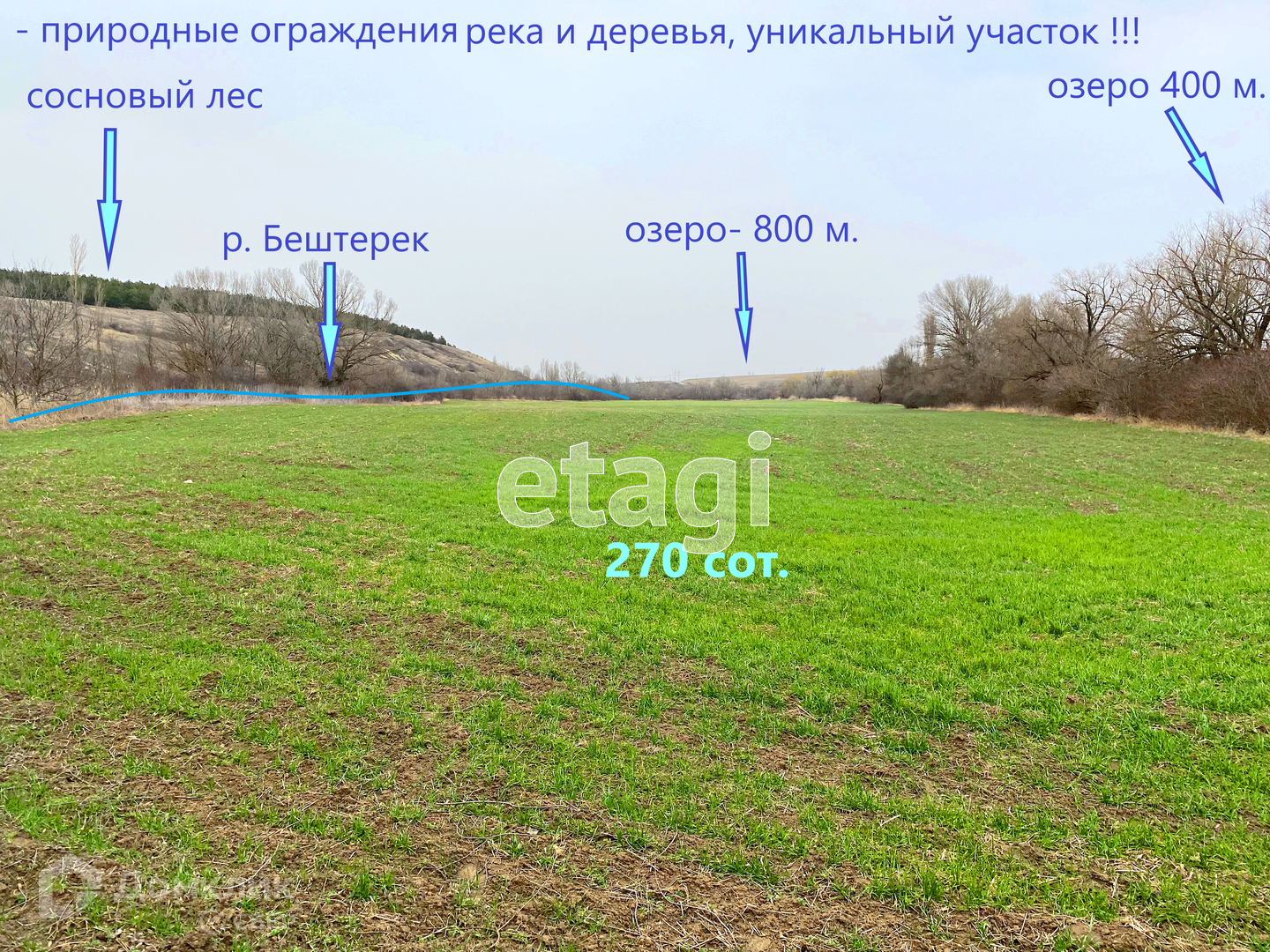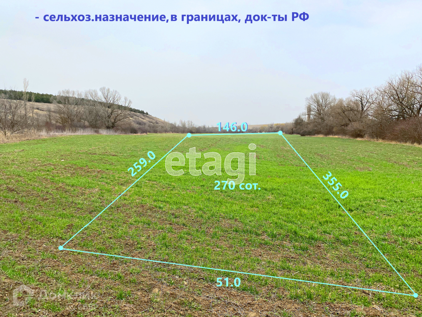 Площадь участка 270 сот., уточненная, земли сельхоз.назначения, при регистрации КФХ, разрешено строительство жил.домов и др.строений до 25% застройки от общей площади ЗУ, документы РФ, к сделке готовы.