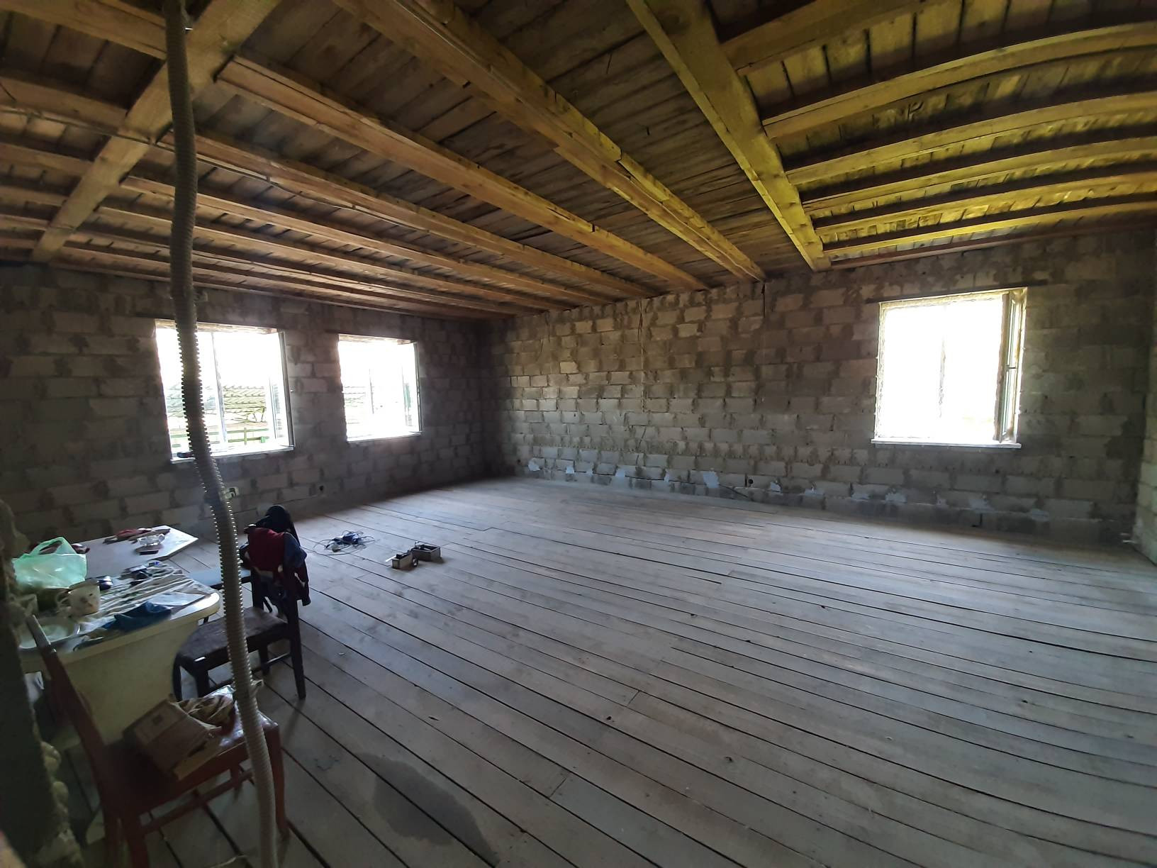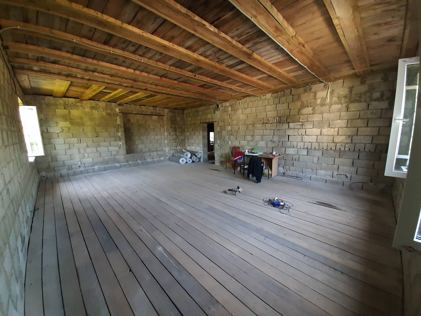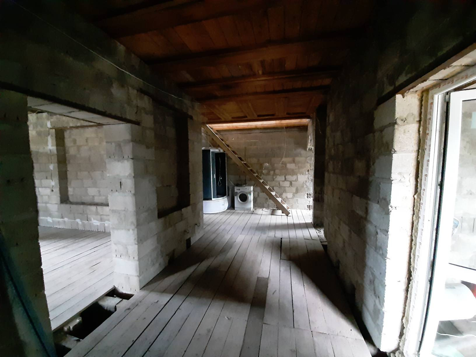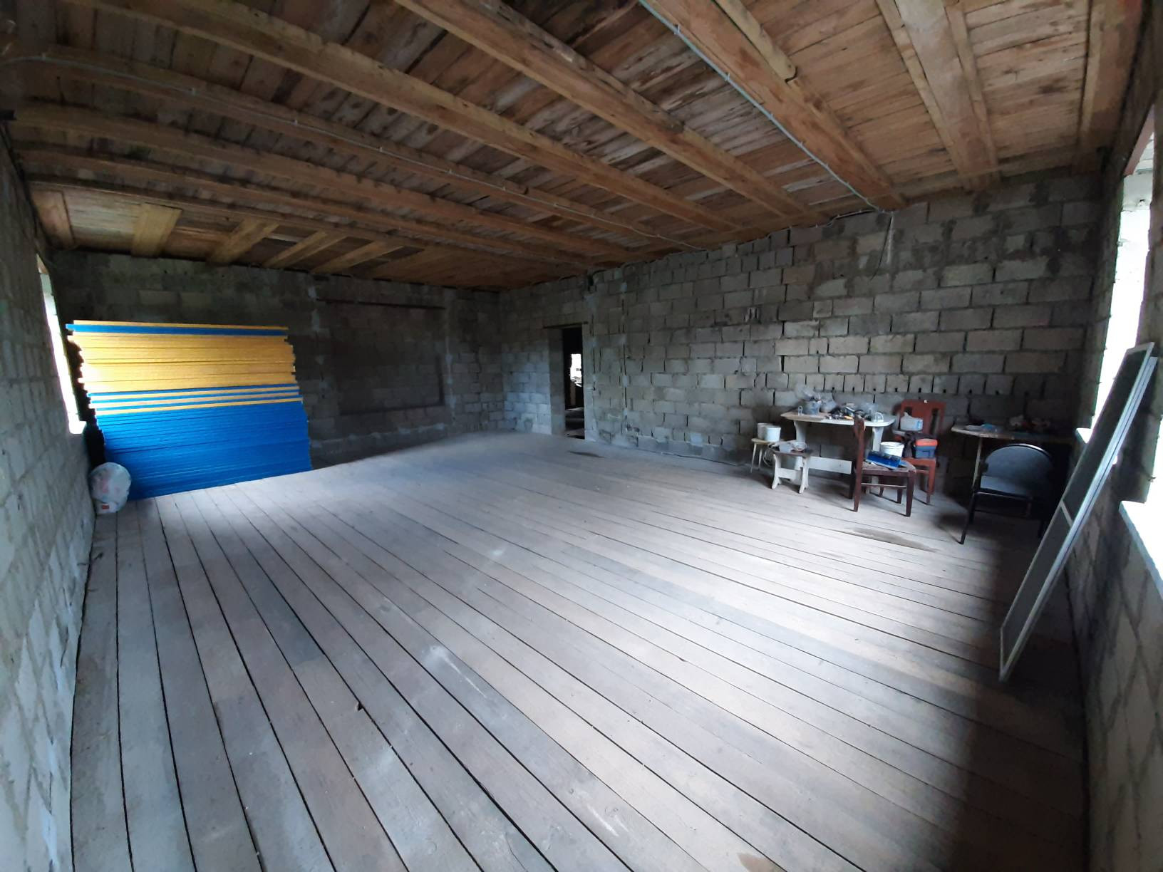 Дверь на террасу и все окна пластиковые. Входная дверь металлическая. Полы дерево. Крыша утеплена и подшита. Начата обшивка стен внутри.