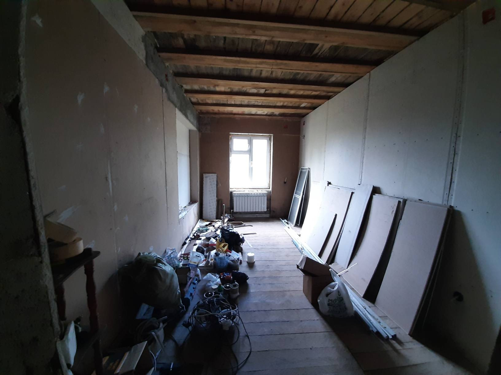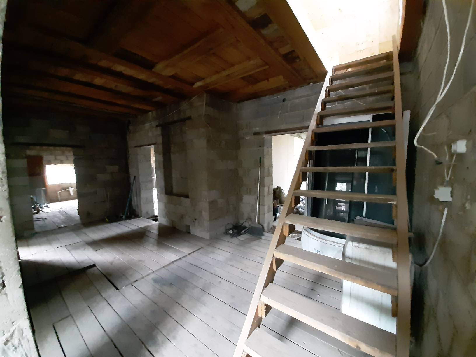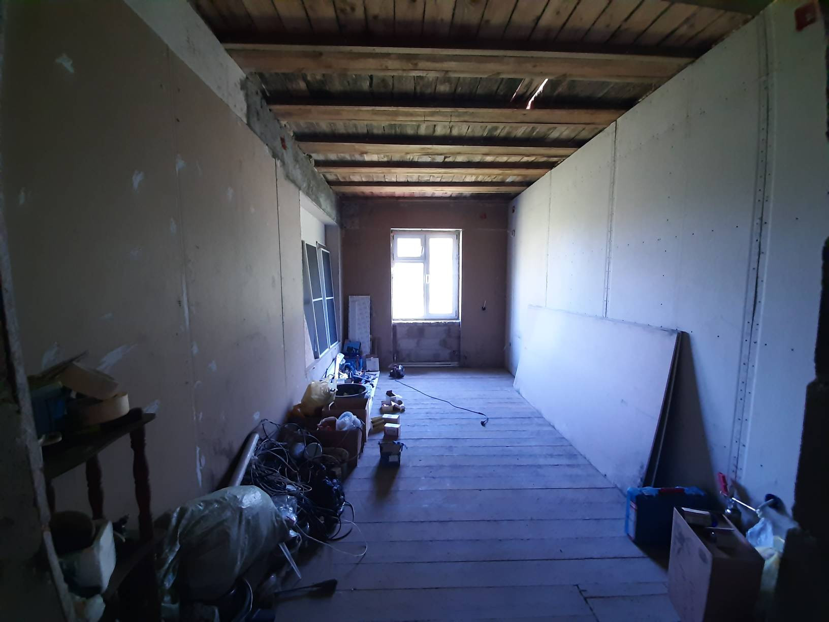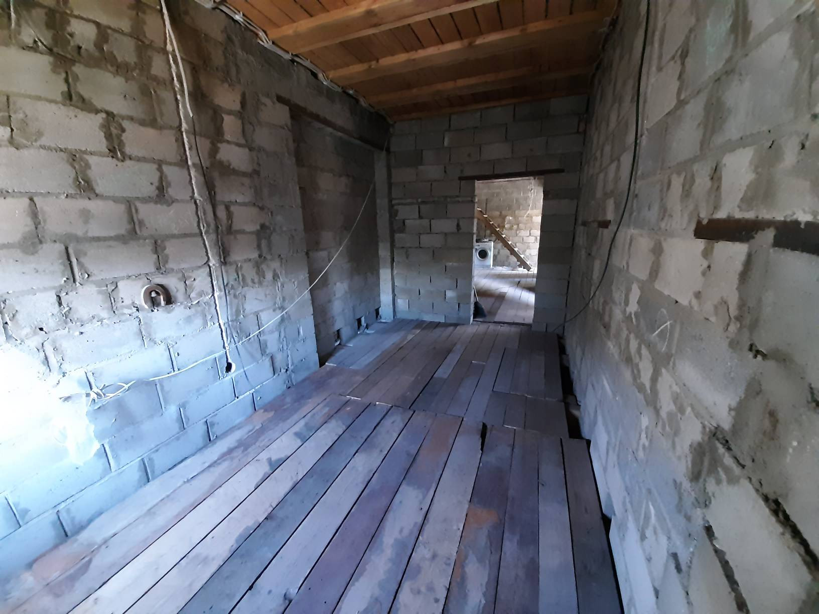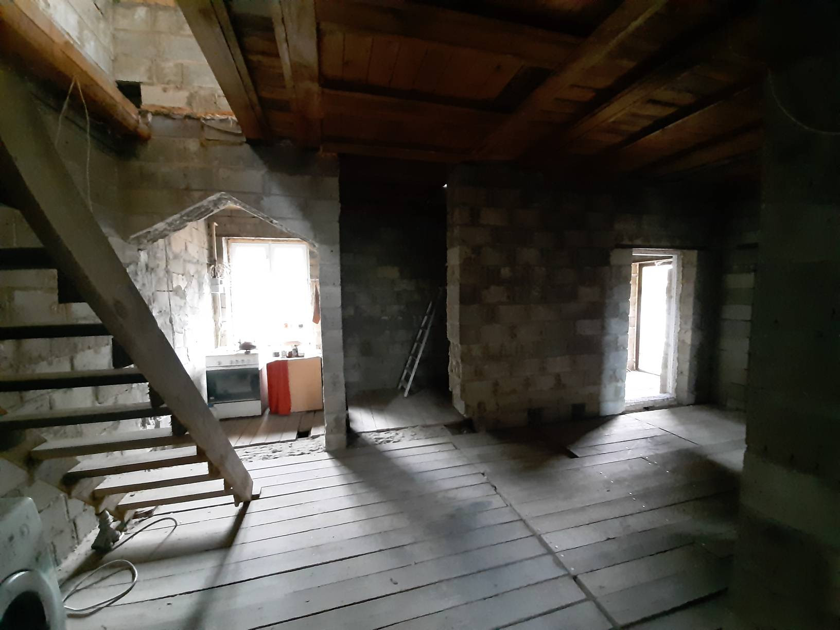 Дверь на террасу и все окна пластиковые. Входная дверь металлическая. Полы дерево. Крыша утеплена и подшита. Начата обшивка стен внутри.