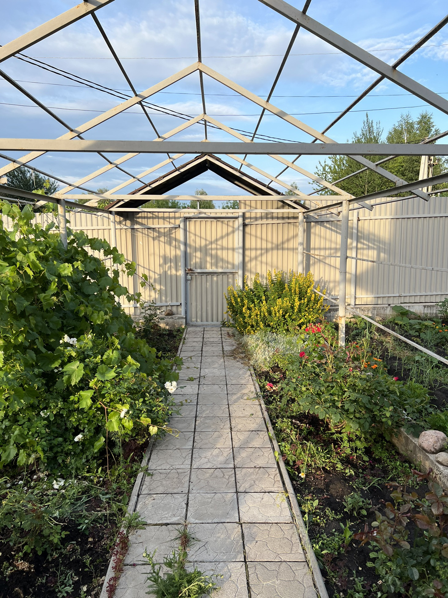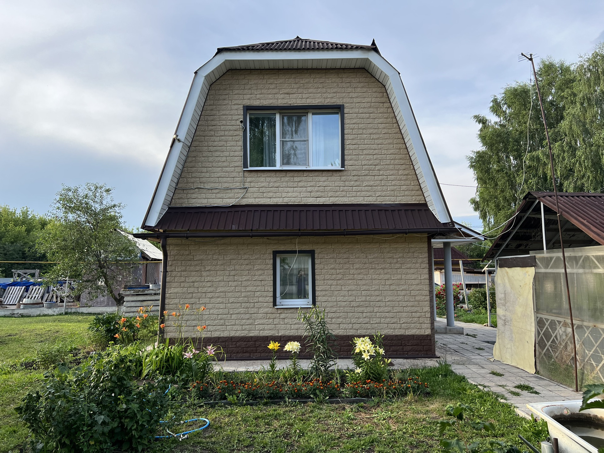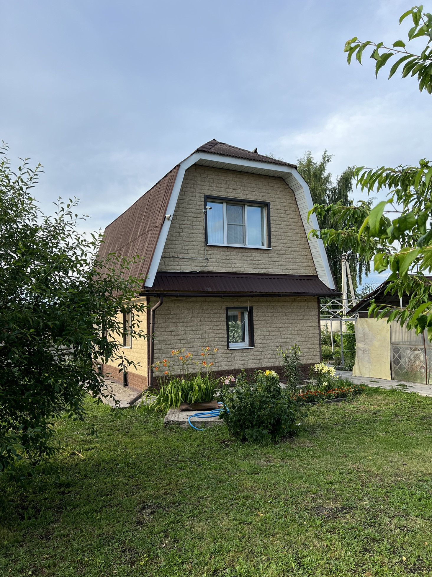 - гараж из монолитного ж/б размером 6*12 м, ворота высотой 3 м, над гаражом есть мансардный этаж, который при желании можно обустроить под зону отдыха. Кровля – ондулин.