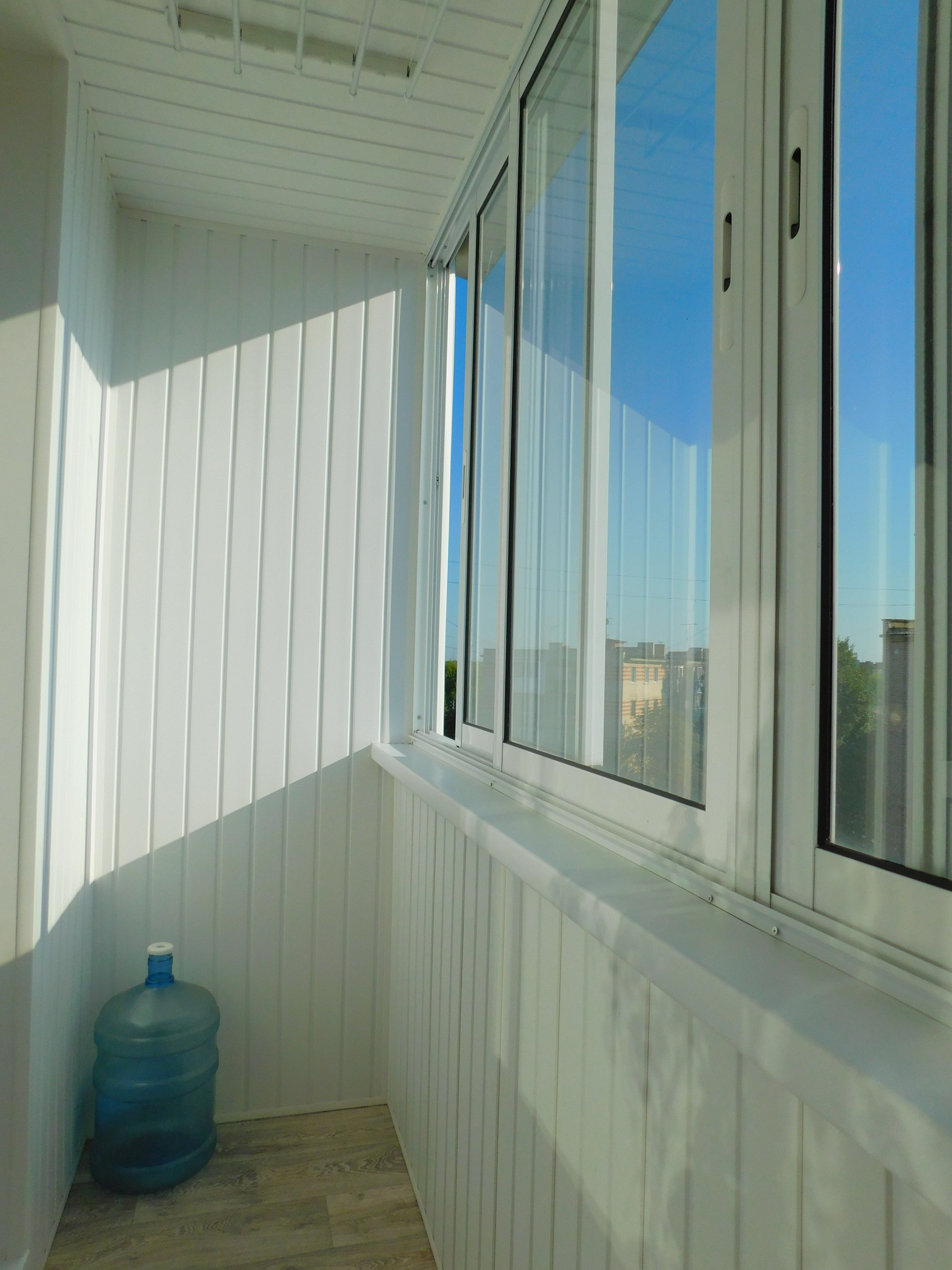 Балкон остеклен пластиковыми стеклопакетами (с отделкой).