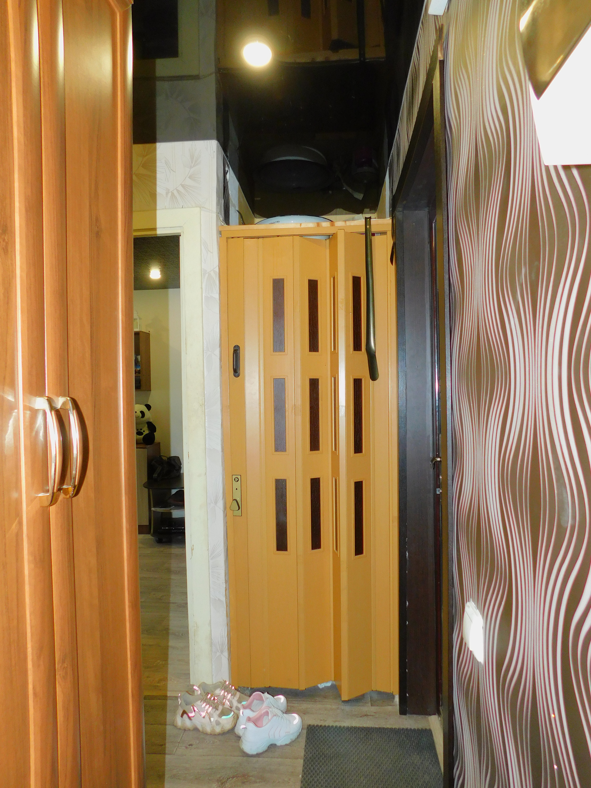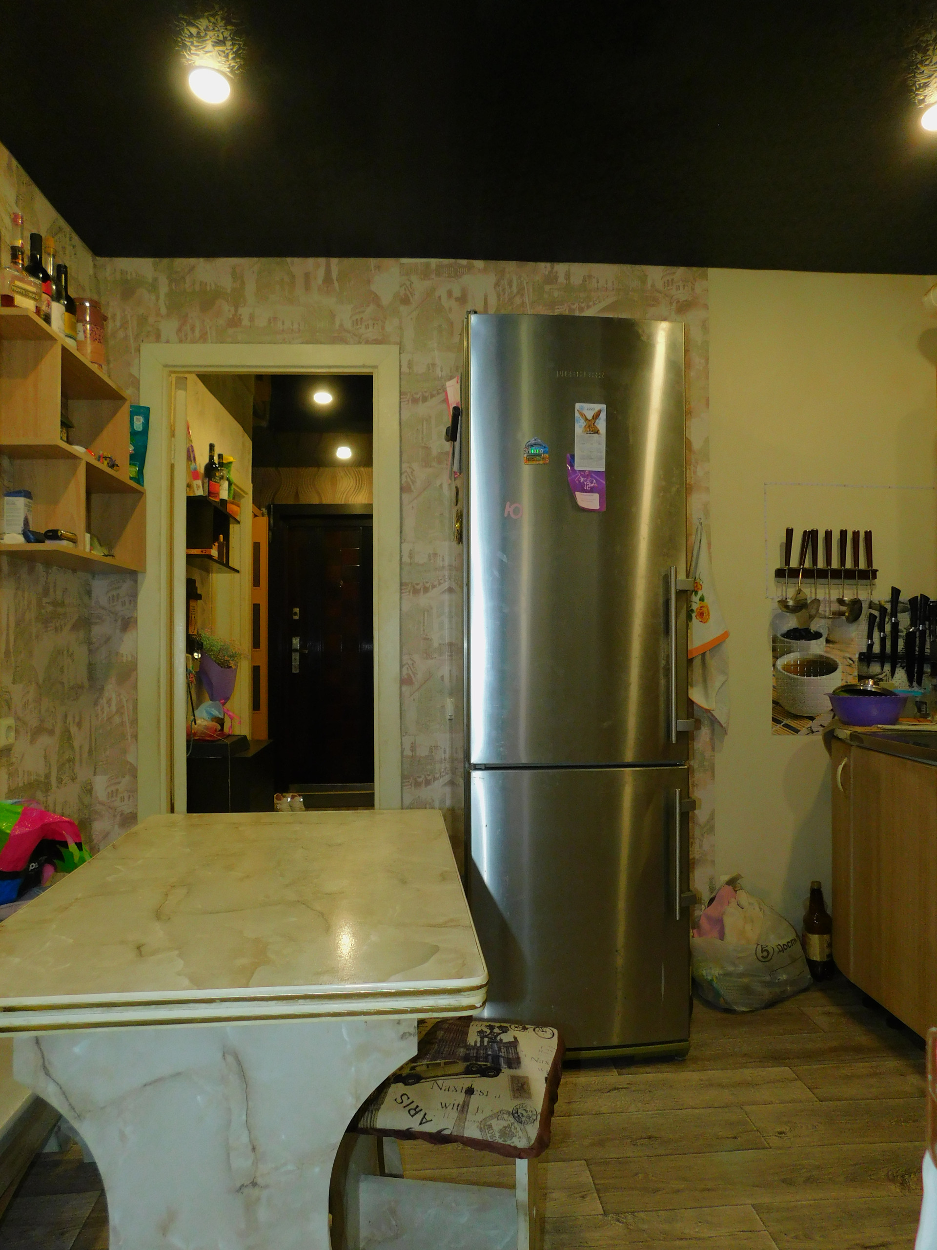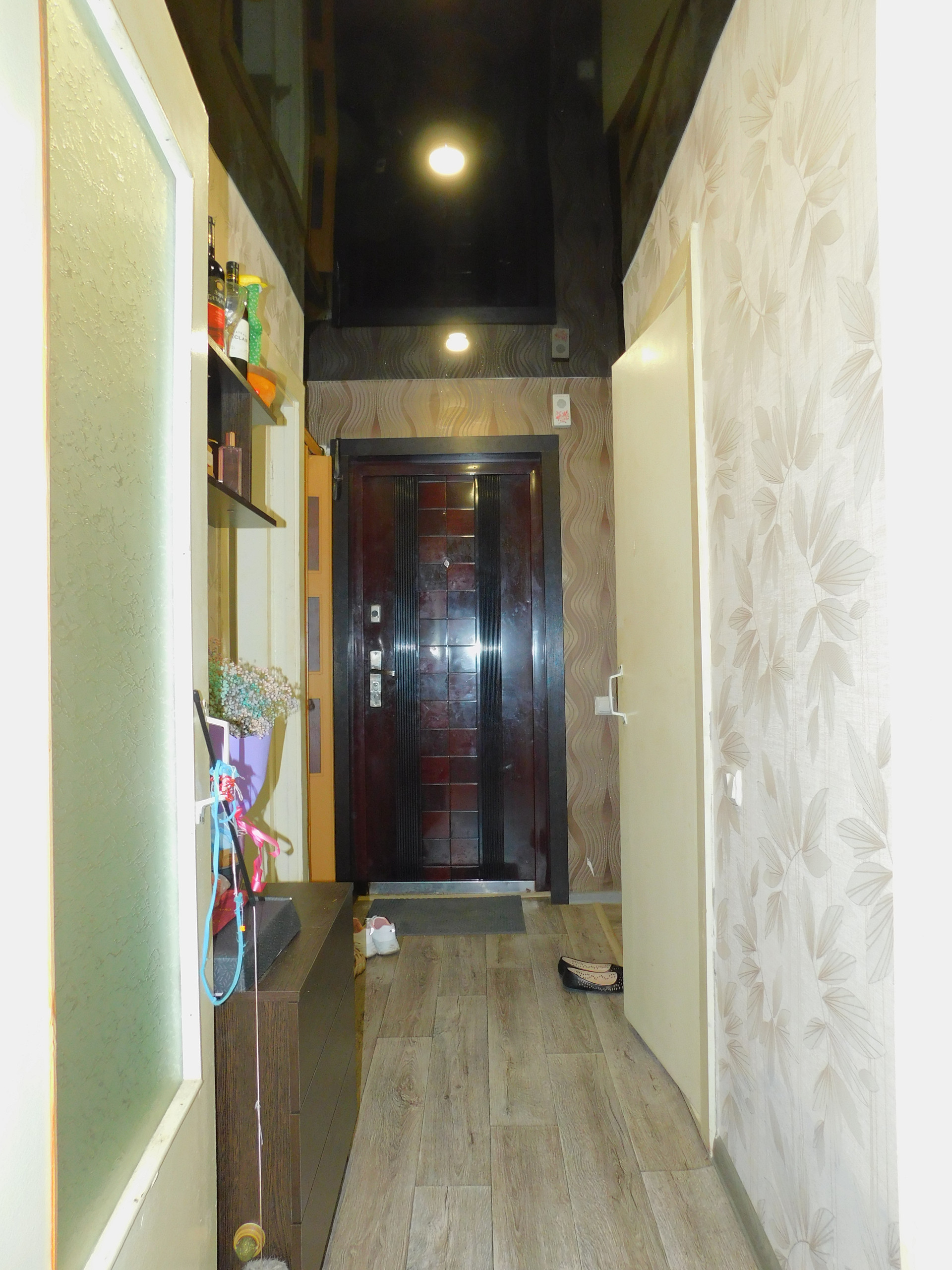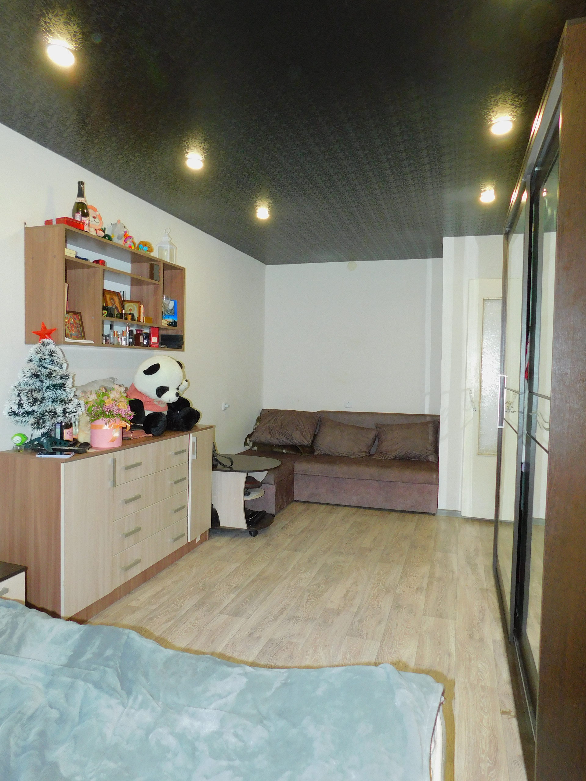 Потолки натяжные с точечными светильниками во всей квартире.