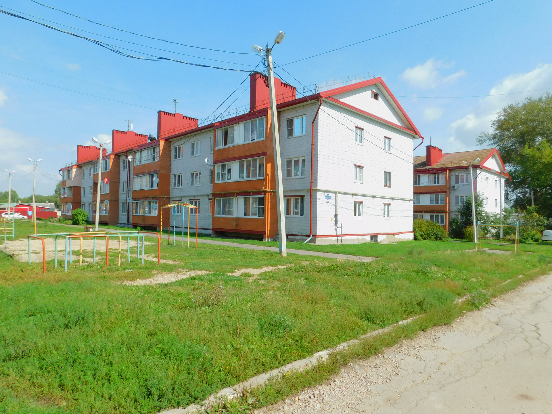 Двор с местами для парковки, новыми асфальтированными дорожками и детской площадкой